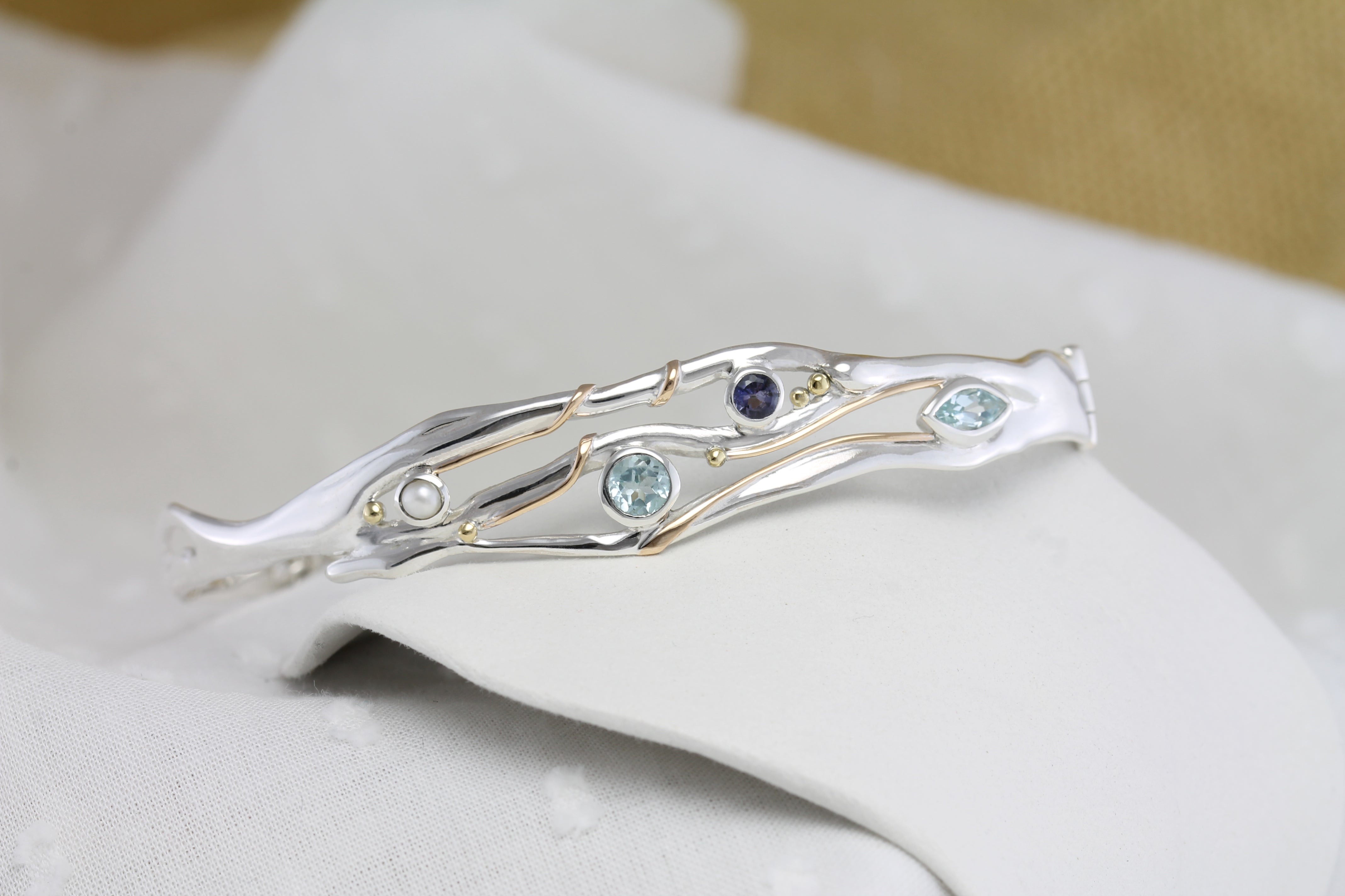 Handcrafted in Sterling Silver, this elegant bracelet showcases Blue Topaz, Iolite and Freshwater Pearl.