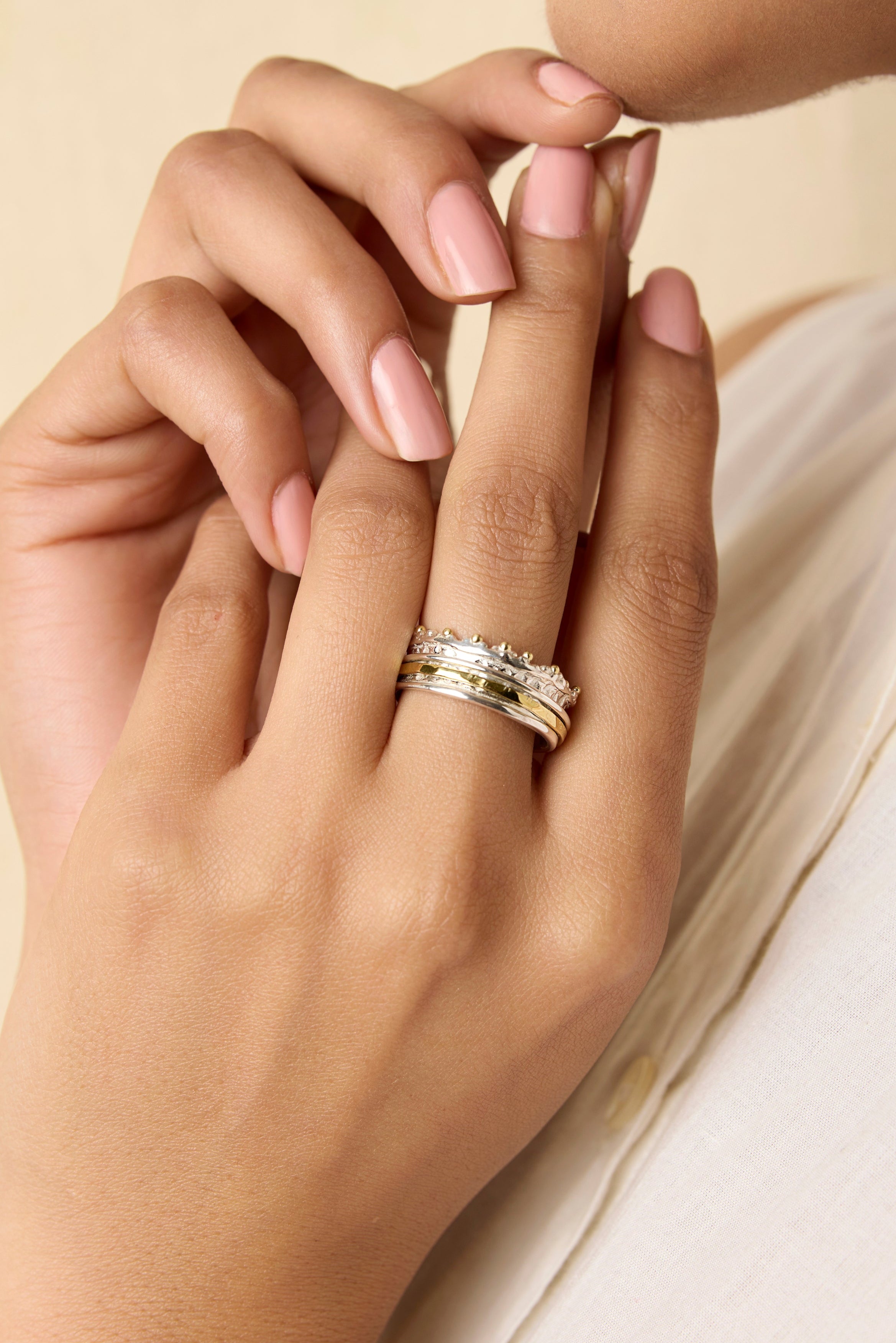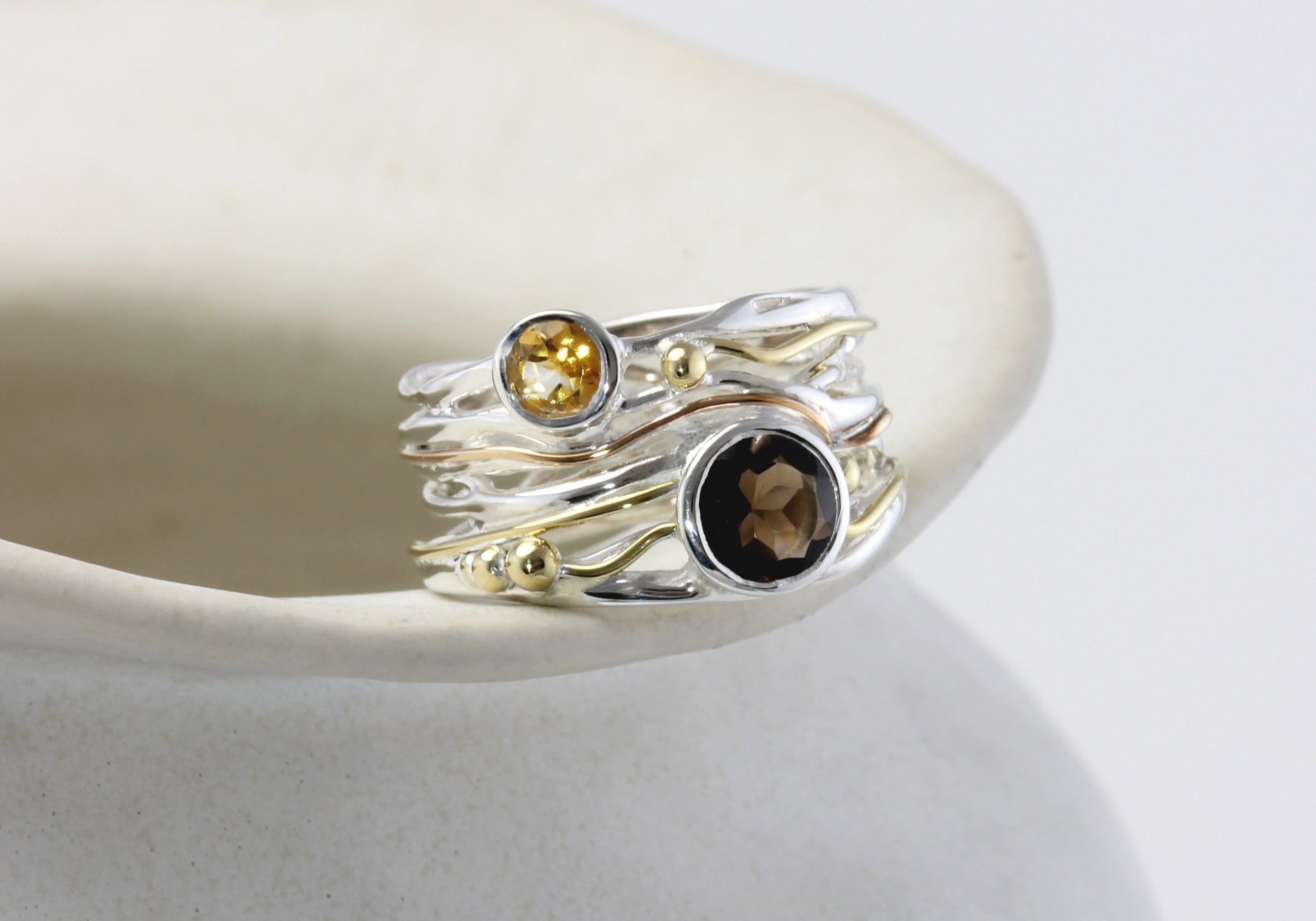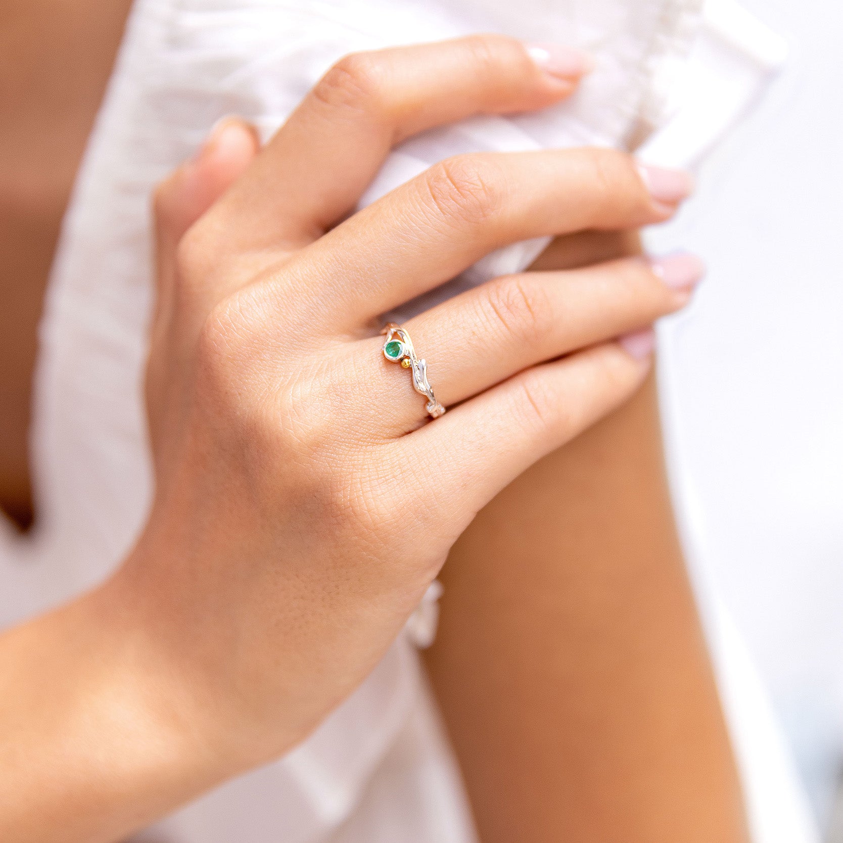 Crafted in silver with an organic form, this ring features vibrant gemstones and finished with subtle 14kt gold details.