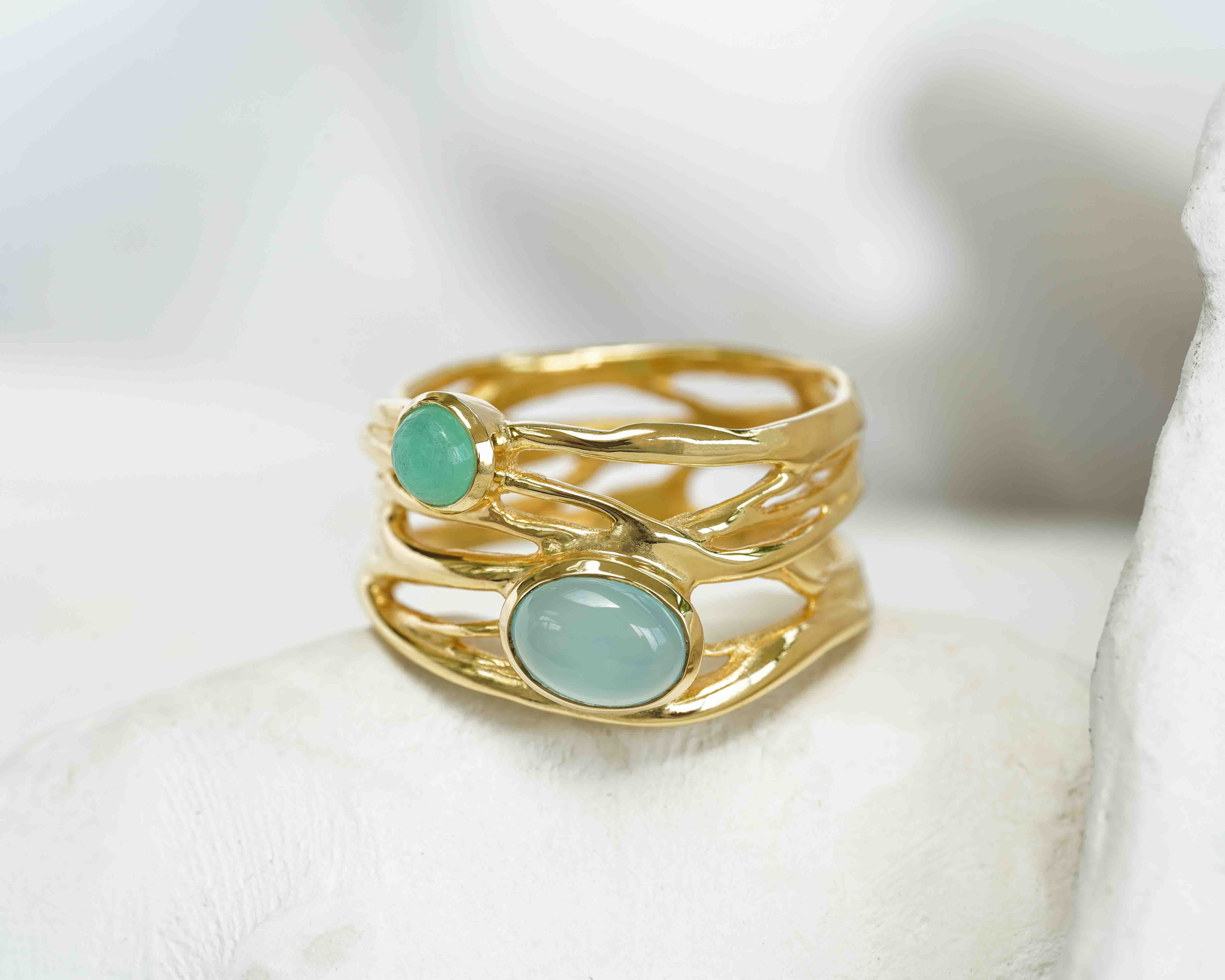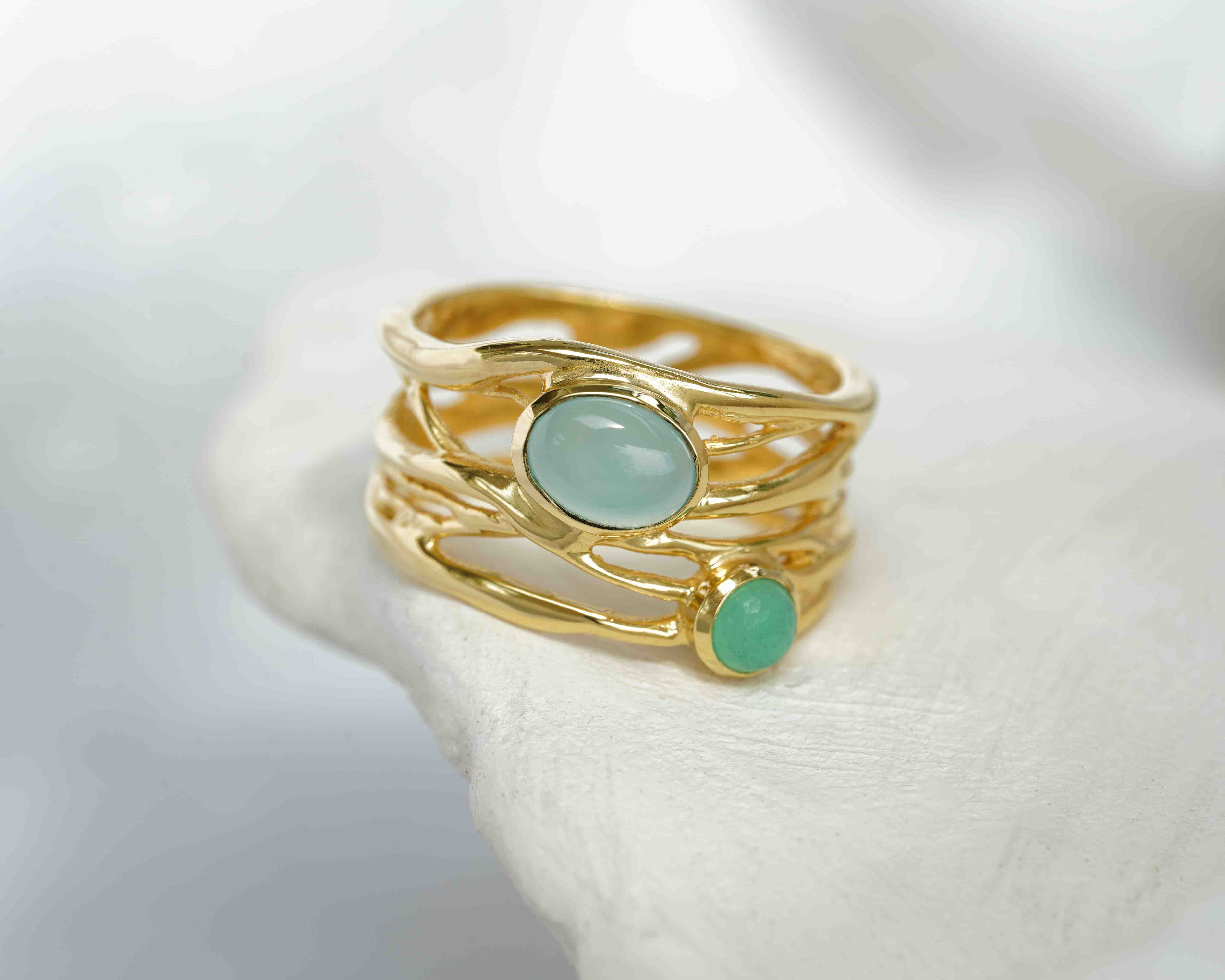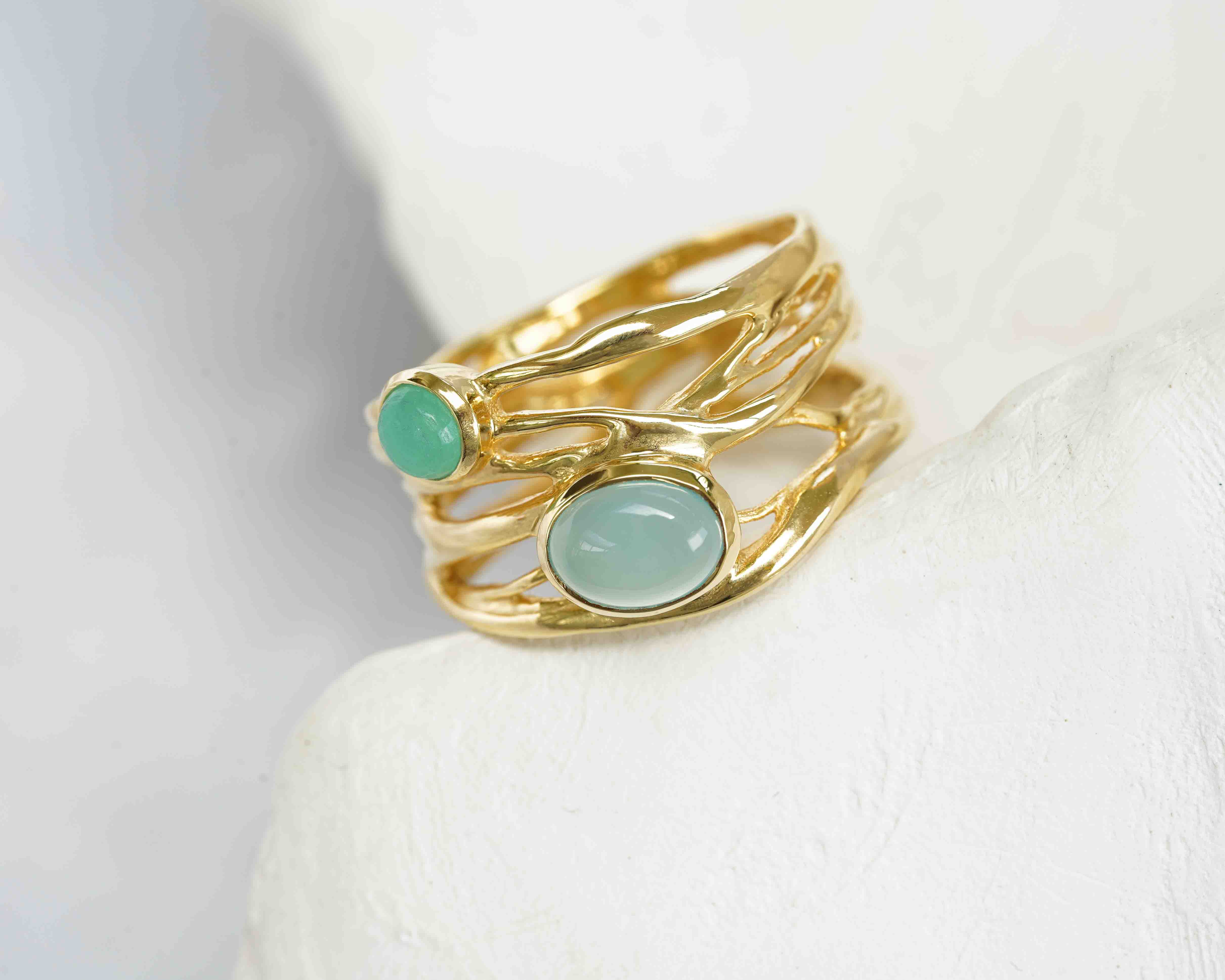 This statement Gold Vermeil ring features two eye-catching gemstones, an oval Aqua Chalcedony and small round Chrysoprase. The colour combination of soft blues and greens beautifully contrasts the gold, making this piece a standout addition to any women's jewellery collection.