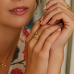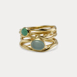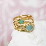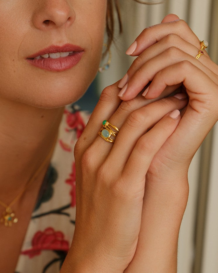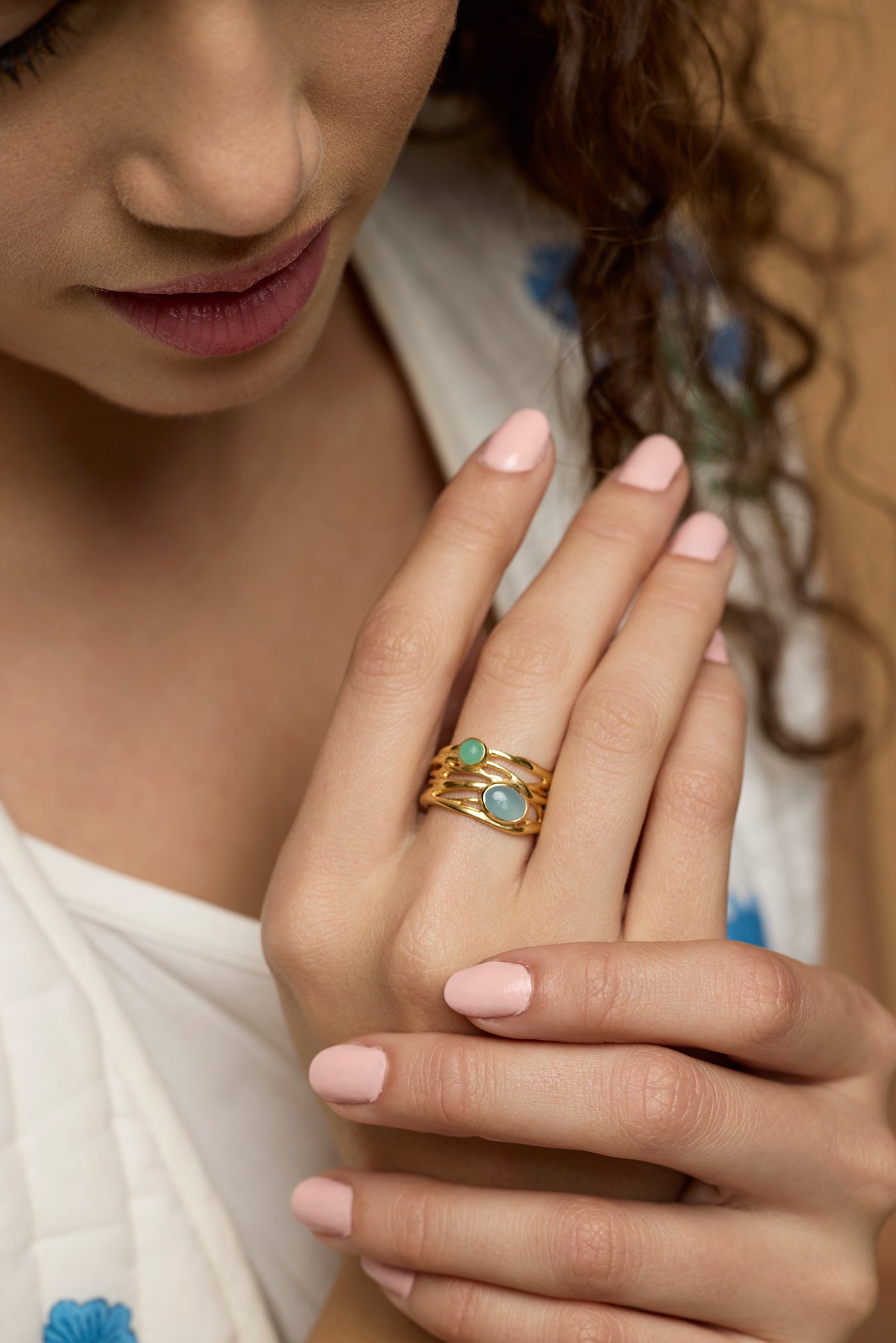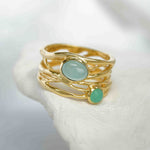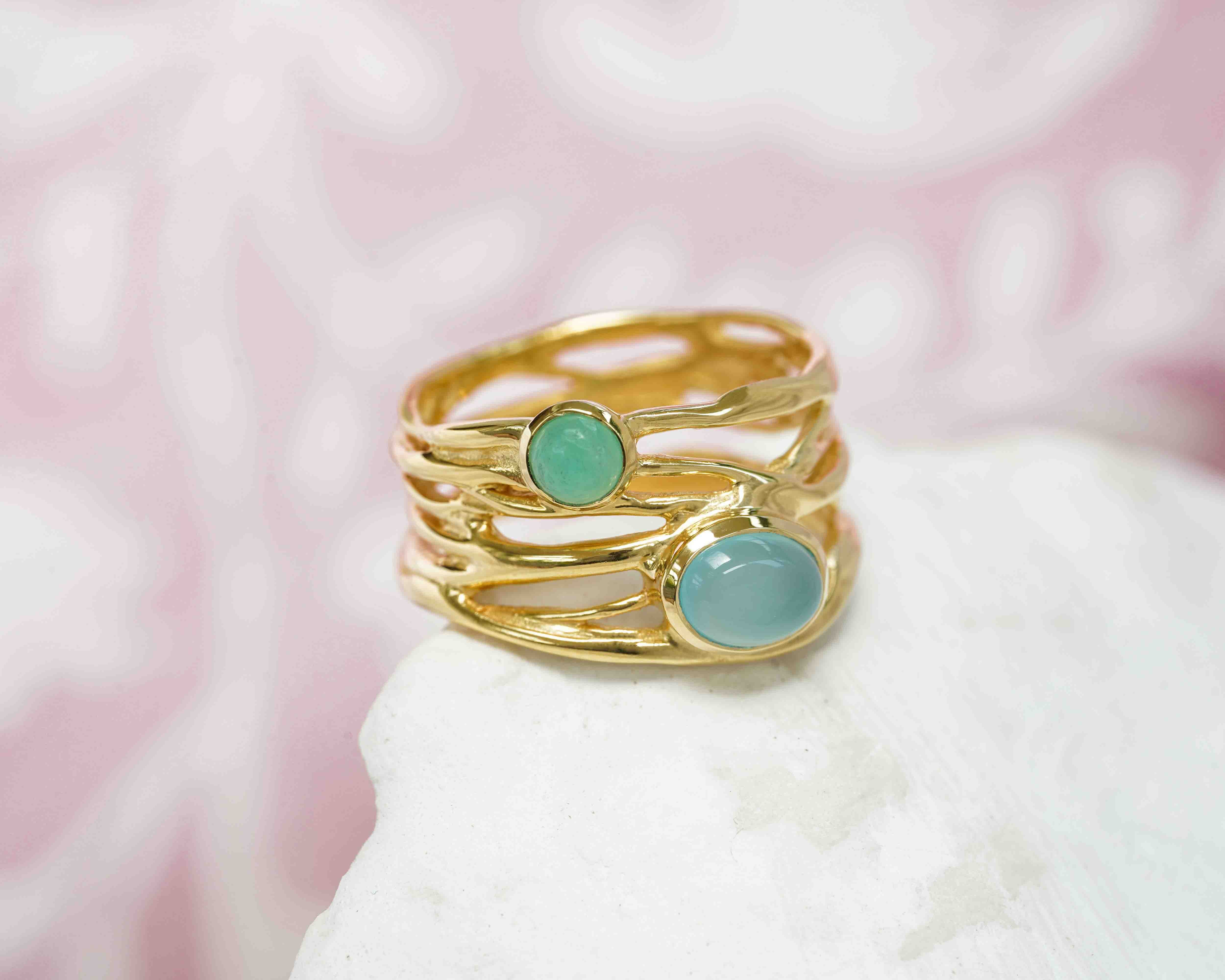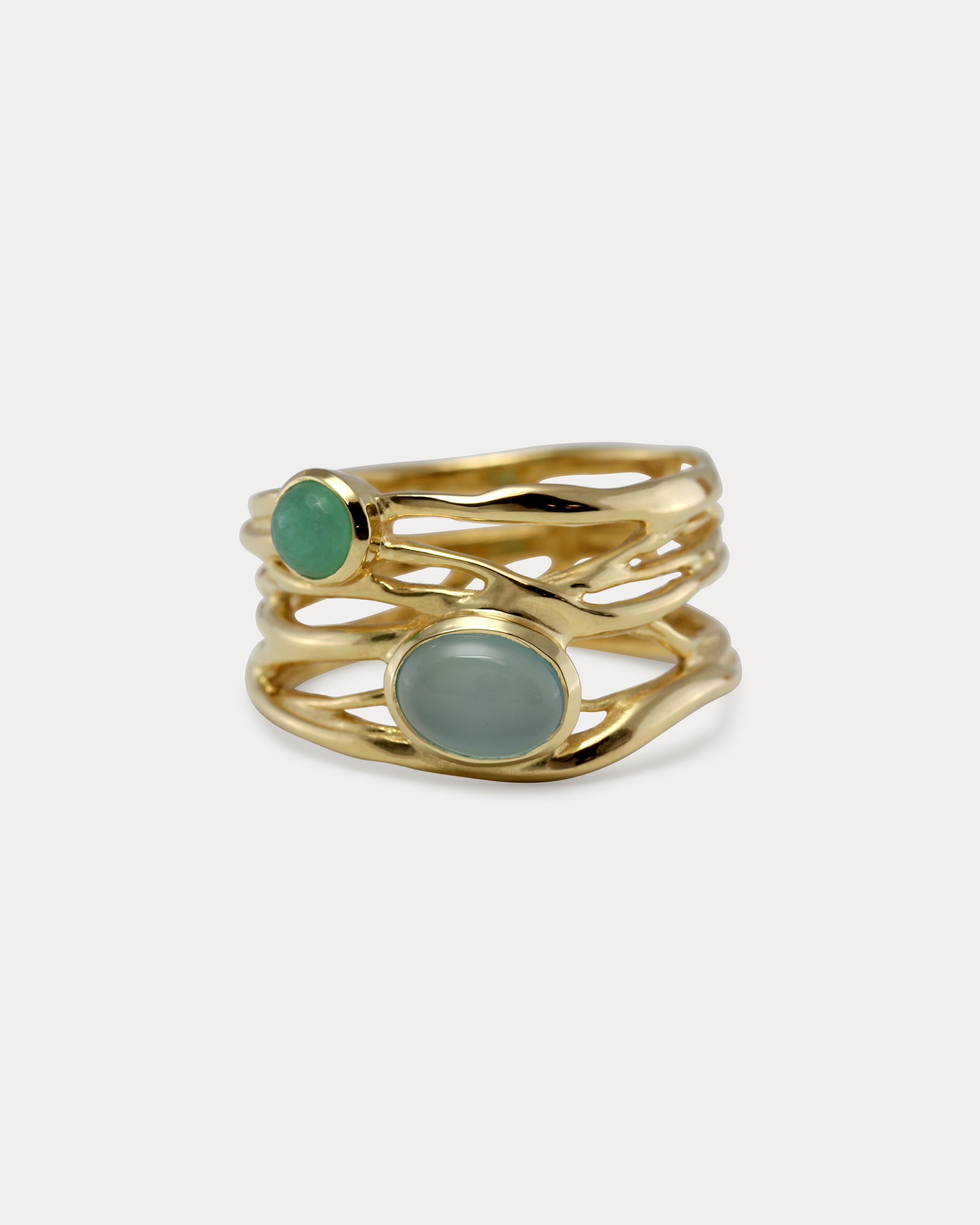 This statement Gold Vermeil ring features two eye-catching gemstones, an oval Aqua Chalcedony and small round Chrysoprase. The colour combination of soft blues and greens beautifully contrasts the gold, making this piece a standout addition to any women's jewellery collection.