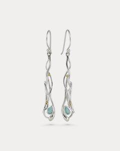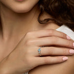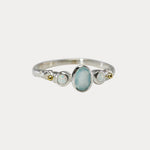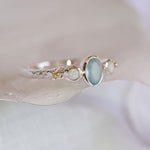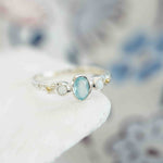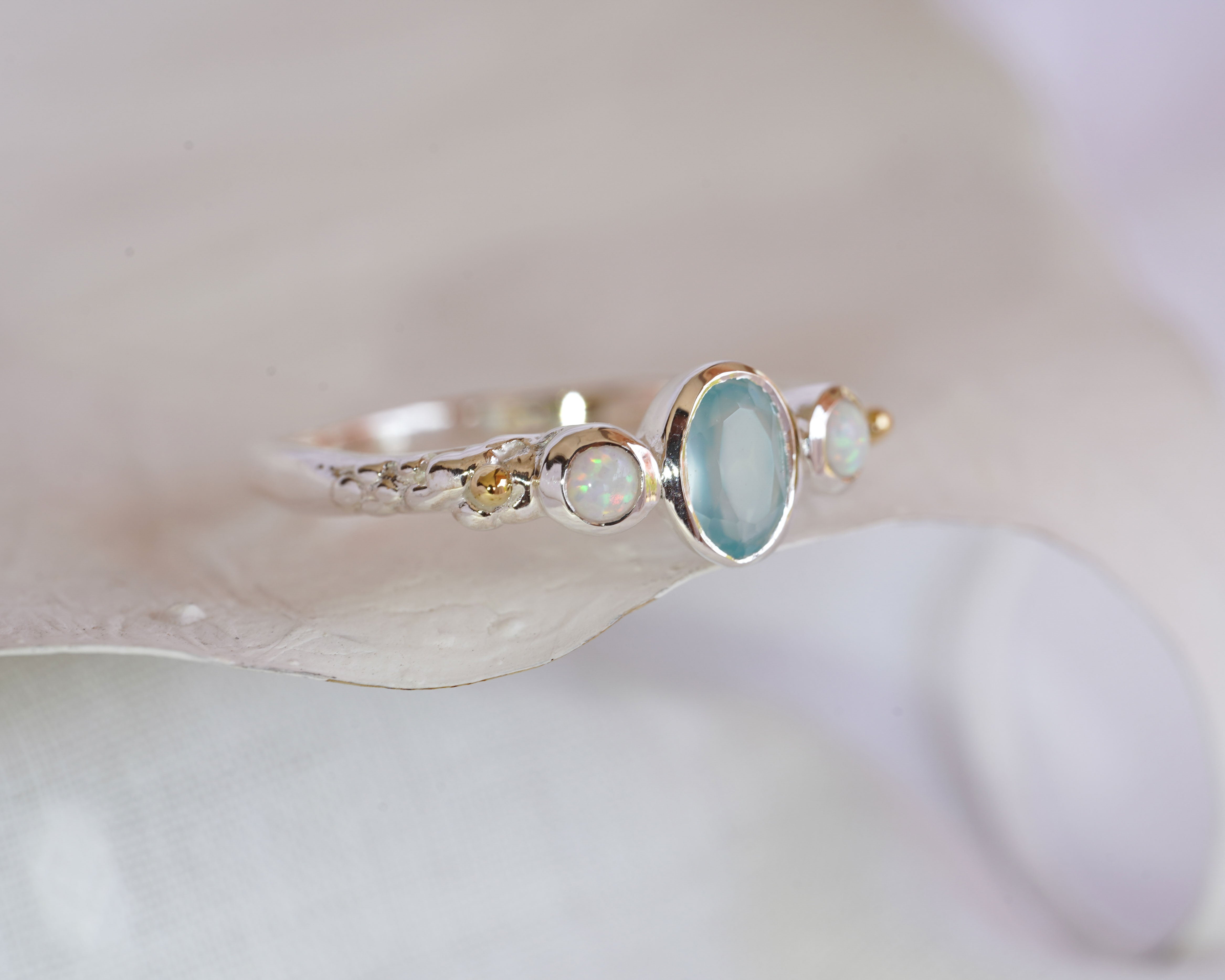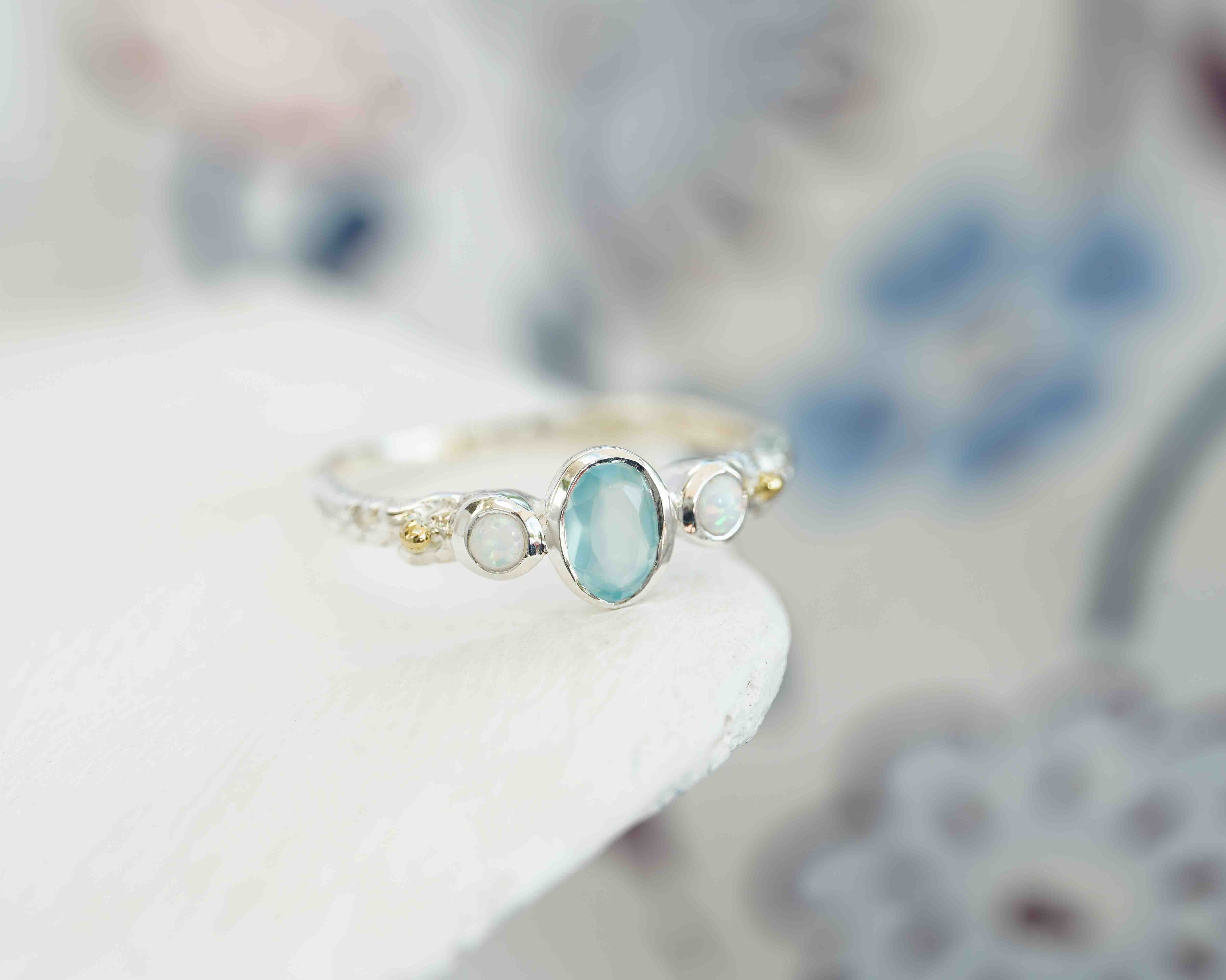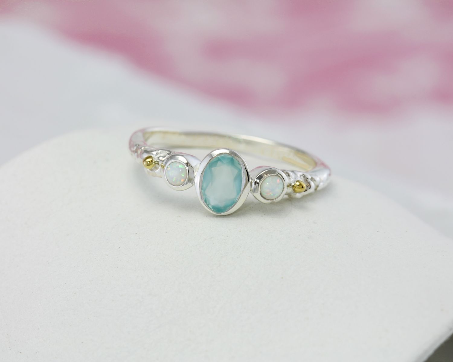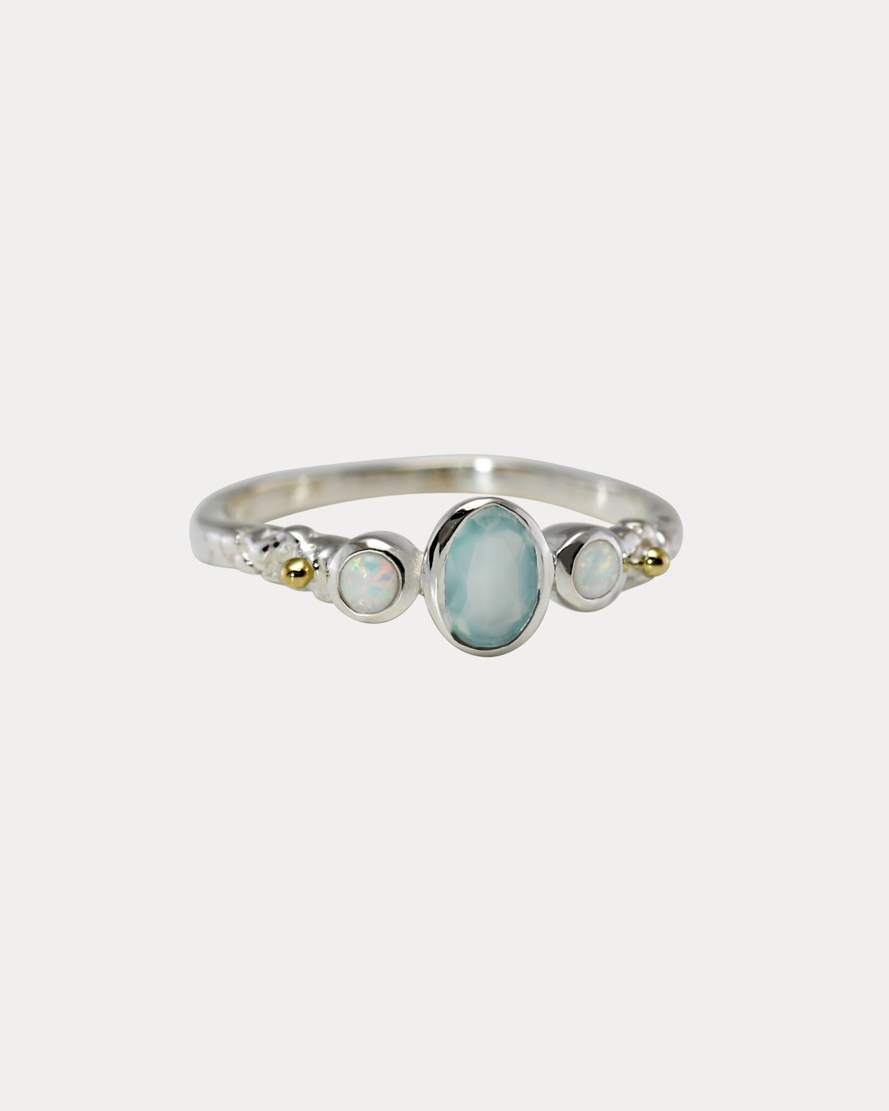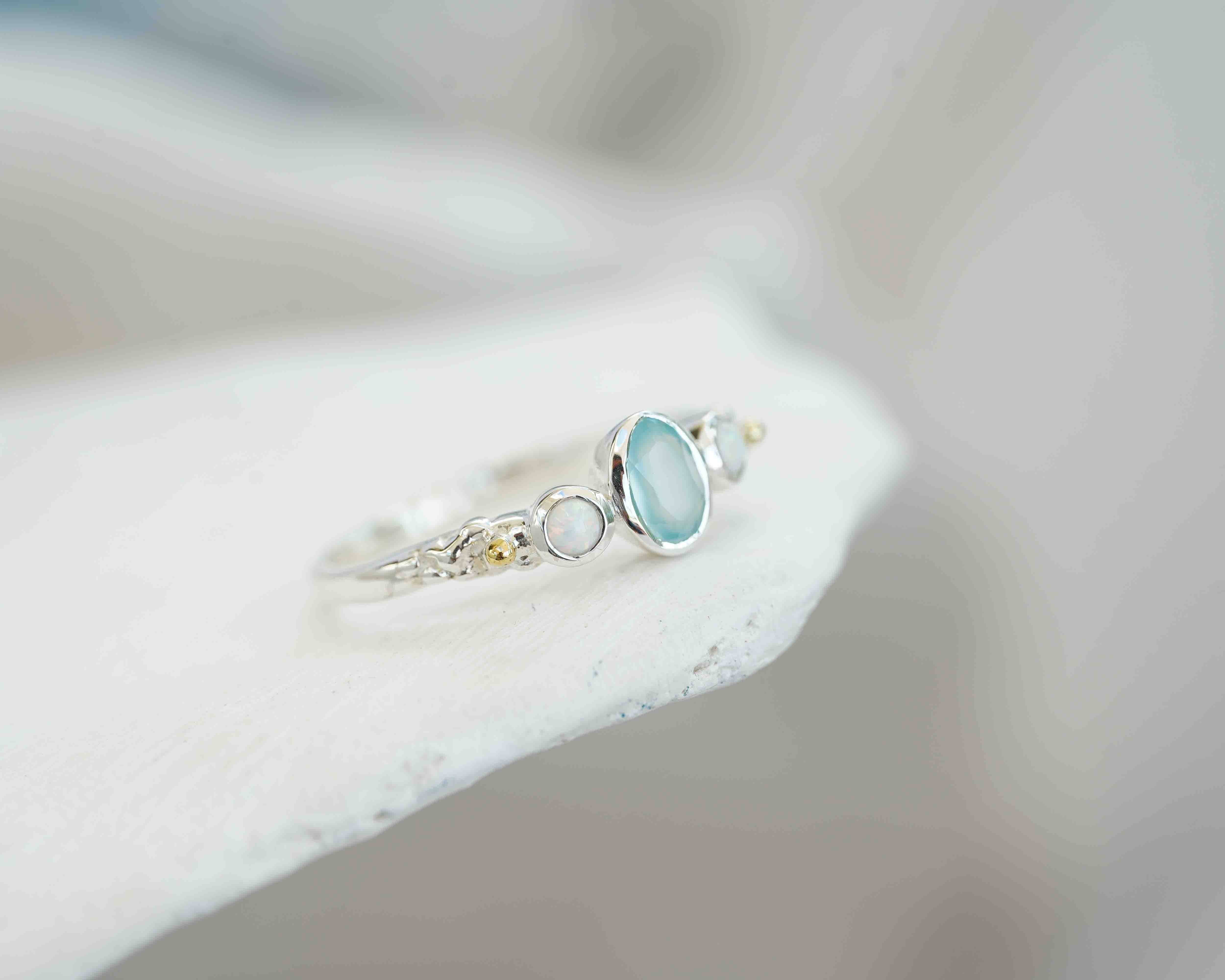 This dainty Sterling Silver ring is an eye-catching addition to any collection. Featuring an oval Aqua Chalcedony that beautifully catches the light, nestled between two sparkling White Opals and gold pips.