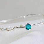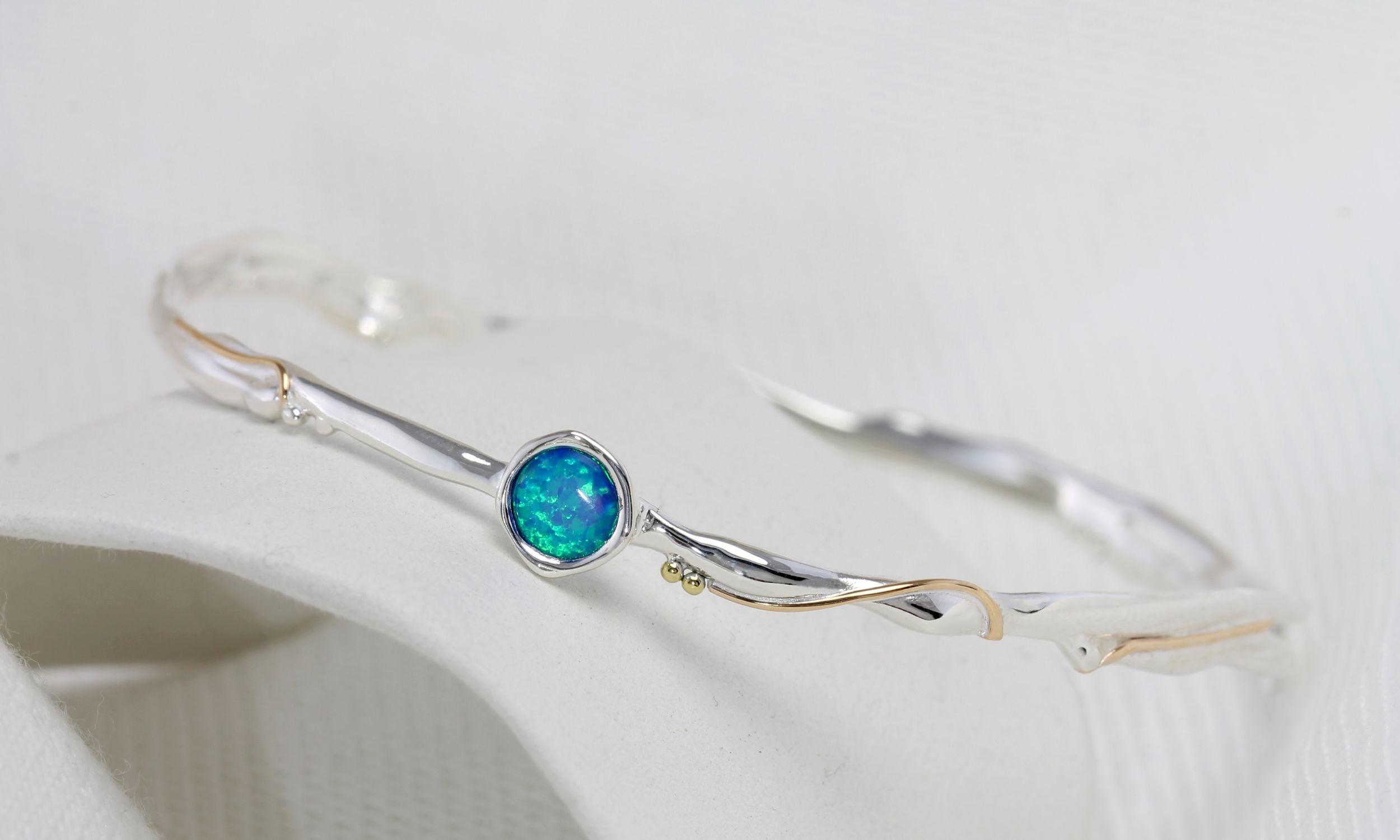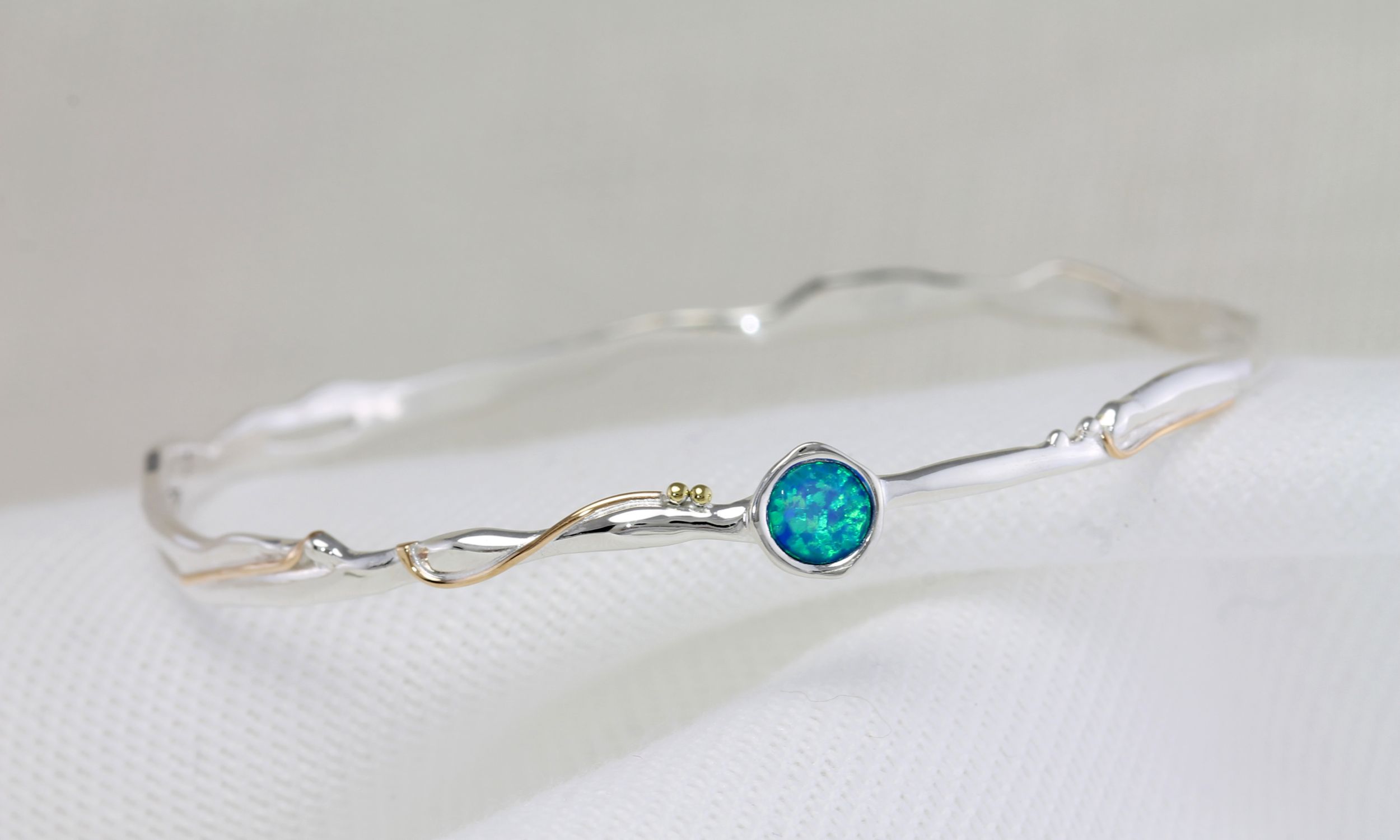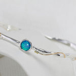 A delicate Sterling Silver bangle, set with a vibrant round blue Opalite and finished with 14KT Gold wire interwoven throughout. It's a beautifully dainty piece in a flowing, curving design, perfect for everyday wear.