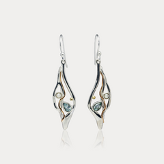 With a striking, contemporary feel, this ring is made up of sweeping, fluid lines surrounding the teardrop cut Blue Topaz, leading across the ring to a round cut White Topaz. Gold pips add subtle touches of mixed metal warmth.