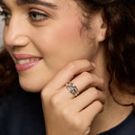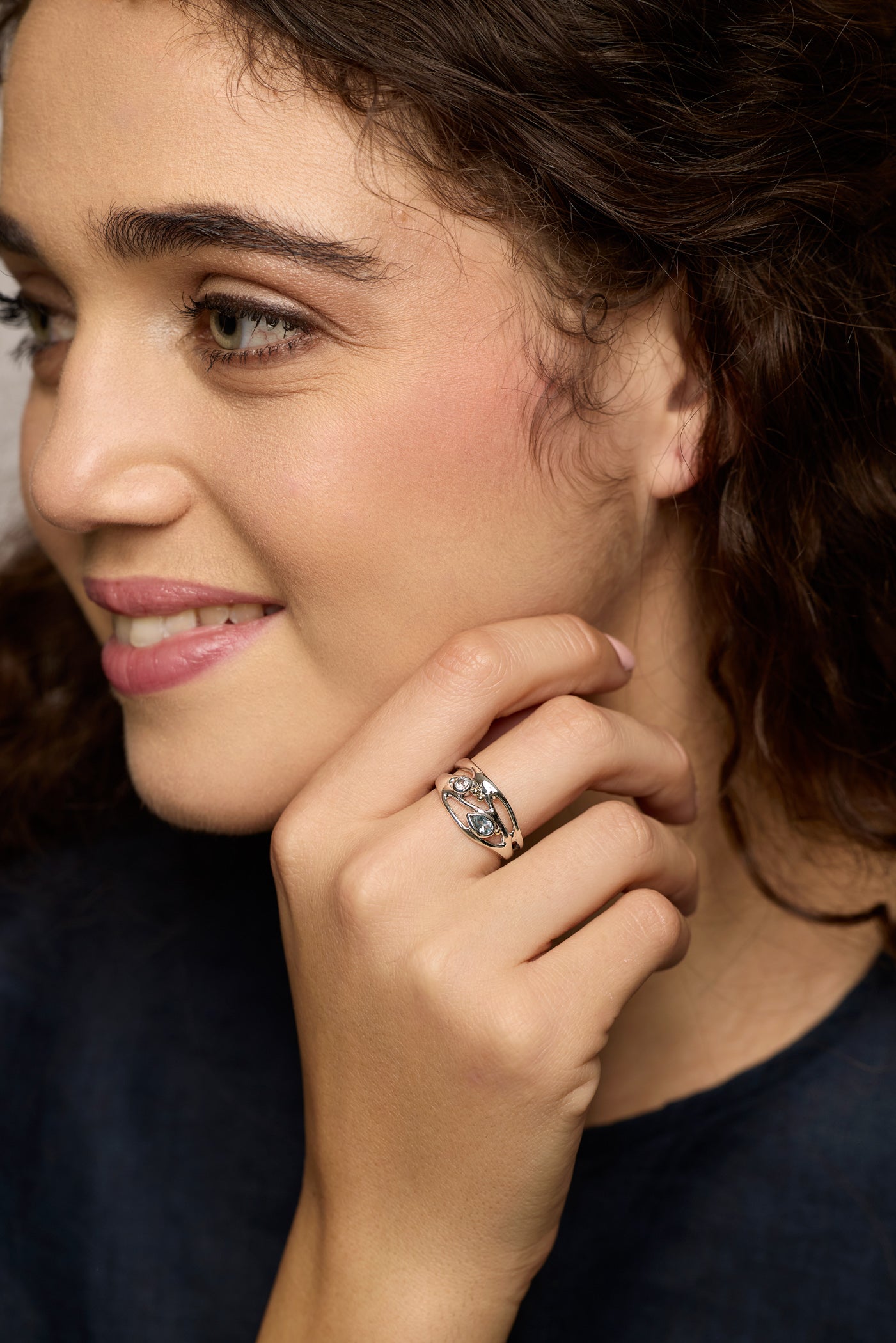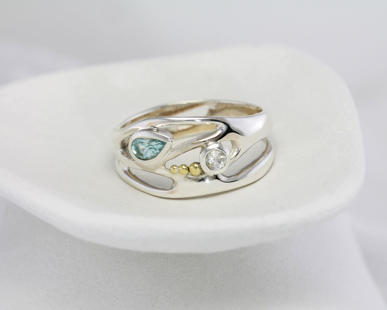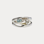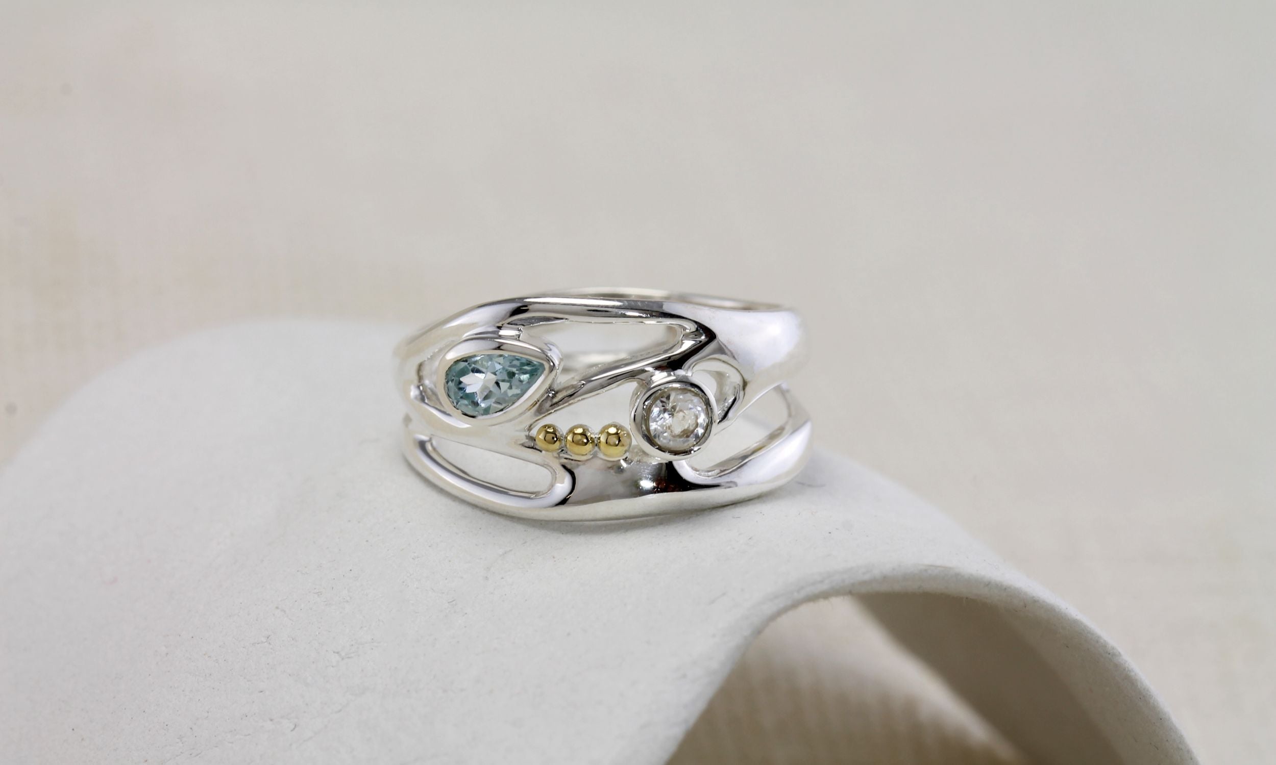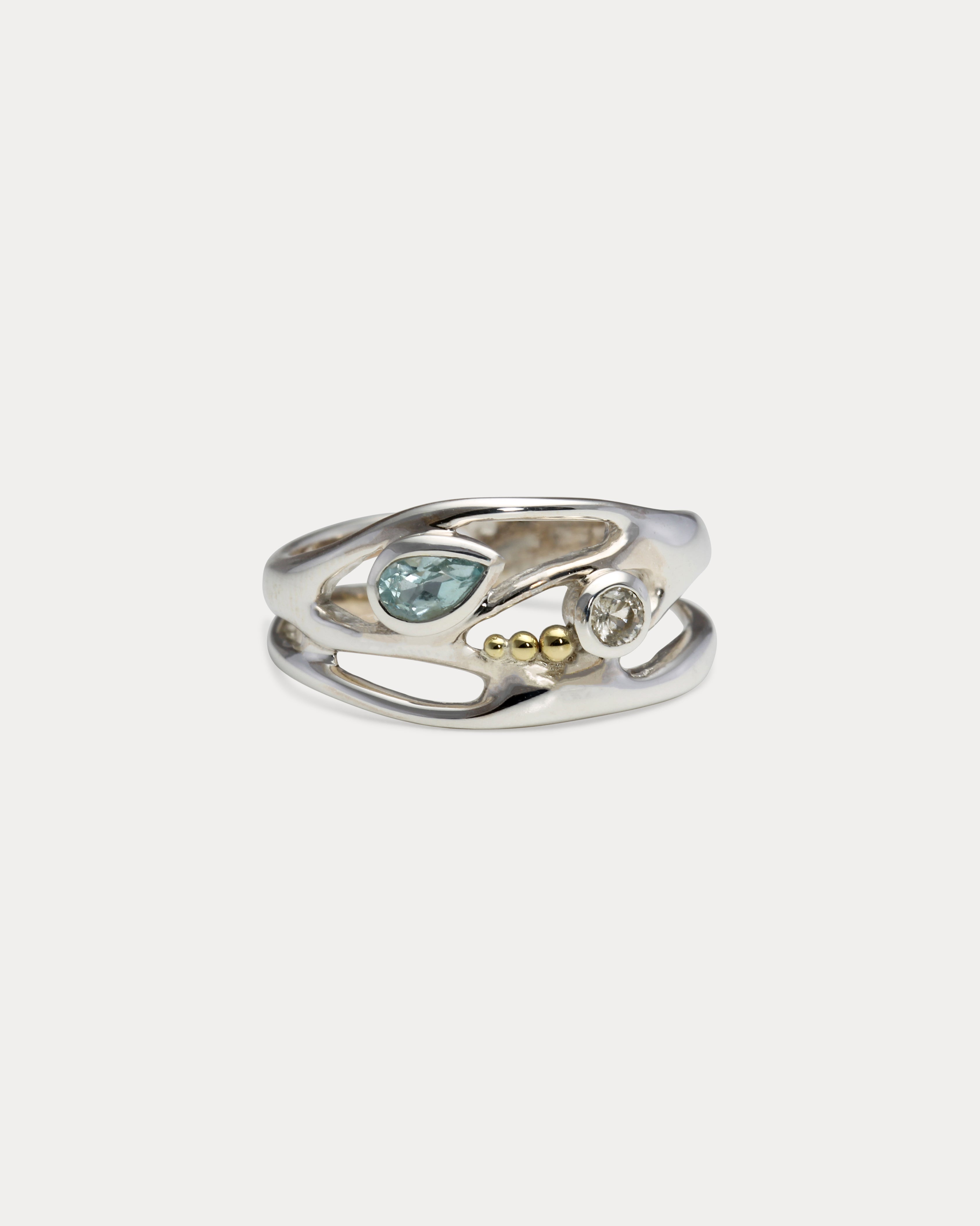 A statement Sterling Silver ring with Blue Topaz, White Topaz and delicate 14KT Gold detailing.