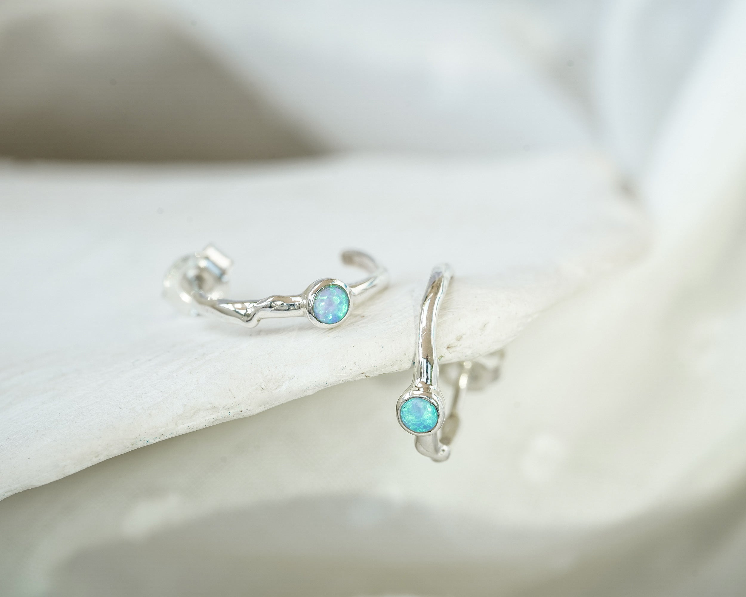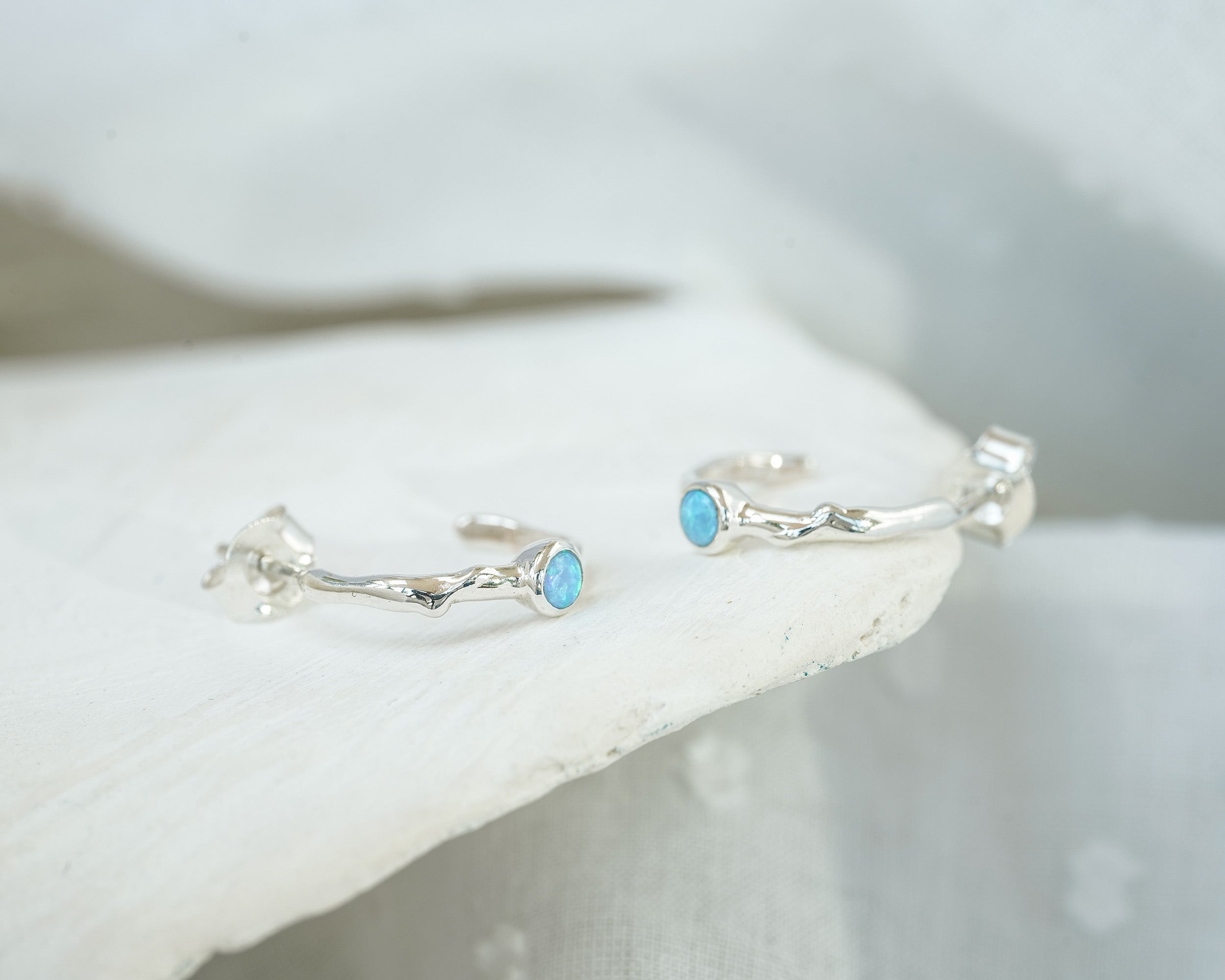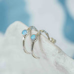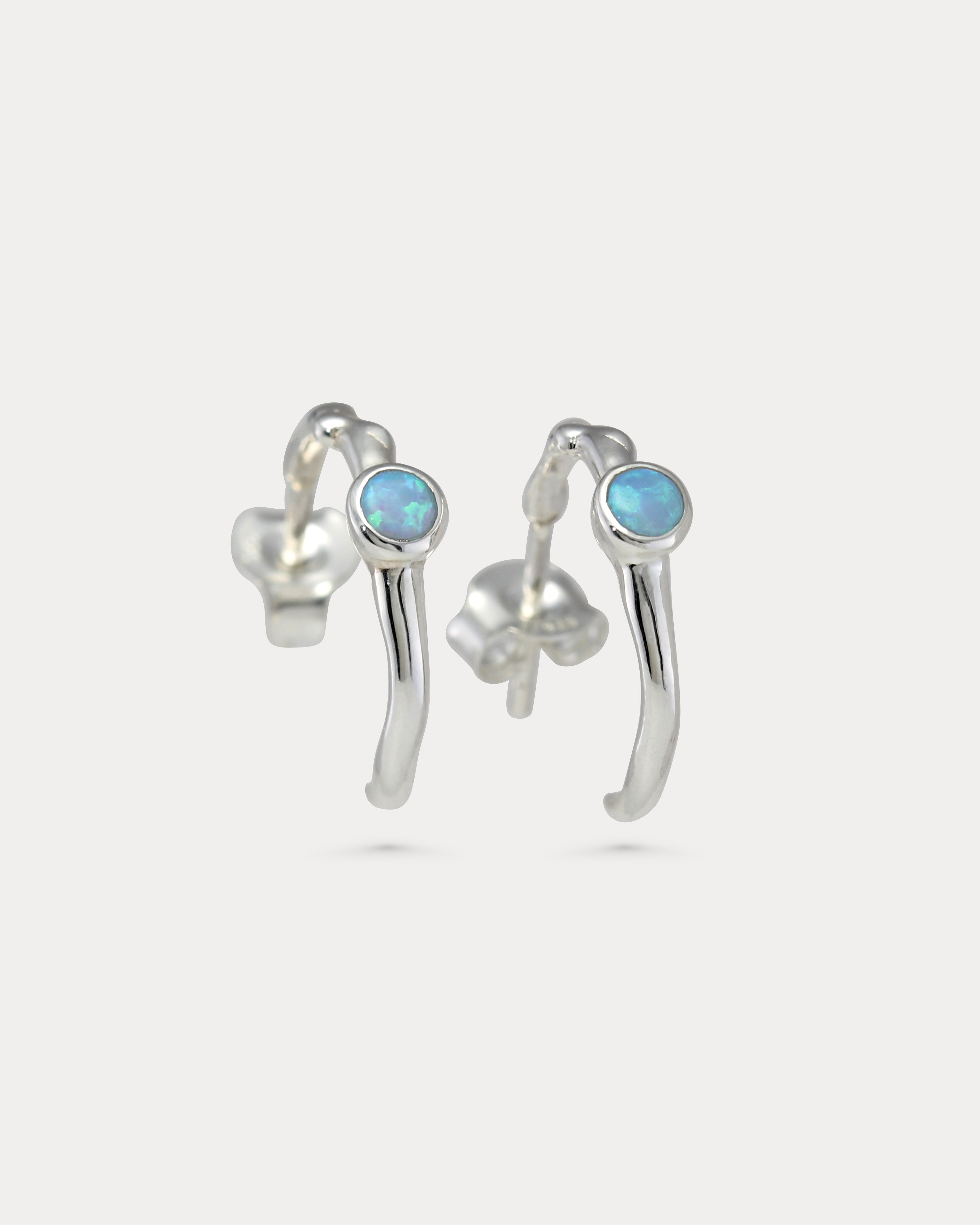 These small huggie hoops are handcrafted from Sterling Silver. They feature dainty, round Blue Opals, which sparkle beautifully against the silver. These are perfect to add to your existing earring stack or wear solo.