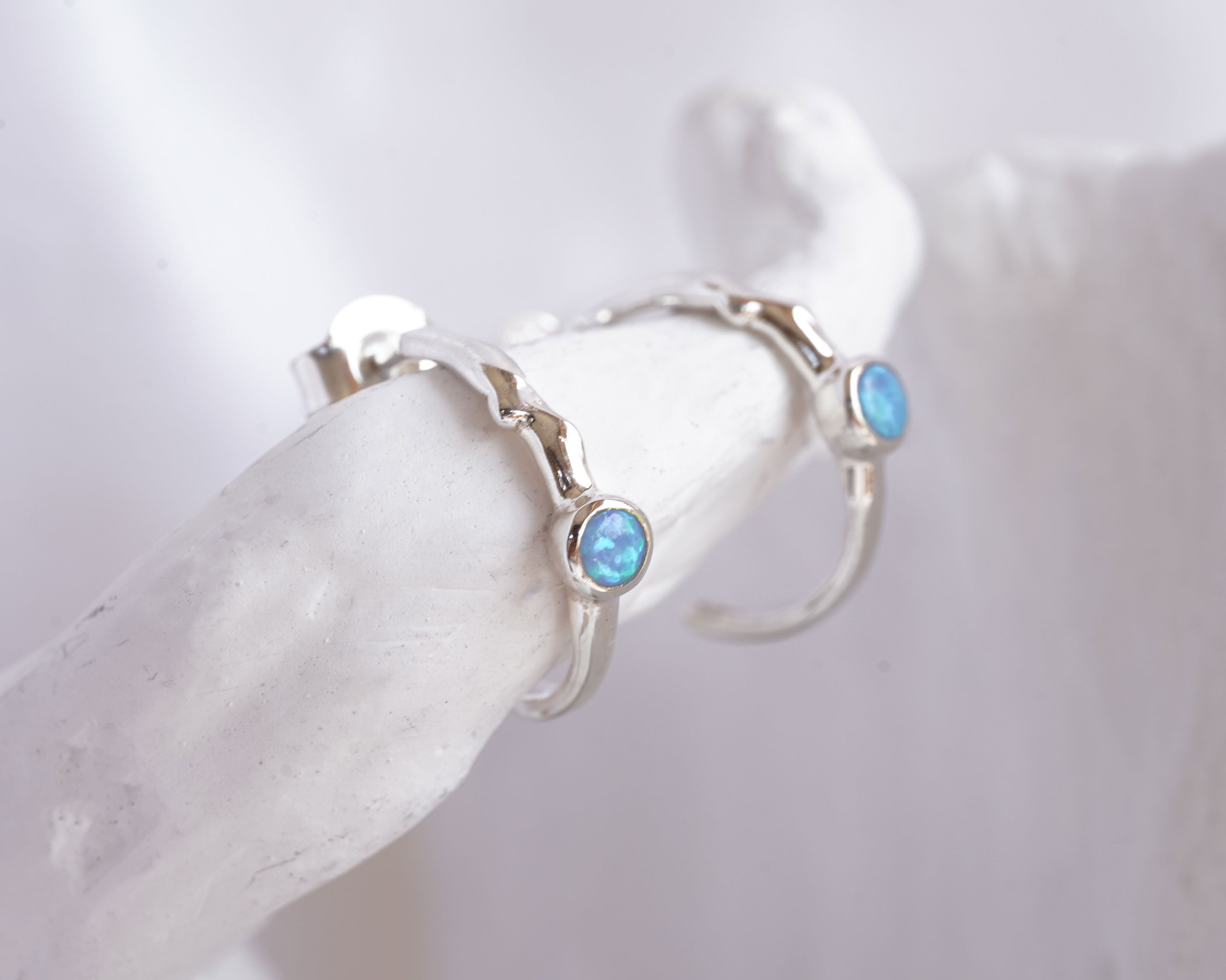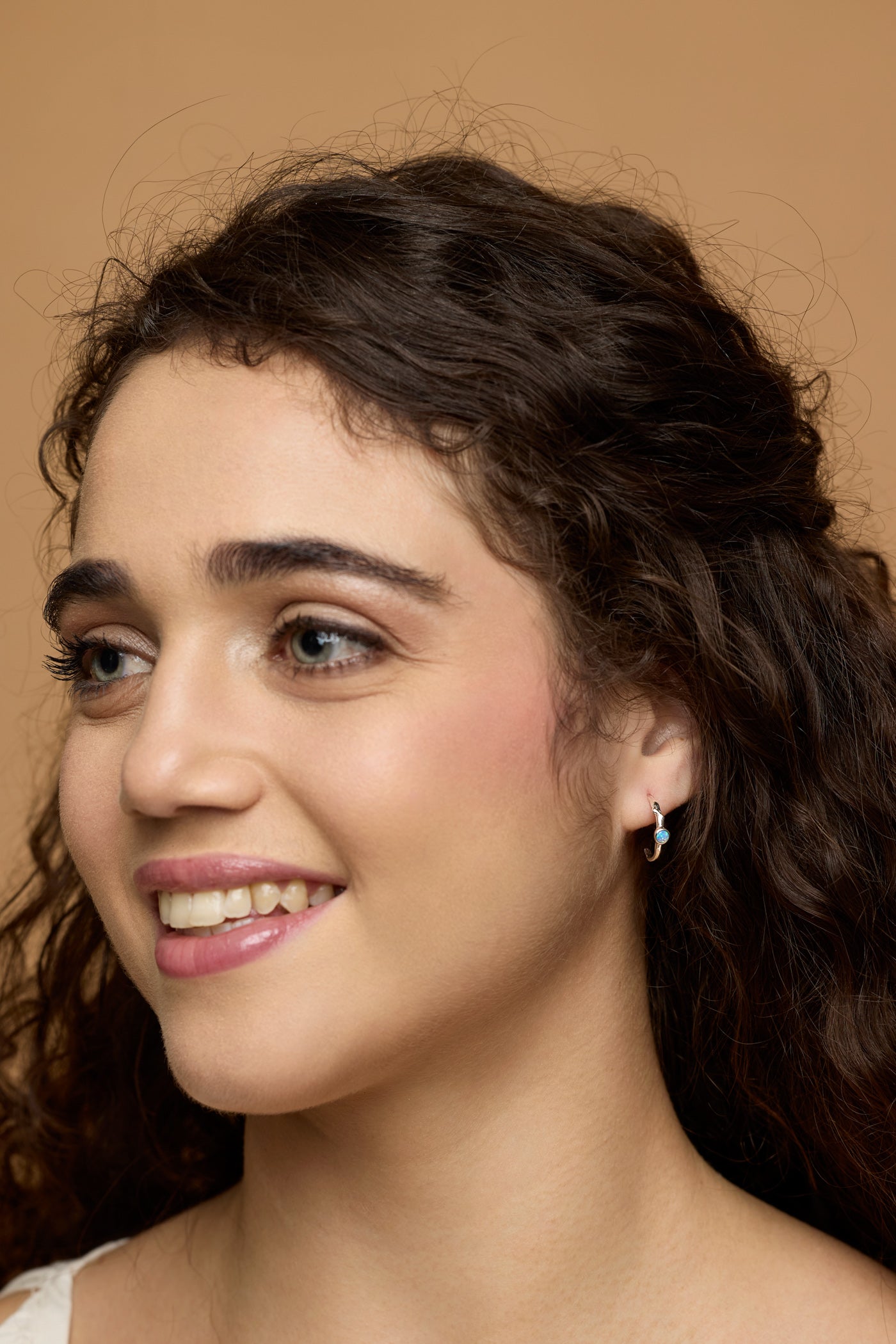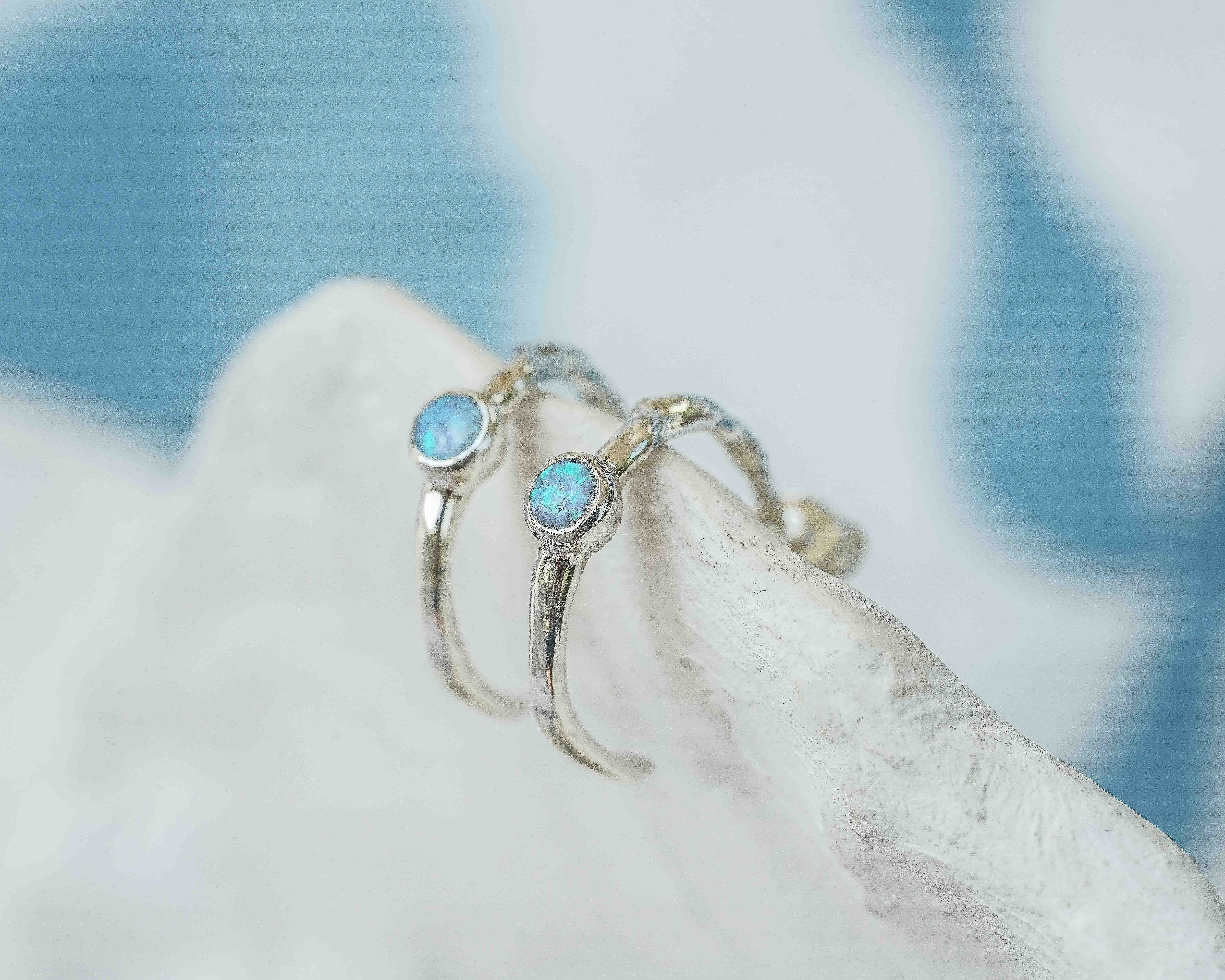These small huggie hoops are handcrafted from Sterling Silver. They feature dainty, round Blue Opals, which sparkle beautifully against the silver. These are perfect to add to your existing earring stack or wear solo.