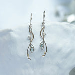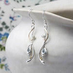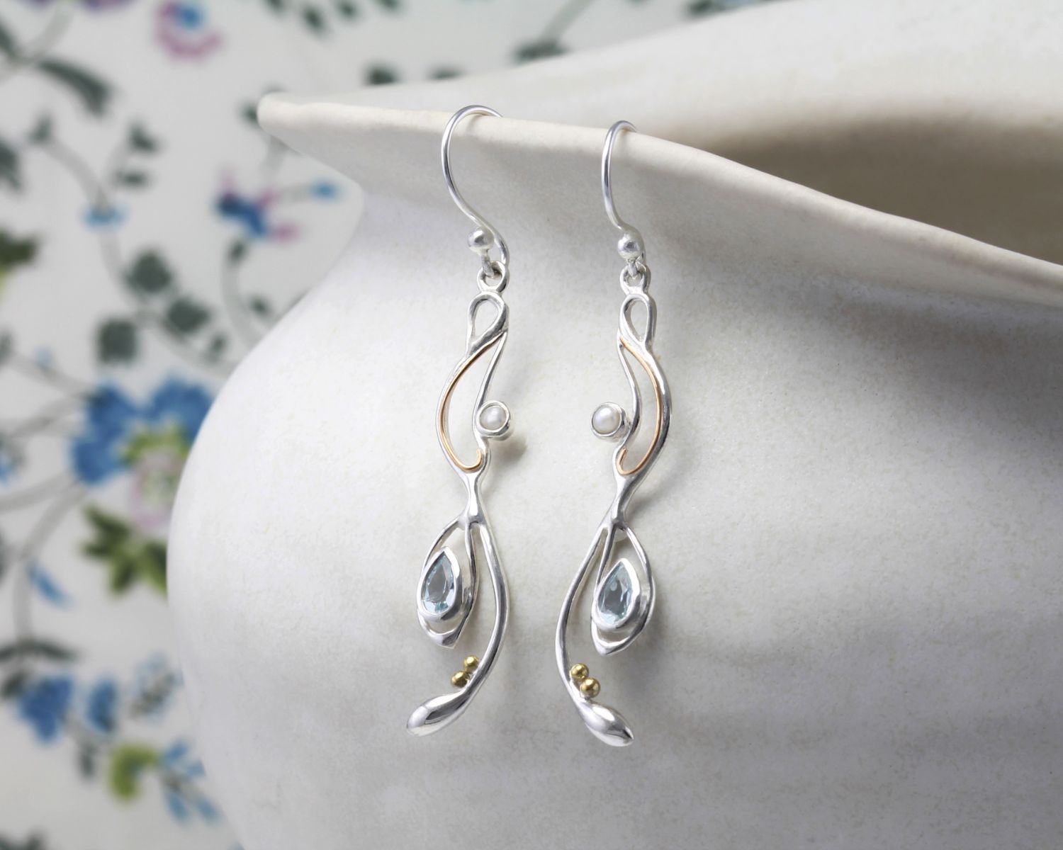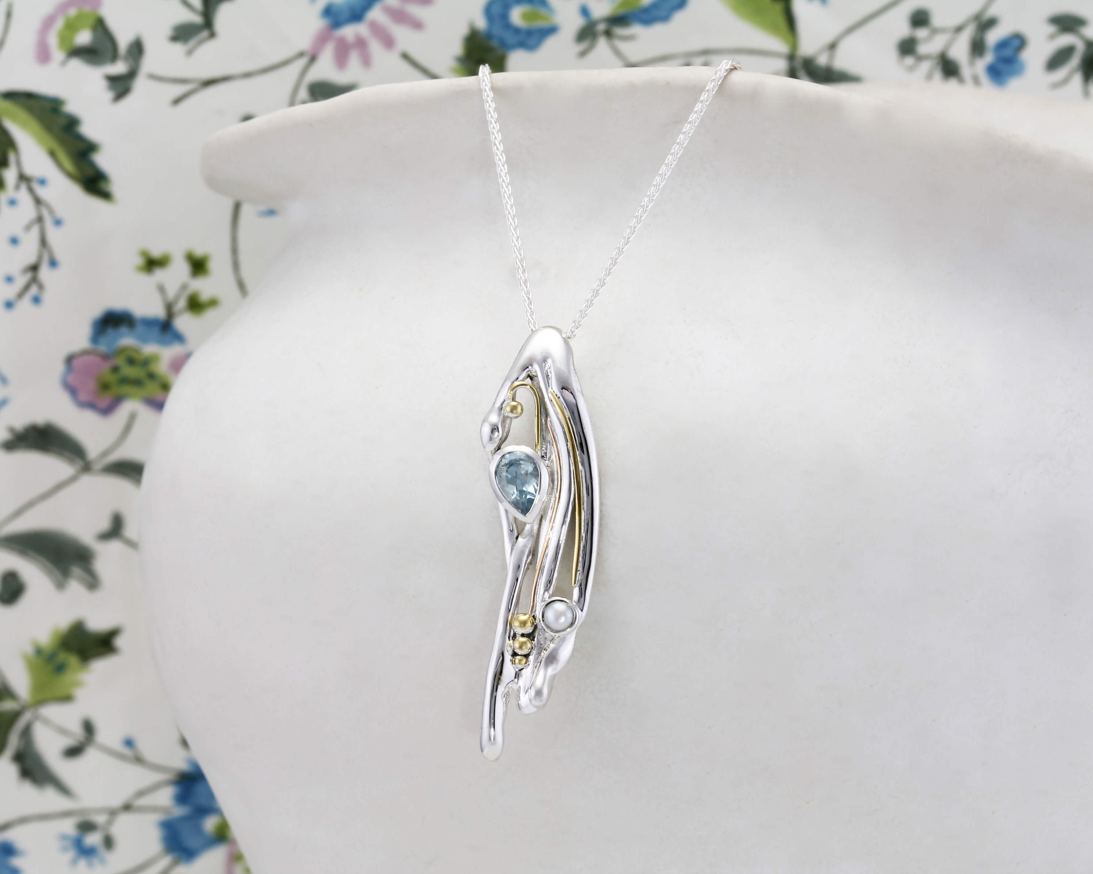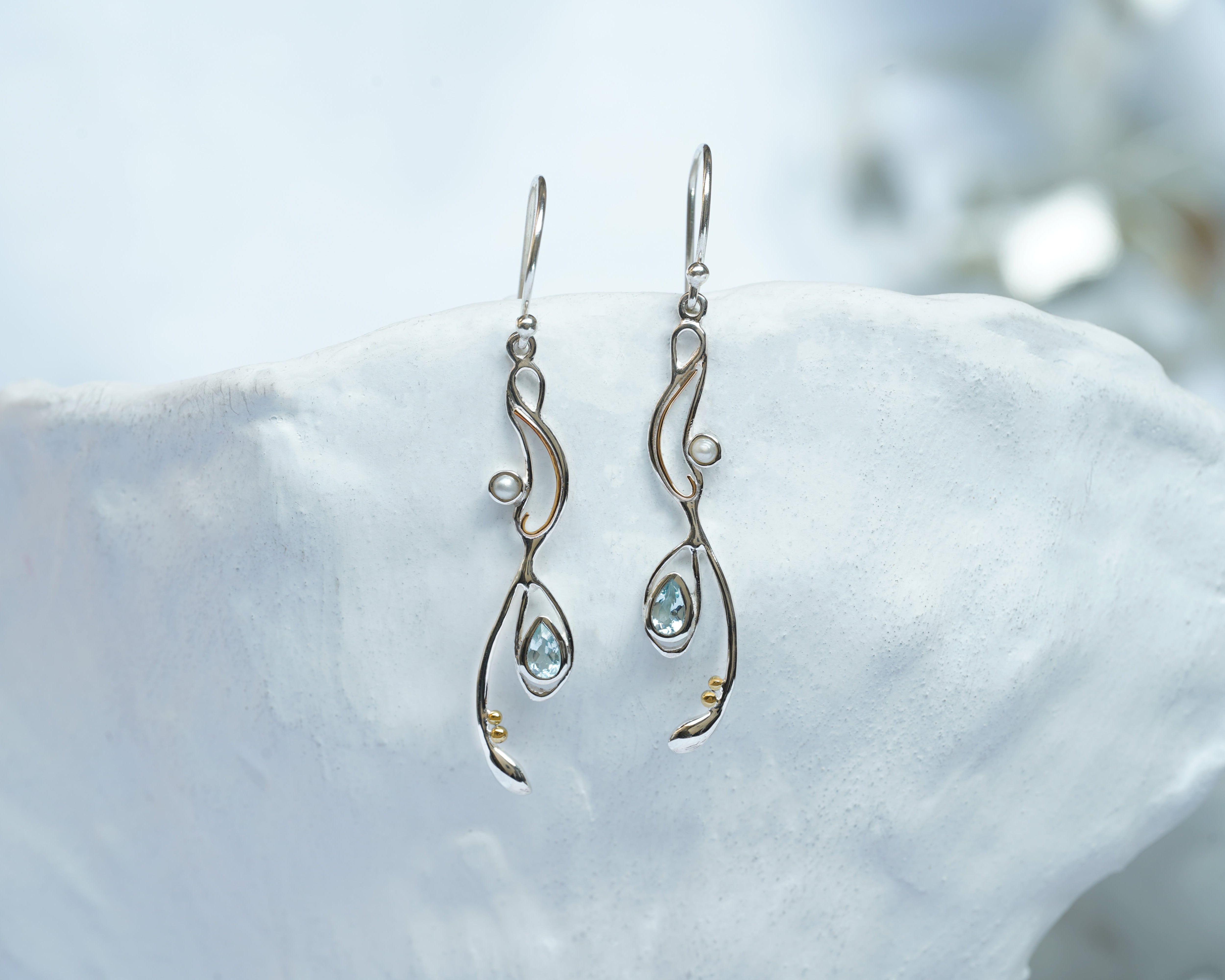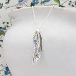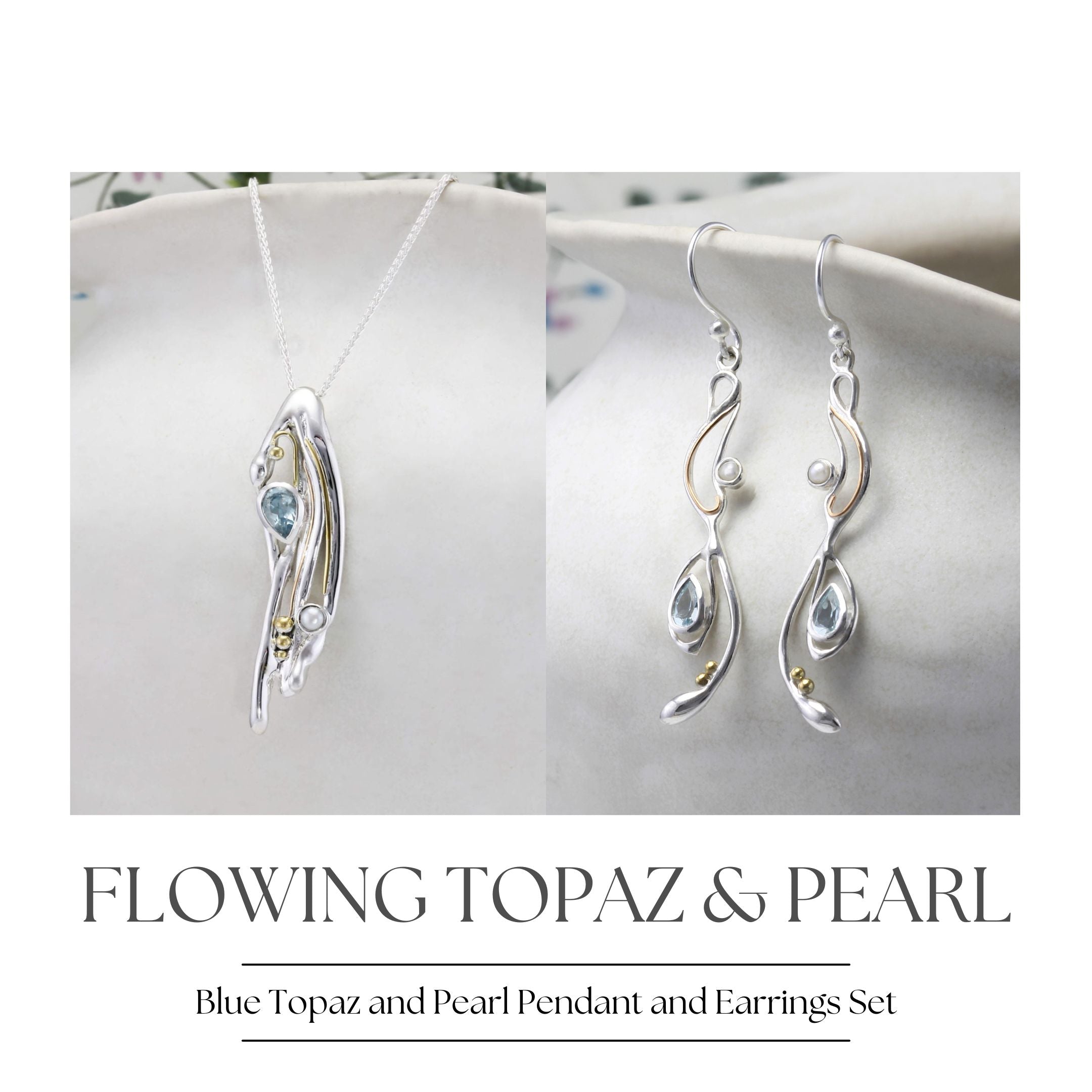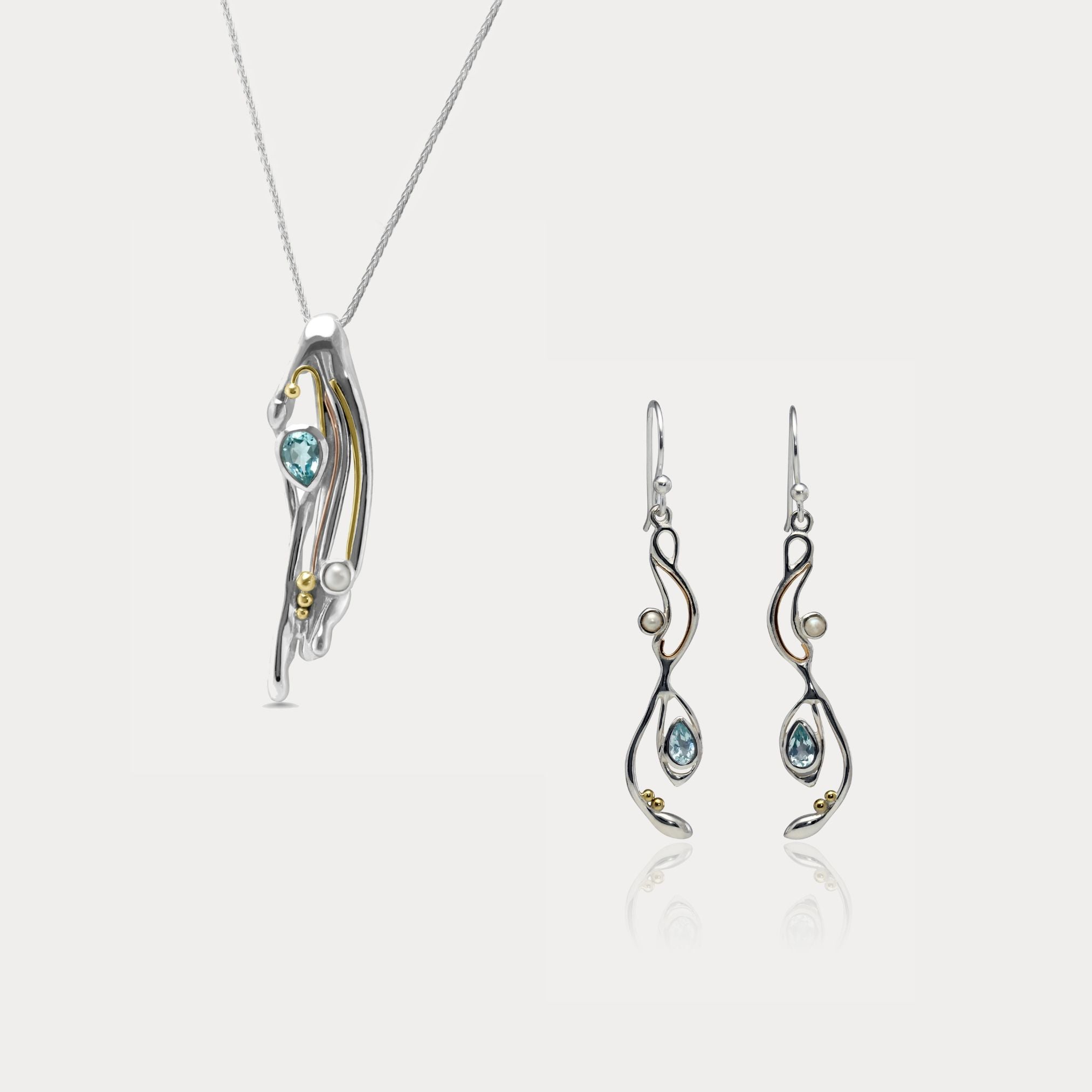 Our Flowing Pendant and Earring set is created using a free-flowing and intricate sterling silver design set with a faceted blue topaz and creamy white pearl.