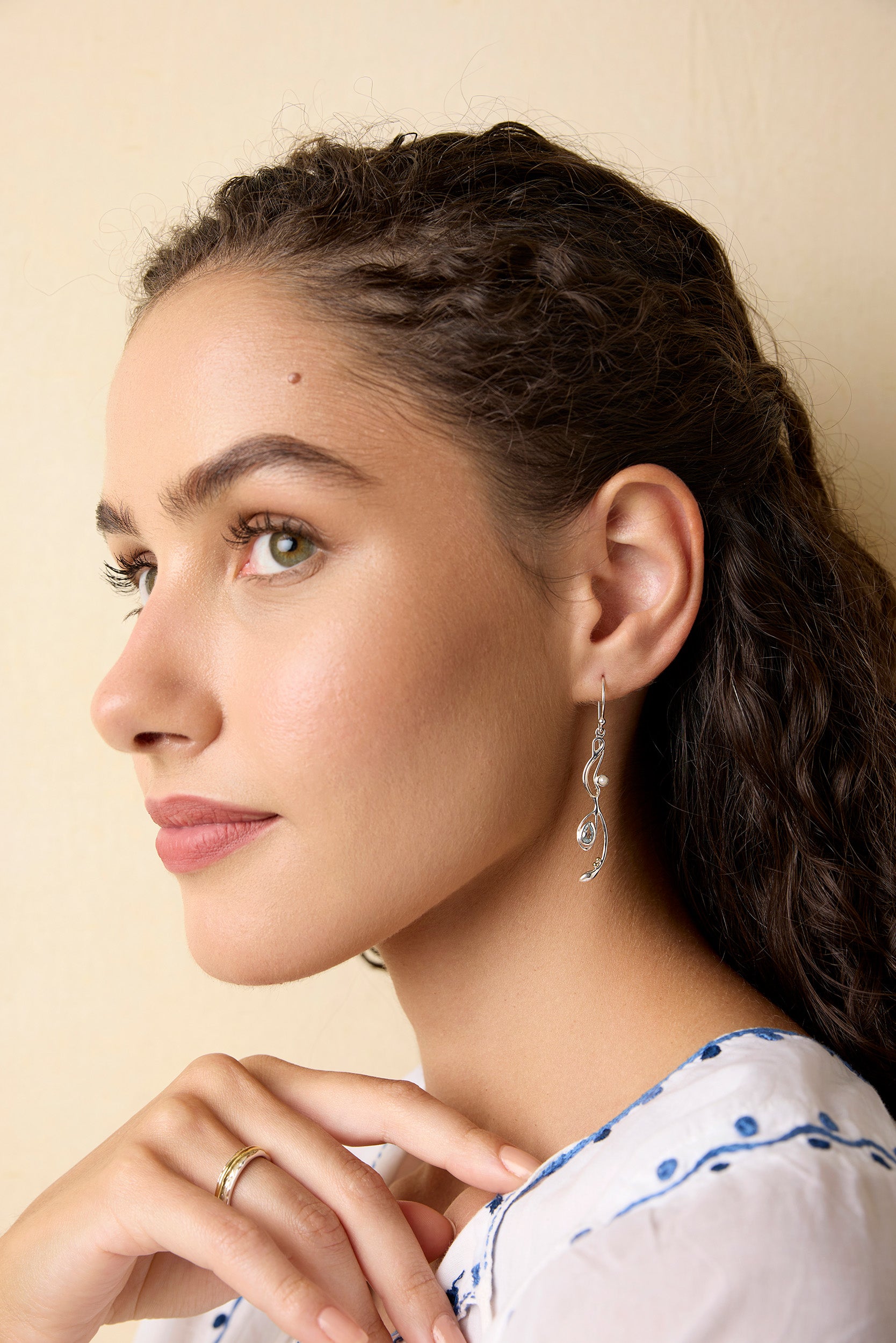 Transform any look with our statement earrings featuring a teardrop faceted blue topaz and a freshwater pearl intertwined with 14kt gold and brass pip detailing.