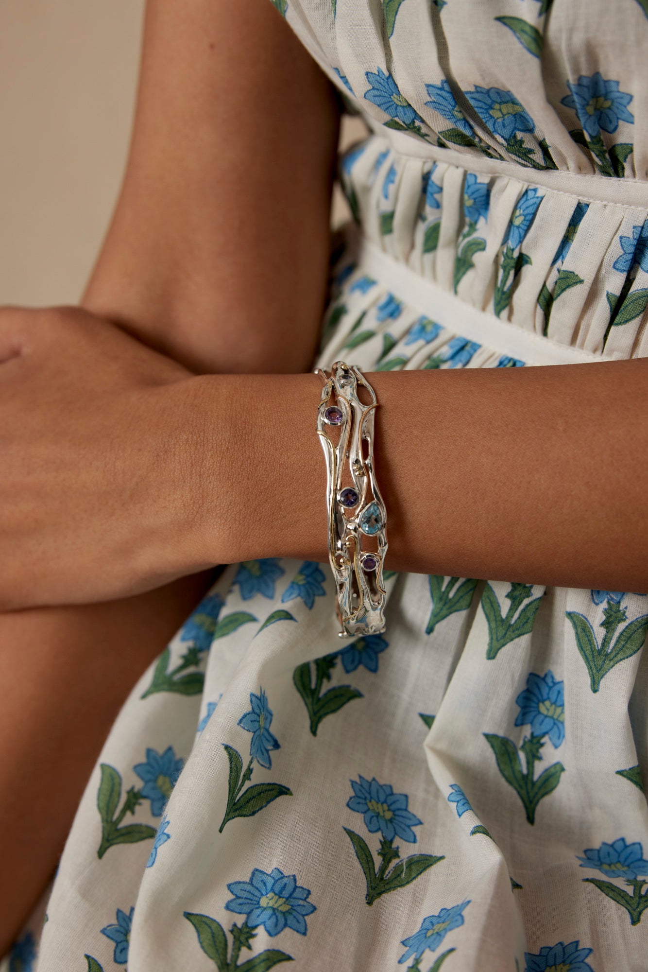 This unique, flowing Sterling Silver bangle features 14KT Gold detailing, and is set with a teardrop Blue Topaz, two round Purple Amethysts and two round Iolites. It is a beautifully intricate piece with sparkling, dainty gemstones.