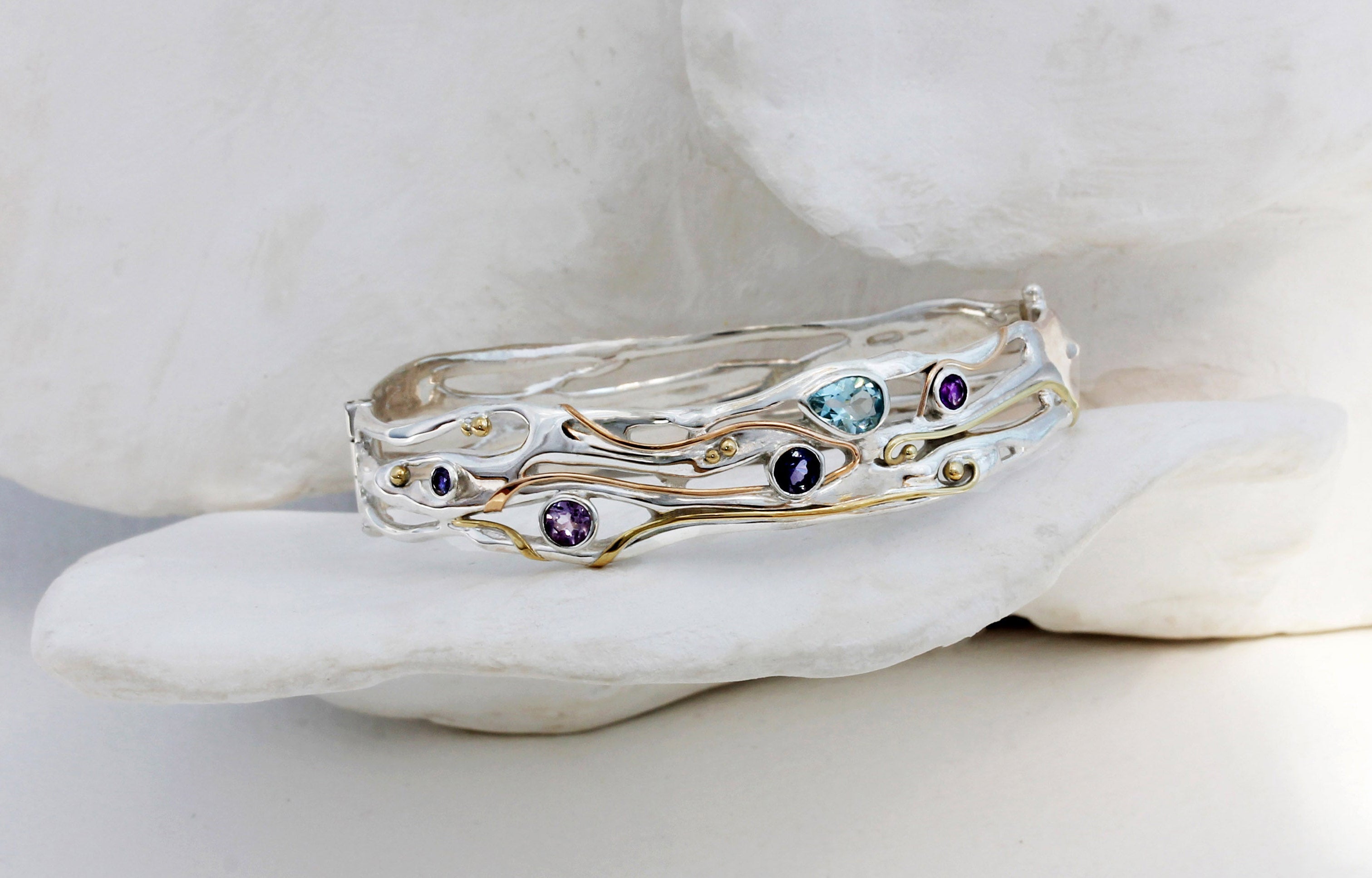 This unique, flowing bangle features 14KT Gold detailing, and is set with a teardrop Blue Topaz, two round Purple Amethysts and two round Iolites. It is a beautifully intricate piece with sparkling, dainty gemstones.