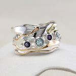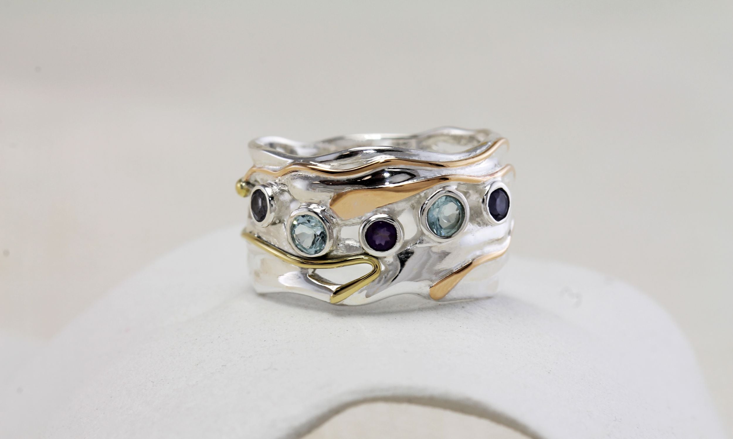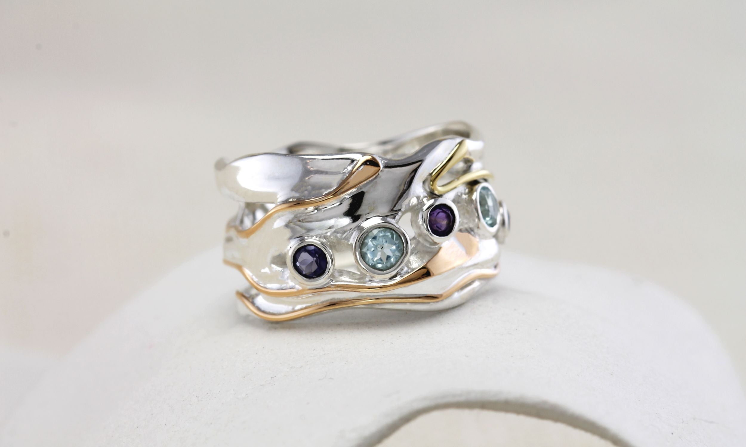 Faceted Blue Topaz, Iolite, and Amethyst are set in a hand-made Sterling Silver statement ring. This multi-gemstone ring is finished with 14kt gold detailing and crafted from our unique wax form.