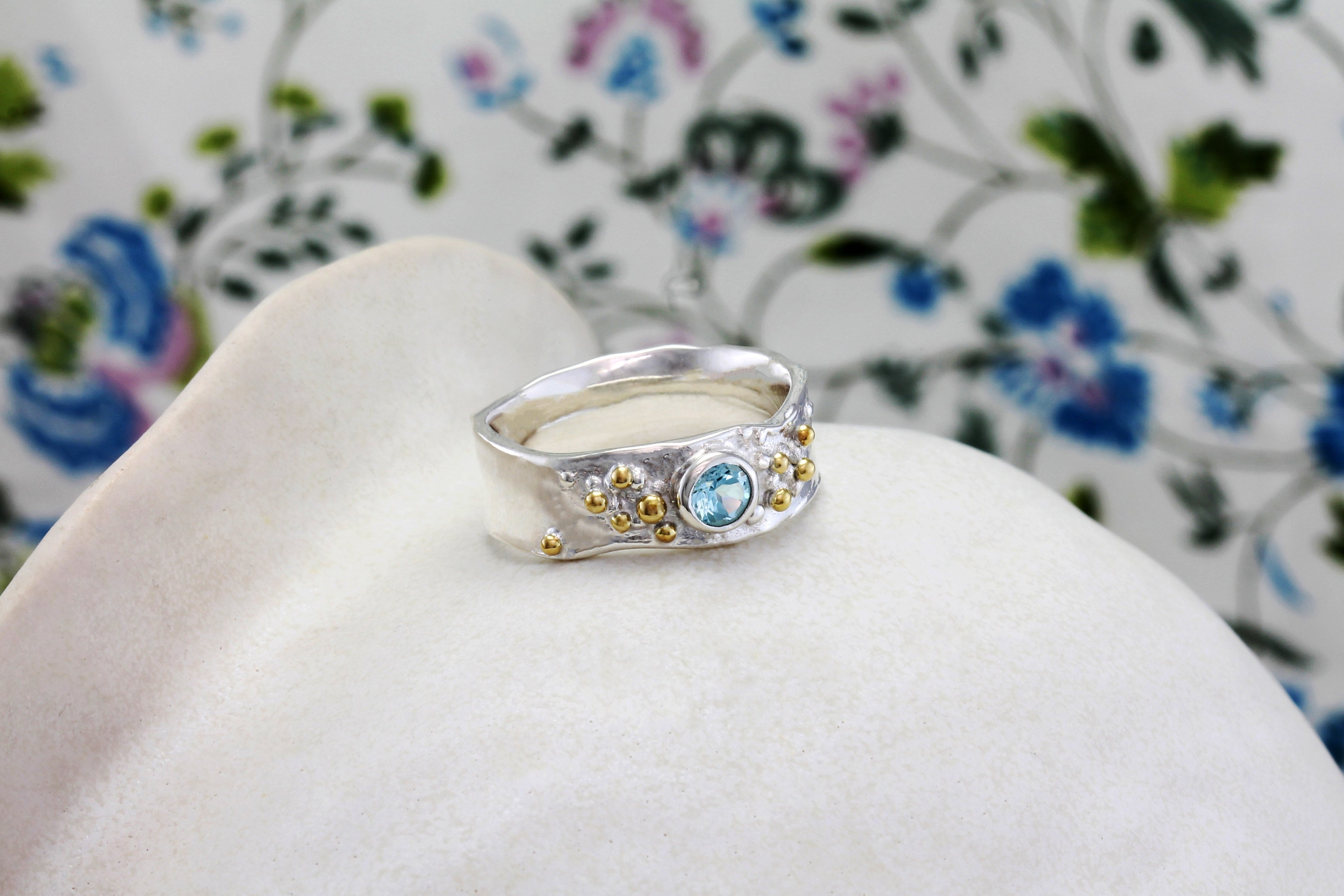 A statement ring with a daintier touch. Featuring sparkling Blue Topaz and intricate ball details, it's truly a unique ring that has been handcrafted to withstand daily wear, whether that's in the office or diving in for a refreshing sea dip on holiday.