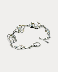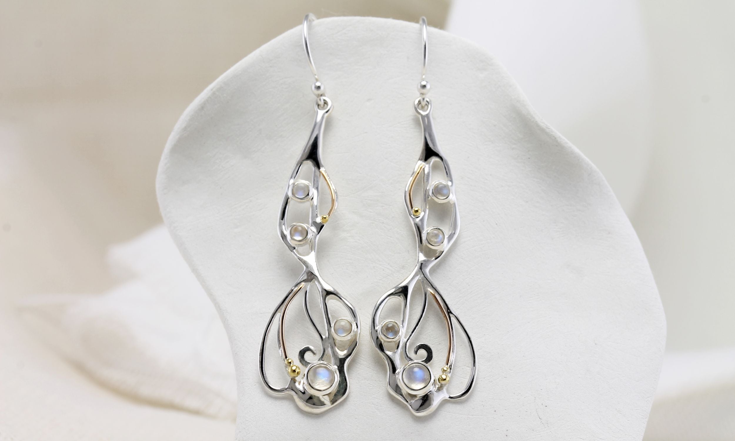 Our eye-catching Moonstone organic flow statement earrings are perfect for weddings or any special event in your life. Handcrafted from Sterling Silver to form an organic flowing design that is set with beautiful rainbow Moonstones and finished with our signature details of 14KT Gold.