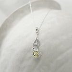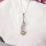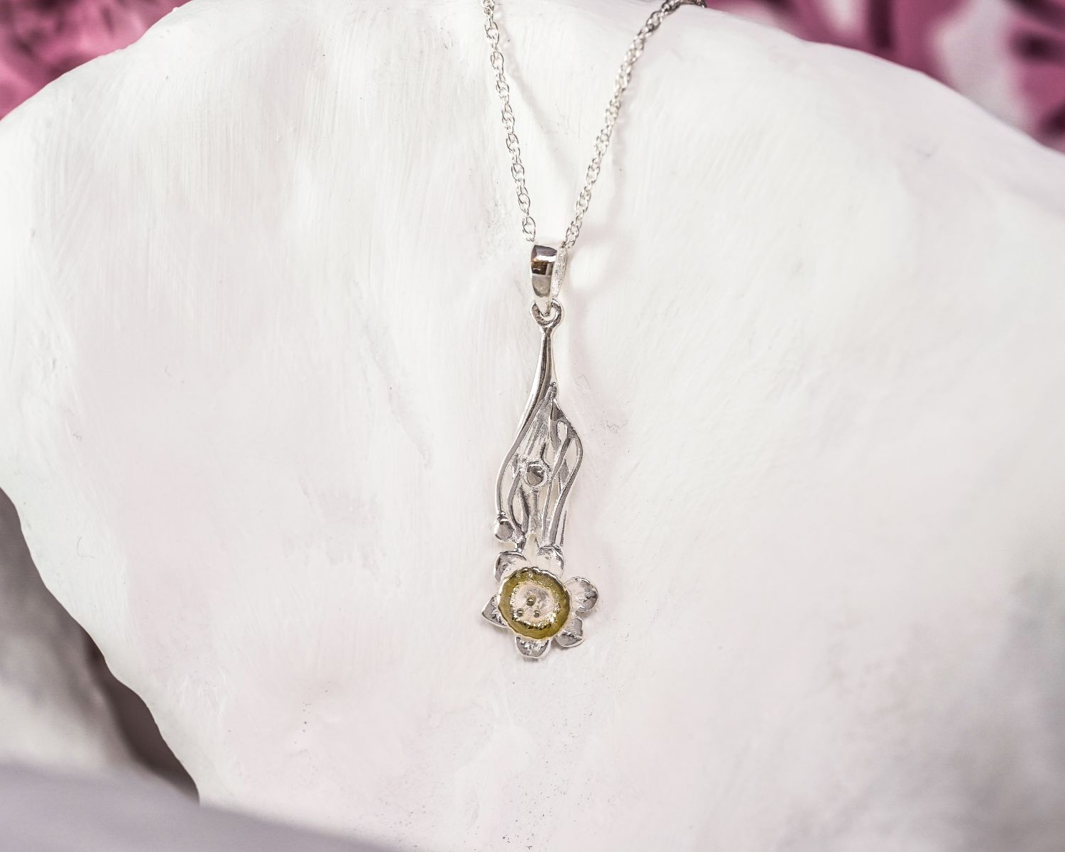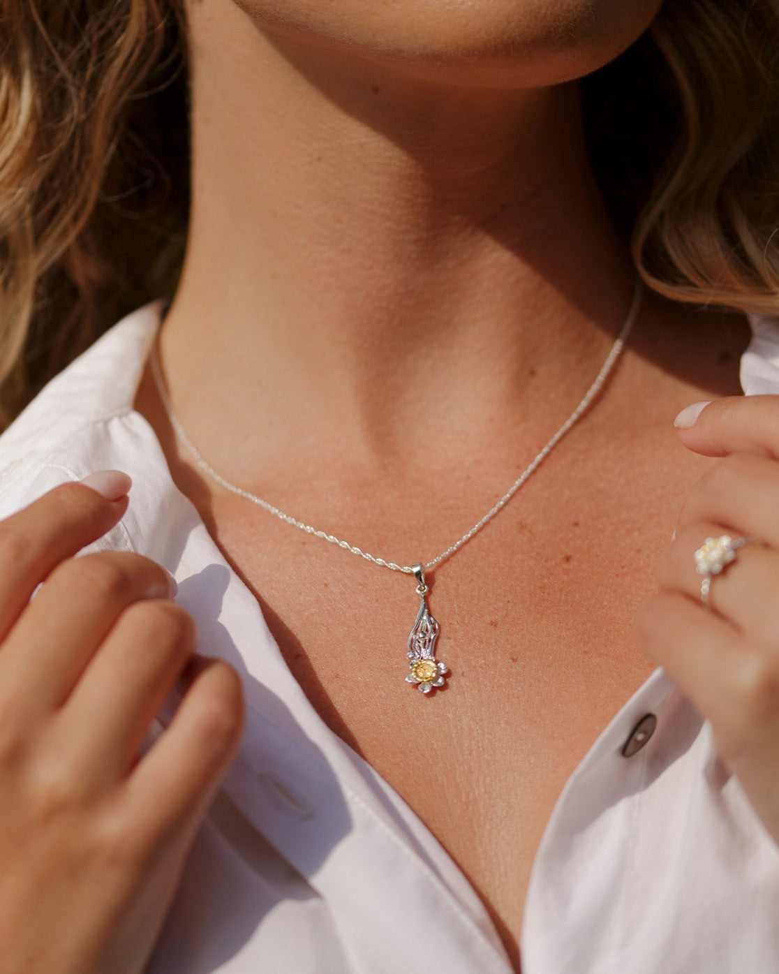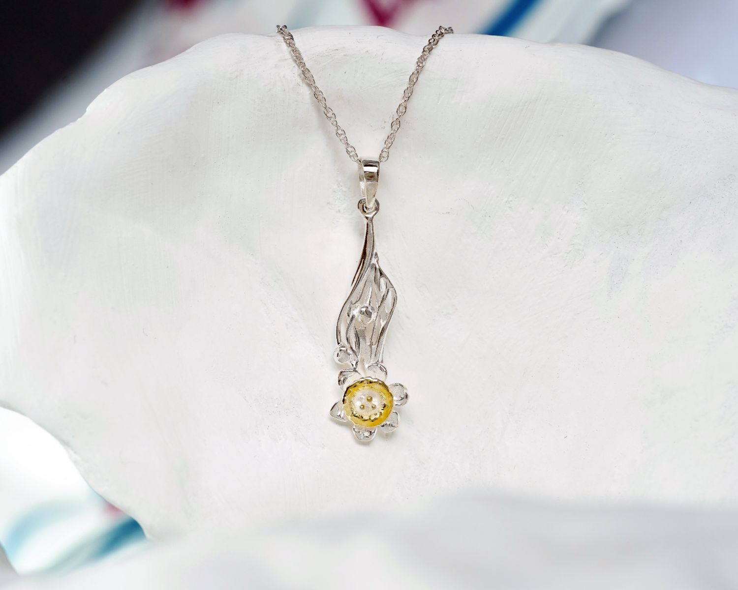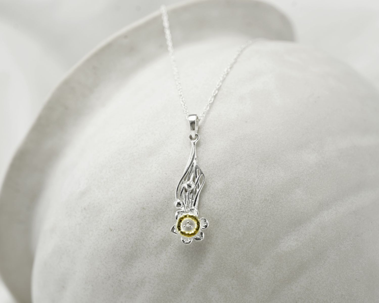 Handcrafted with meticulous attention to detail, this Sterling Silver pendant features delicate petals embracing a resplendent 18KT Gold centre, creating a captivating daffodil bloom. The larger Gold centre serves as a radiant focal point, adding a touch of opulence to the gracefully crafted floral design.
