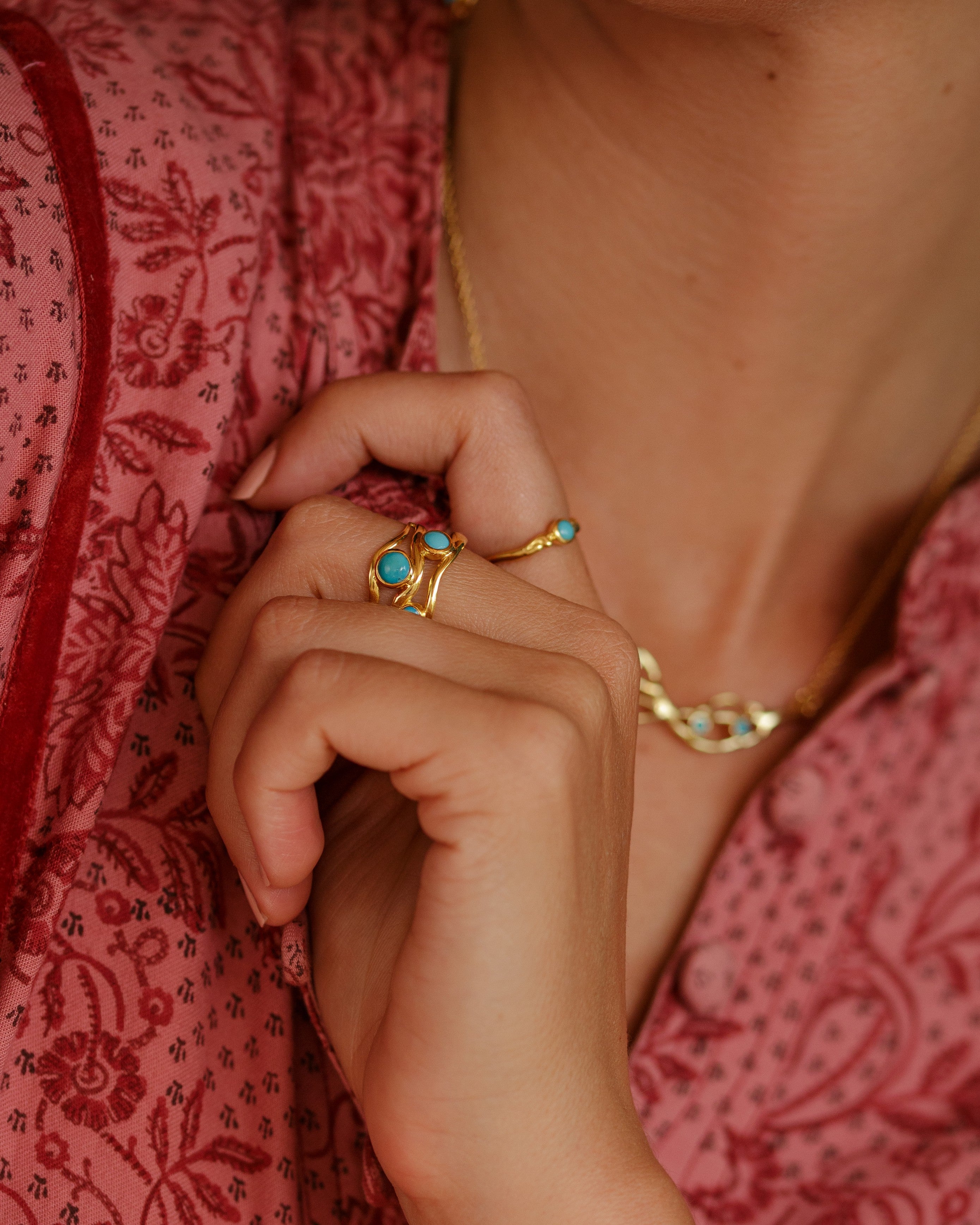 This dainty ring features a flowing Gold Vermeil design and a tiny, bright blue American Turquoise gemstone. Whether stacked up with your other rings or worn alone, it's eye-catching colours make this ring the perfect addition to any jewellery collection.