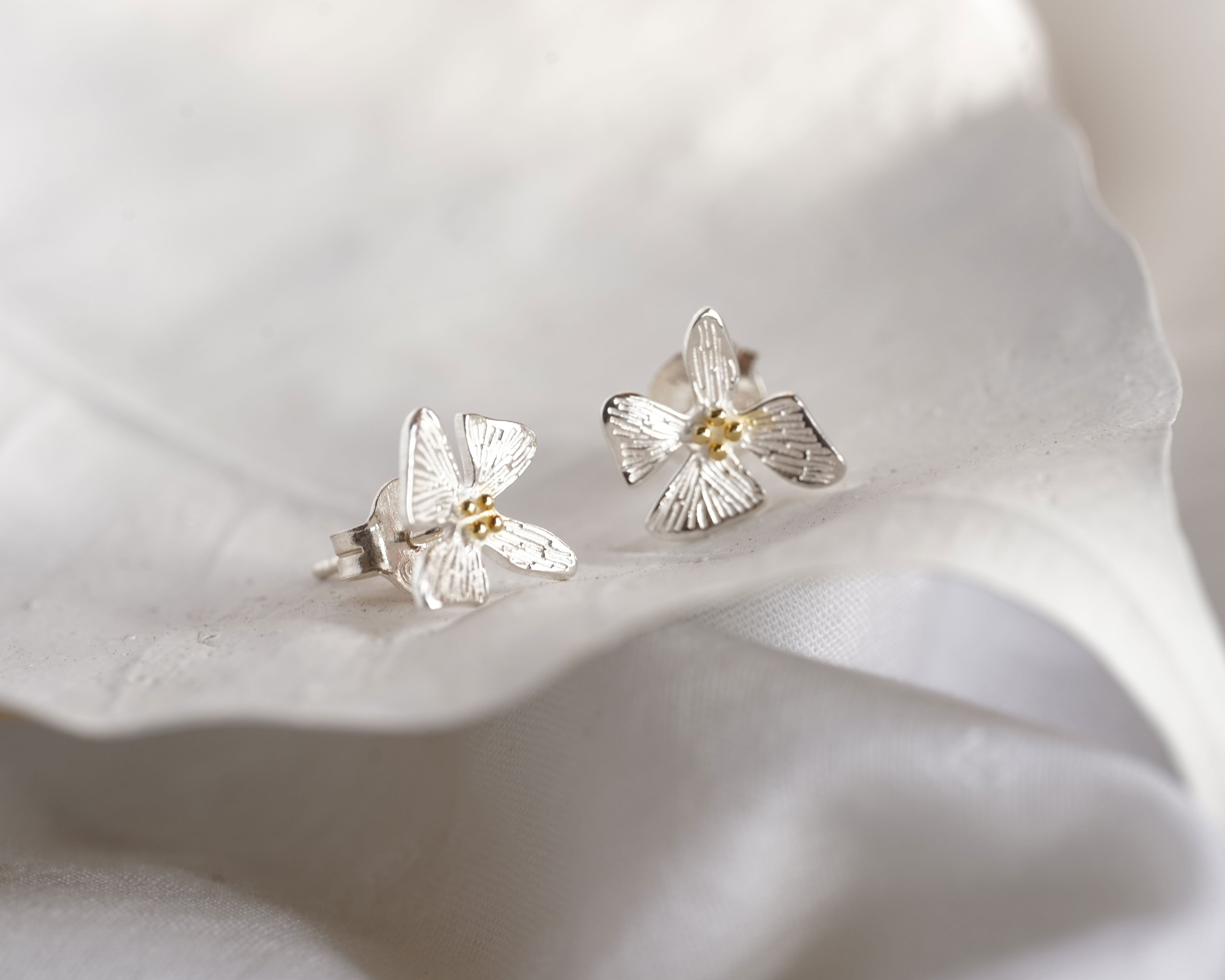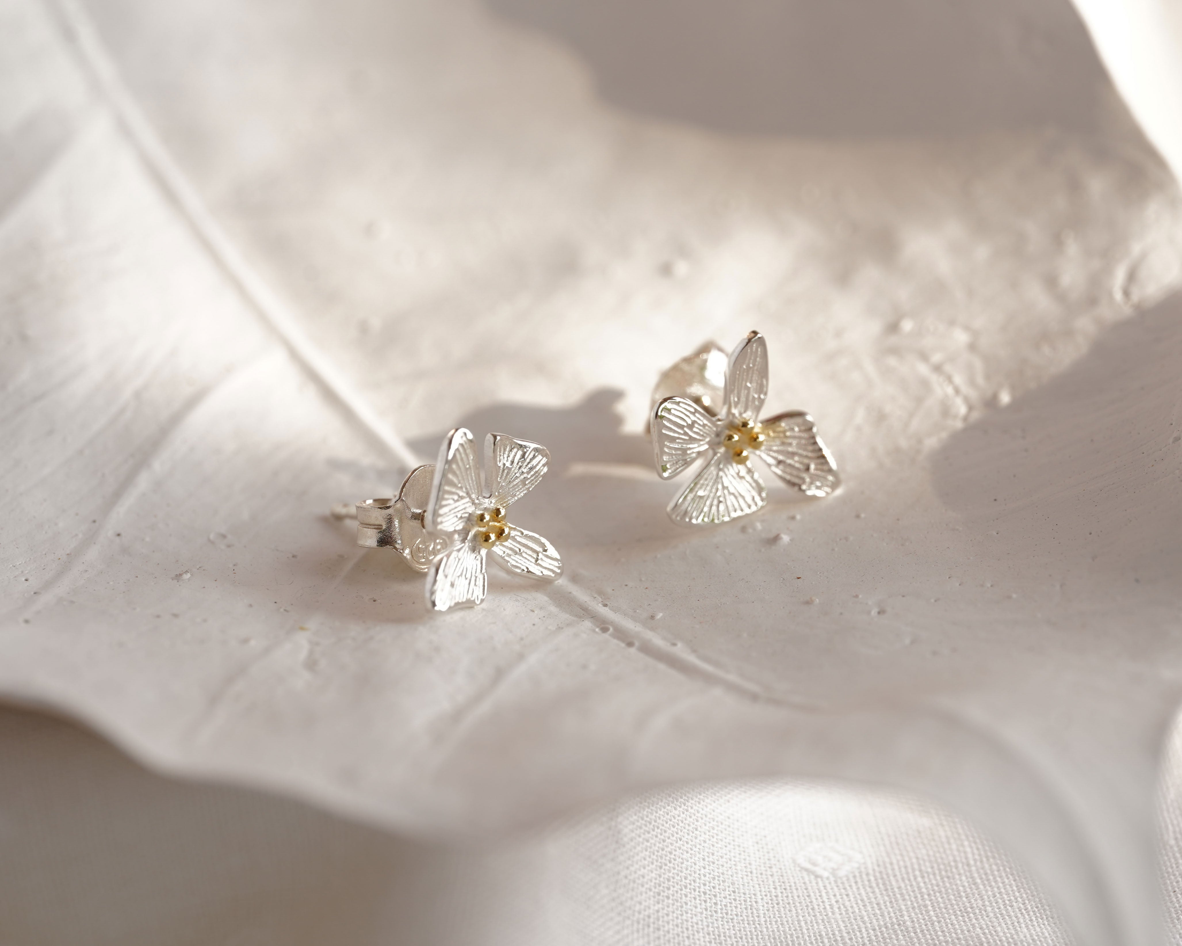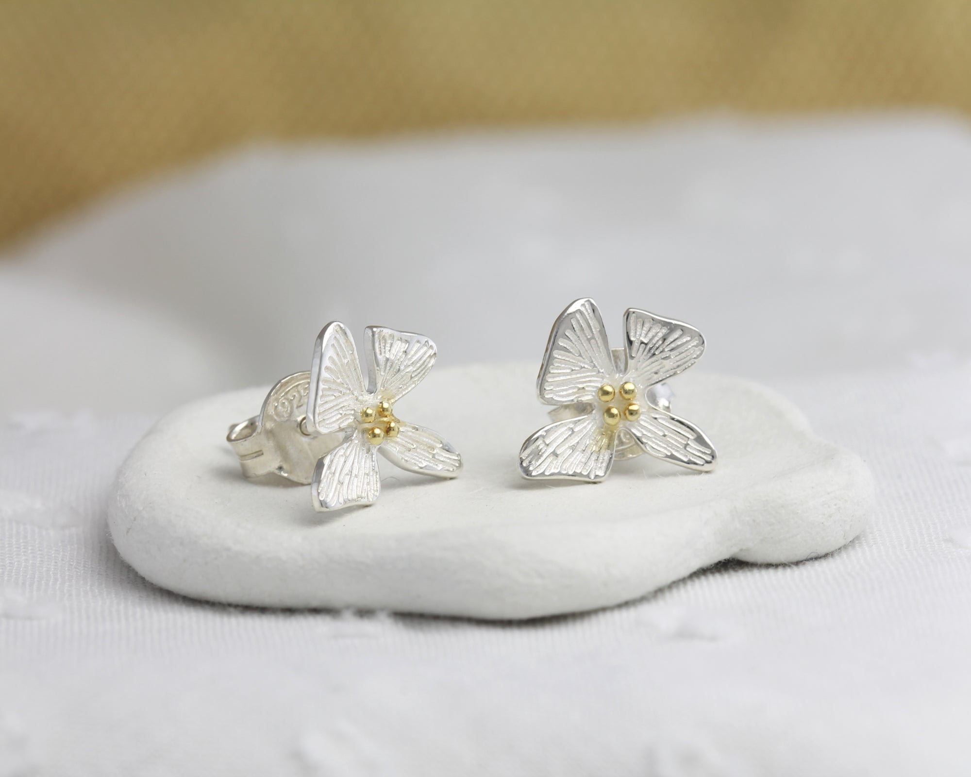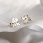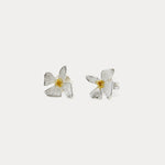 These dainty stud earrings are crafted in a uniquely beautiful flower design. The sterling silver petals feature intricate detailing, complimented with 18KT gold plated pips in the centre.