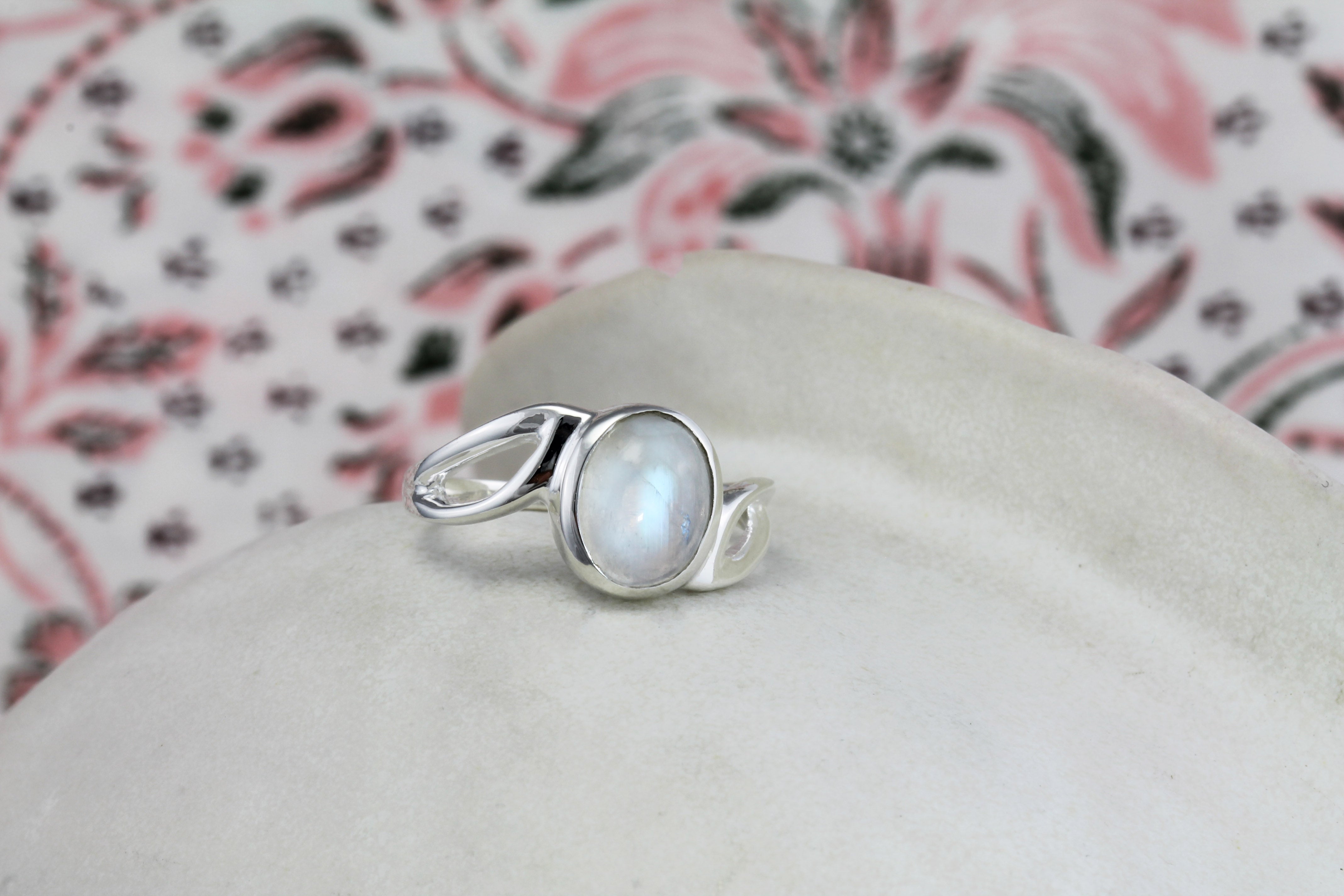 This beautifully handcrafted Sterling Silver ring boasts a mesmerising Rainbow Moonstone, which radiates with quiet grace, symbolising positivity and femininity for the wearer.