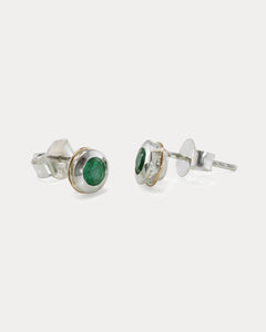 A slender handcrafted Sterling Silver ring with a radiant Emerald at its centre. This dainty ring is also adorned with light detailing of 14KT Gold, making it an intricate piece perfect for everyday wear. This piece was crafted from our unique wax form, it features curving silver and pip details.