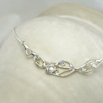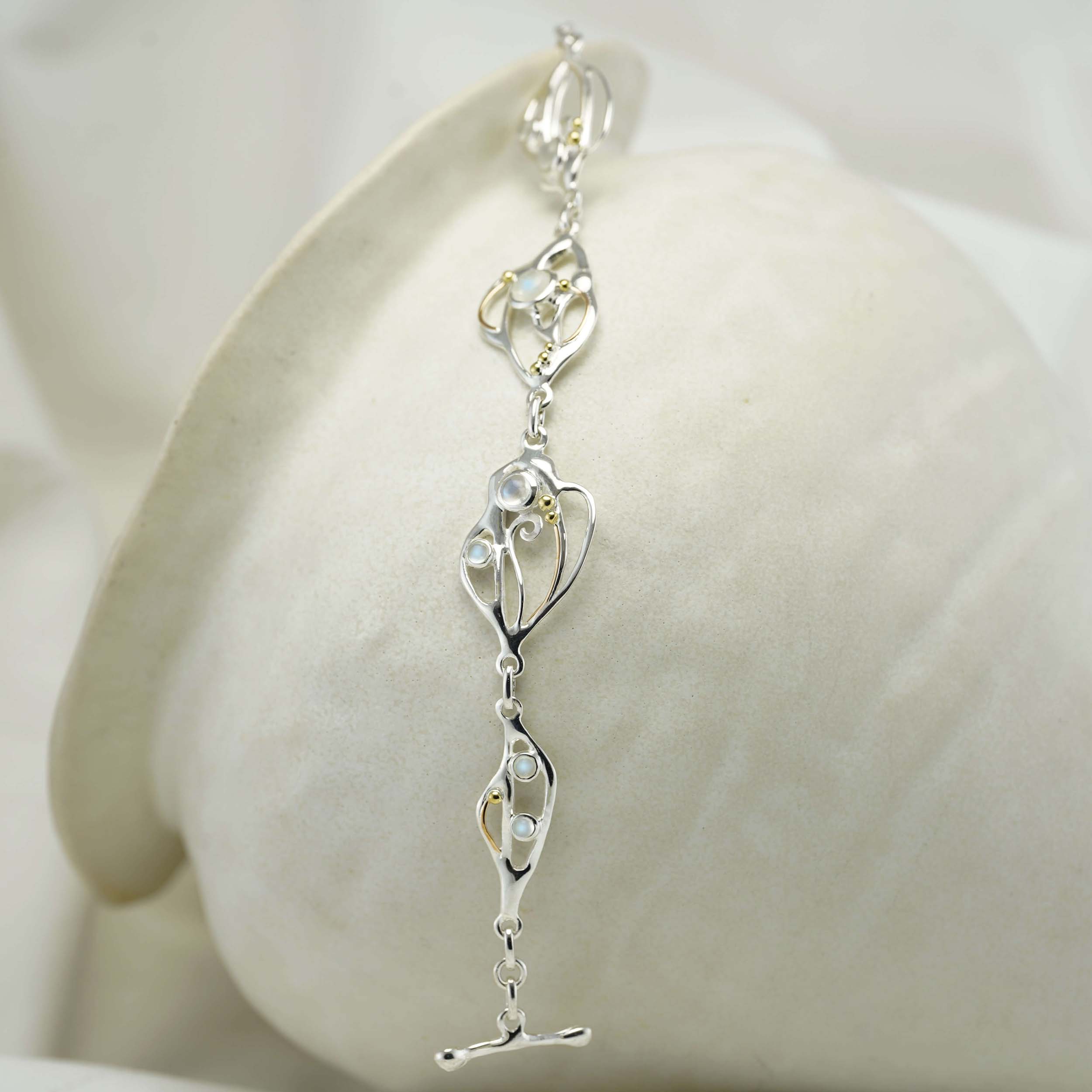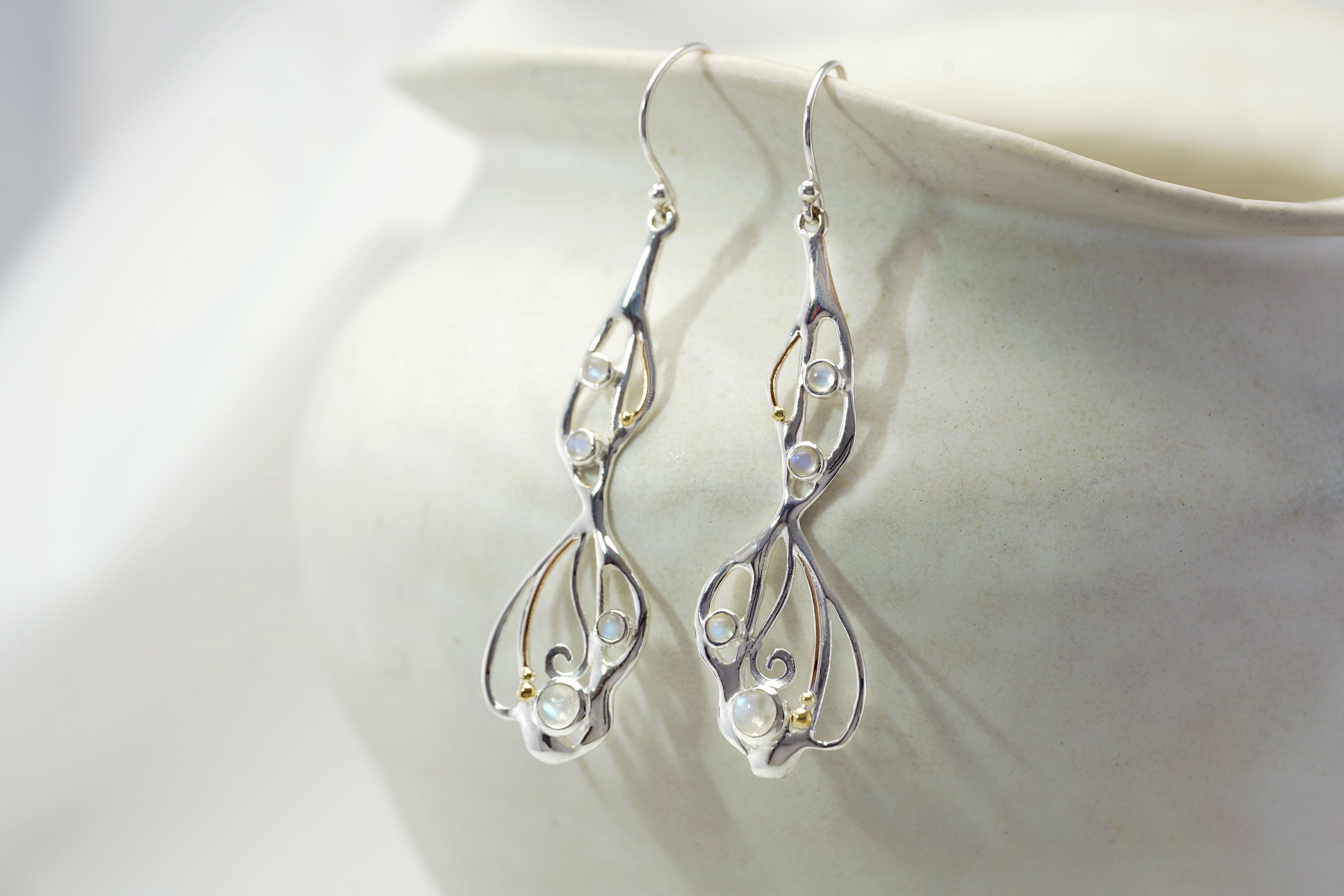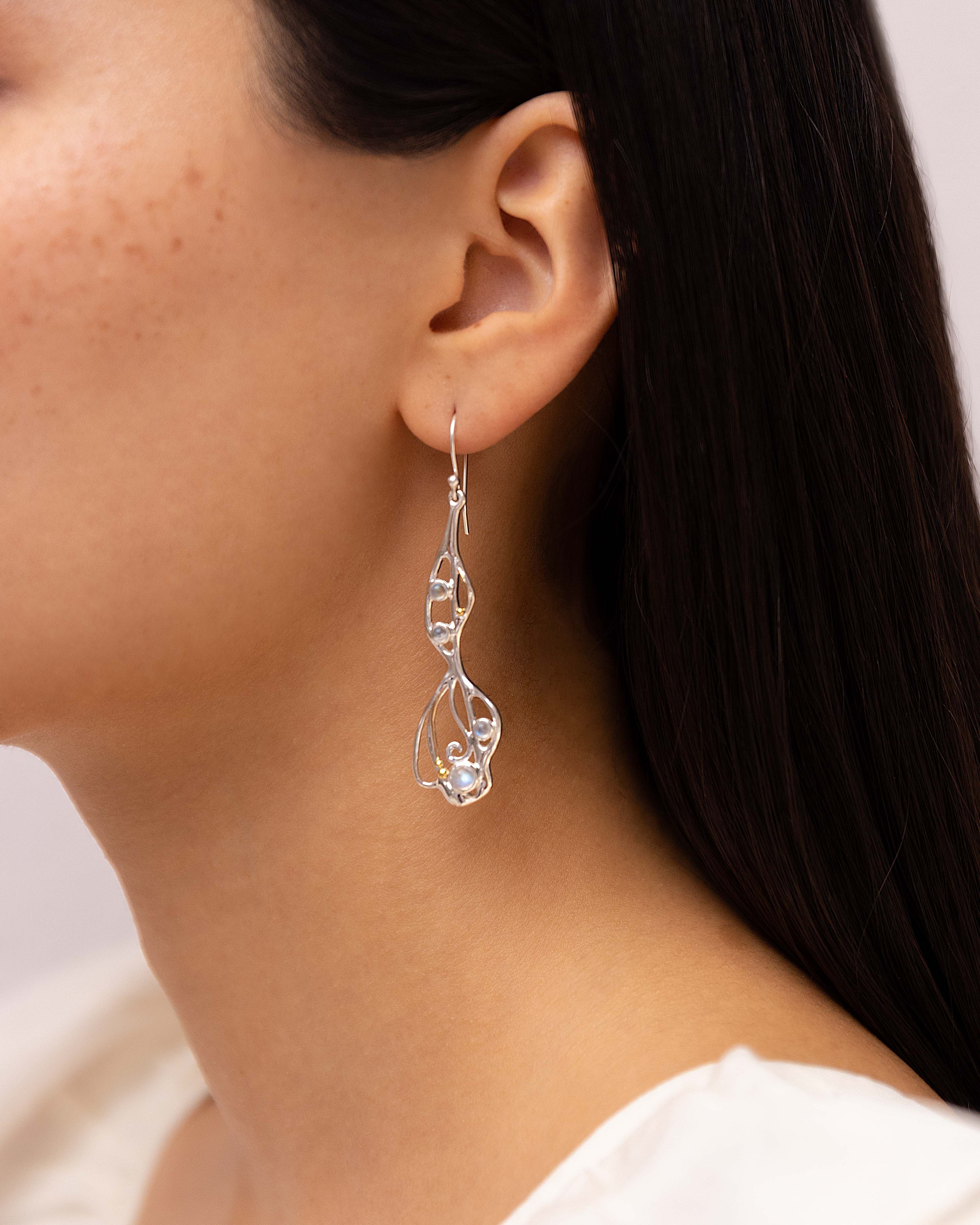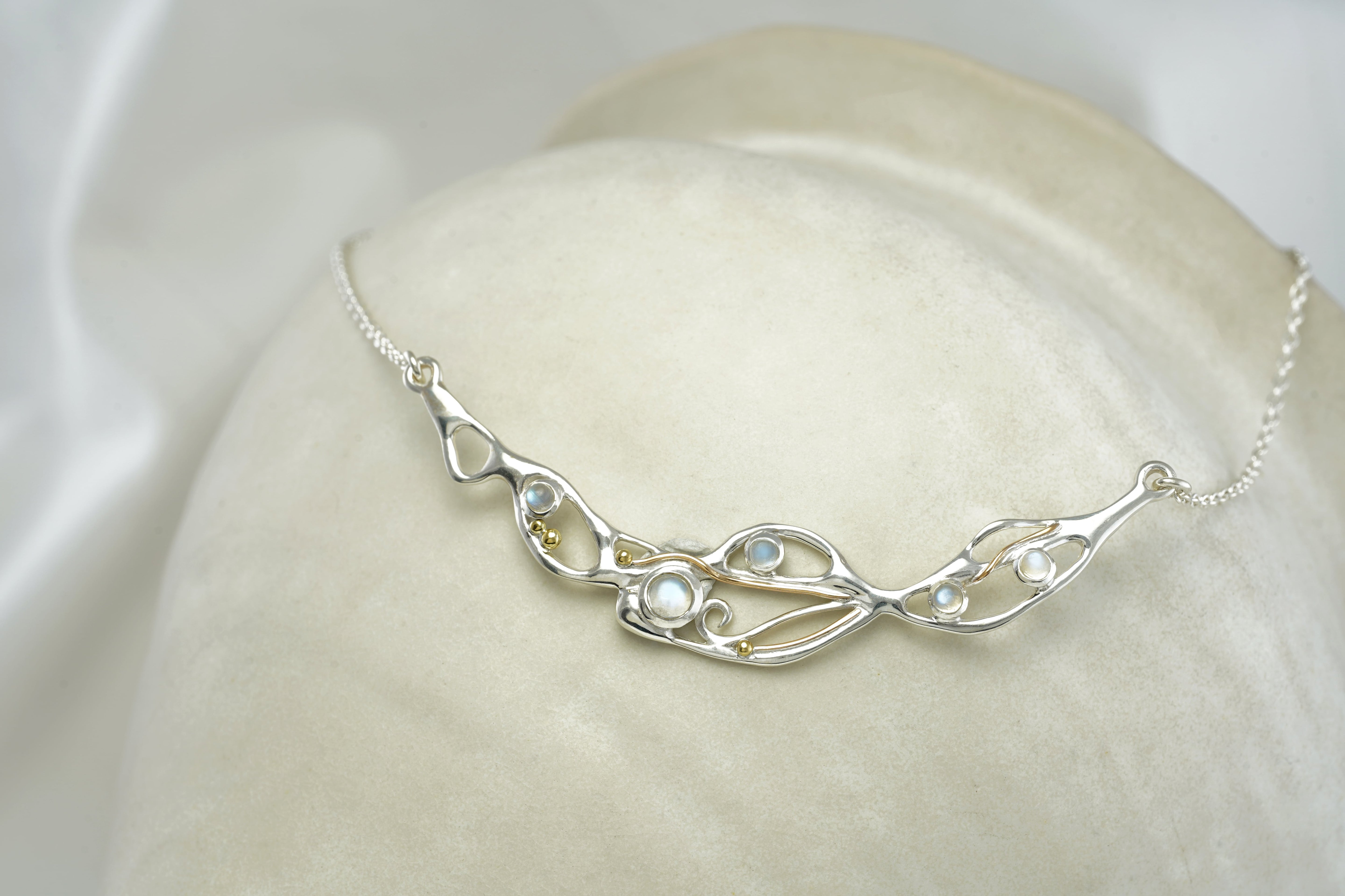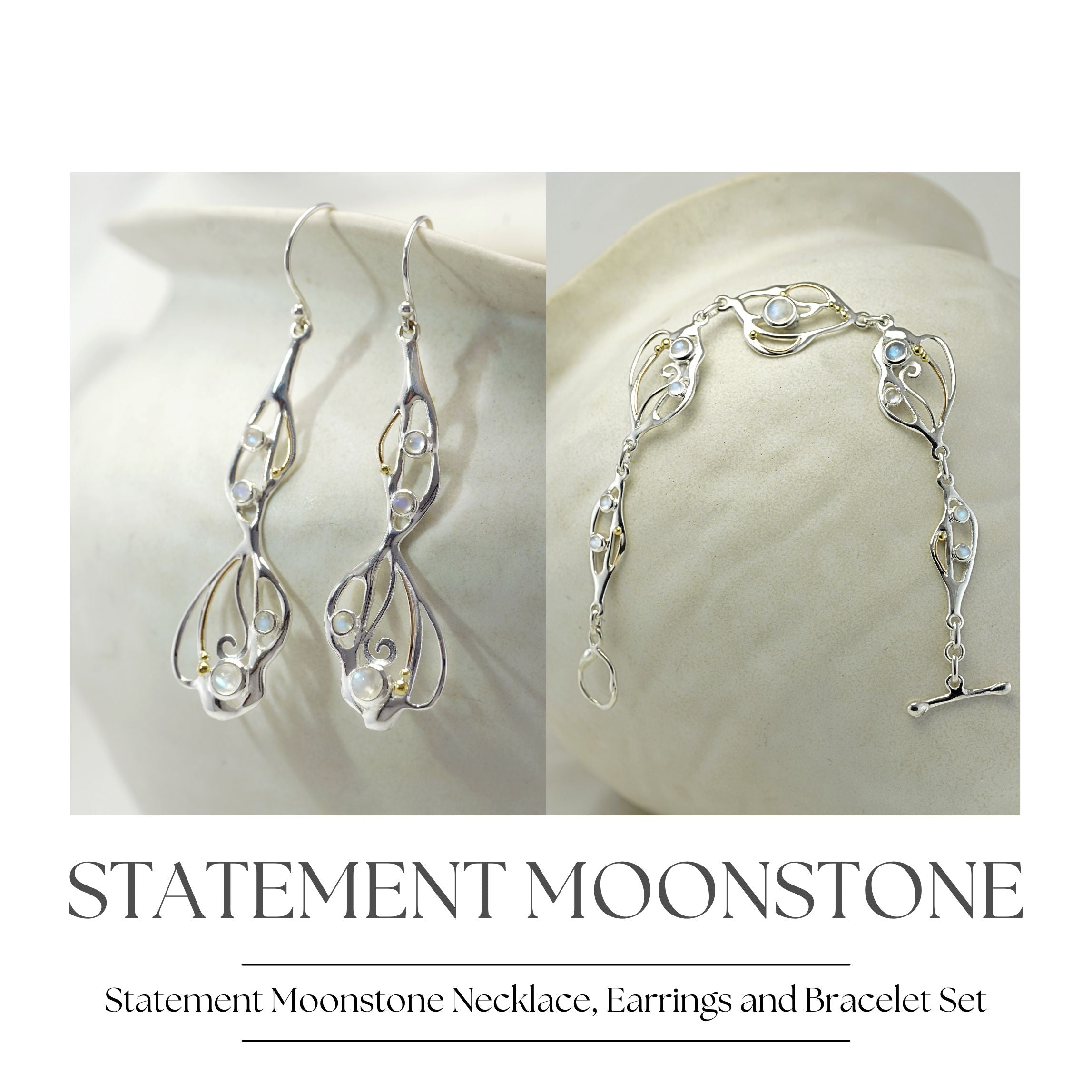 Our eye-catching, flowing Moonstone set includes a statement necklace, earrings and bracelet, making a perfect set paired together or worn individually. If you're looking for a thoughtful gift we think these radiant Moonstones are the perfect fit. The jewellery is handcrafted from Sterling Silver to form an organic flowing design, that is set with beautiful rainbow Moonstones, and finished with our signature of 14KT Gold detail.