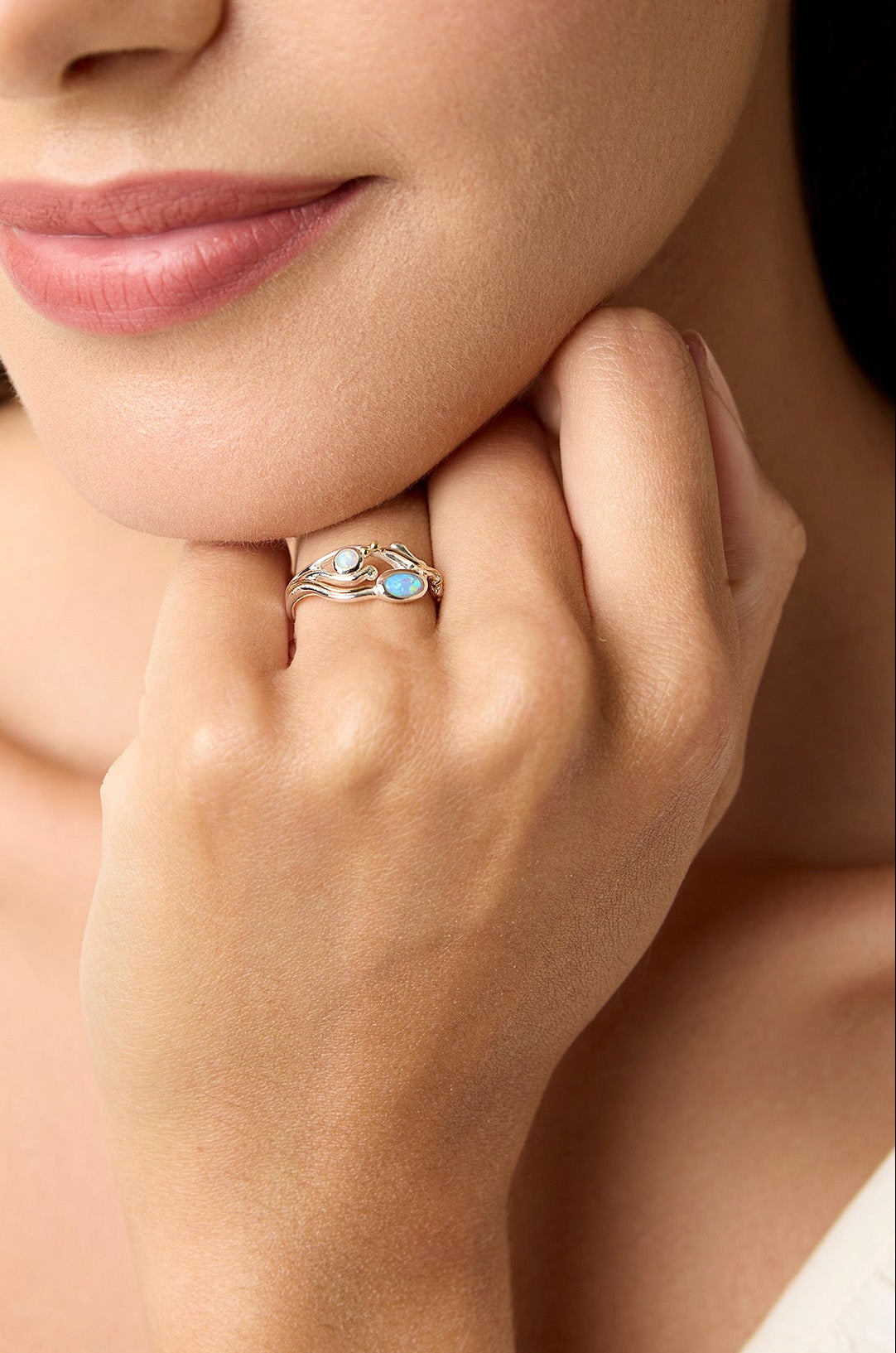 Featuring captivating blue and white Fire Opals, this dainty ring offers a flowing design that is handcrafted from Sterling Silver and 14KT Gold.