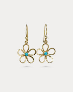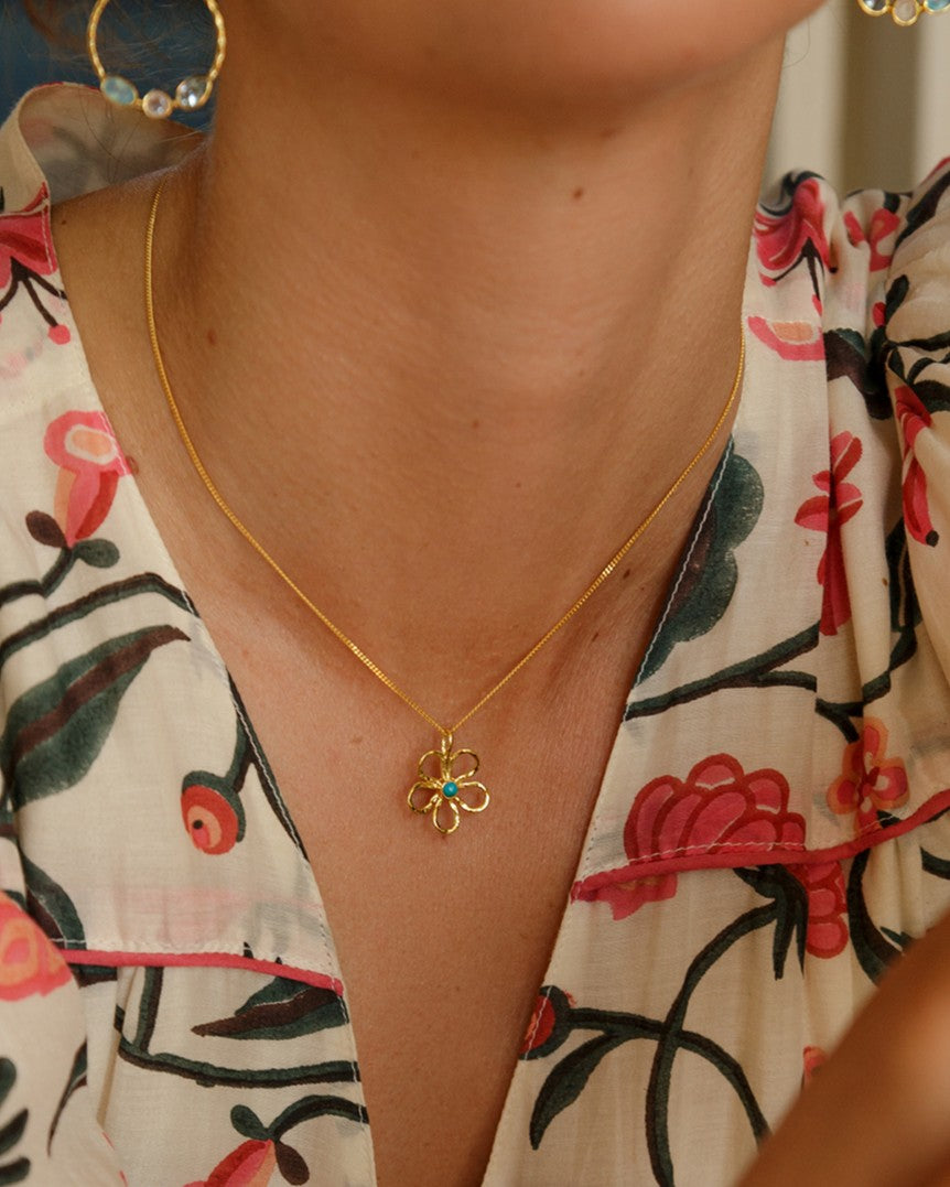 This dainty pendant is handcrafted from 18KT Gold Vermeil. It features a lightly hammered flower design and in it's centre, a small round American Turquoise. The blue and gold perfectly complement each other, especially when paired with our matching earrings.