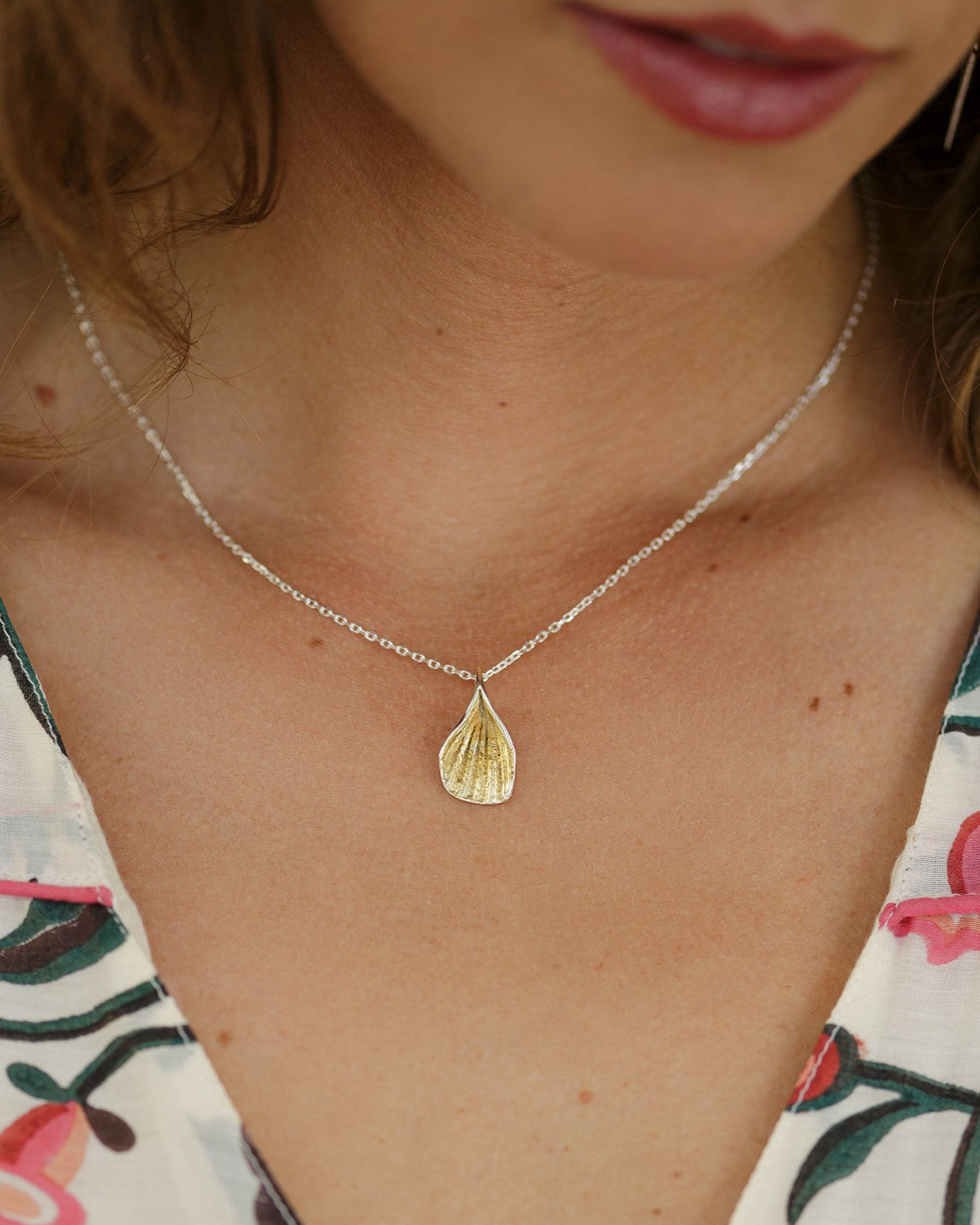 This beautiful Gold necklace features a unique shell design. Complimented with Sterling Silver details, the Gold has an eye-catching appeal. Perfect for any beach lover, this handcrafted necklace also has a matching earrings set, making it the perfect gift.