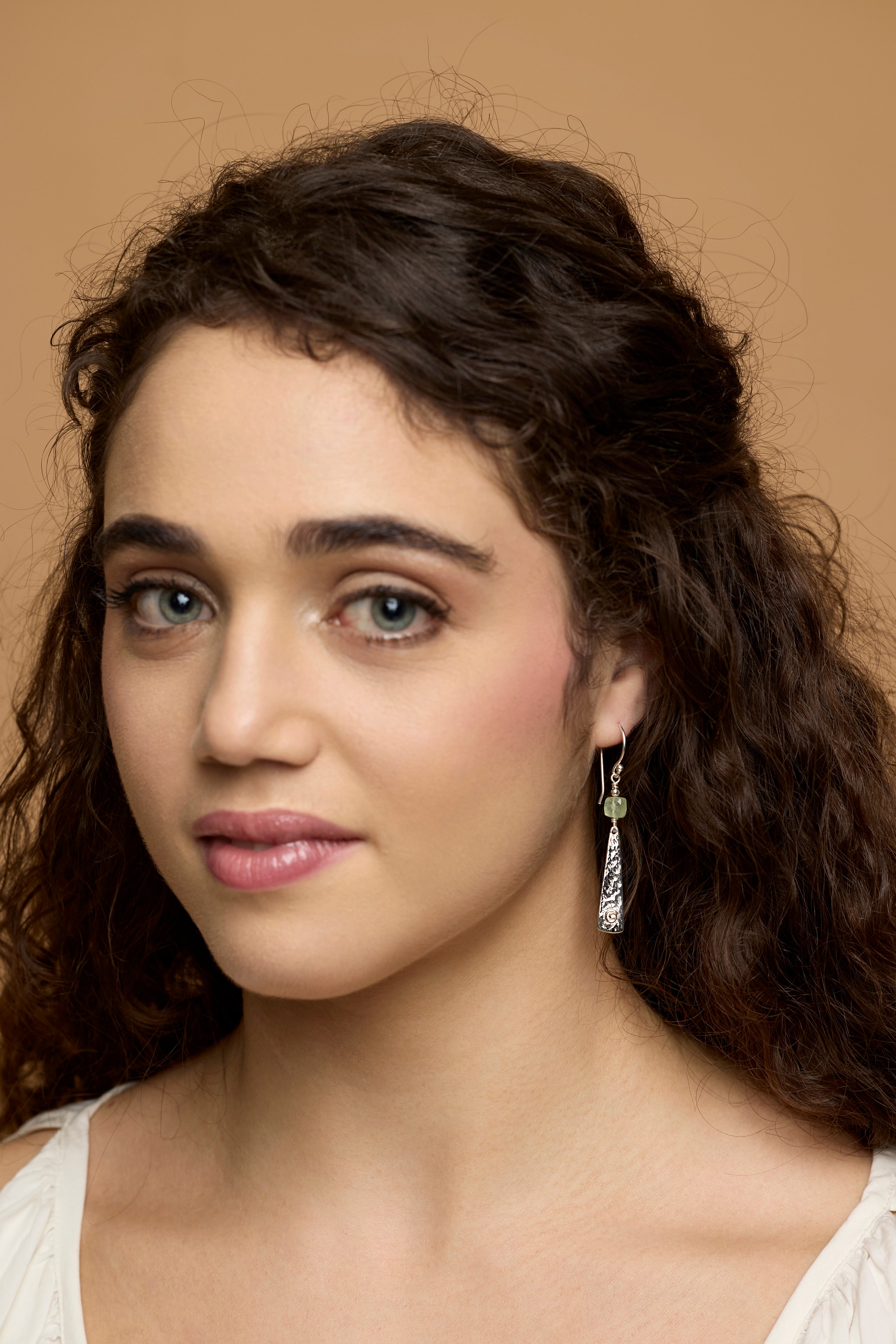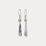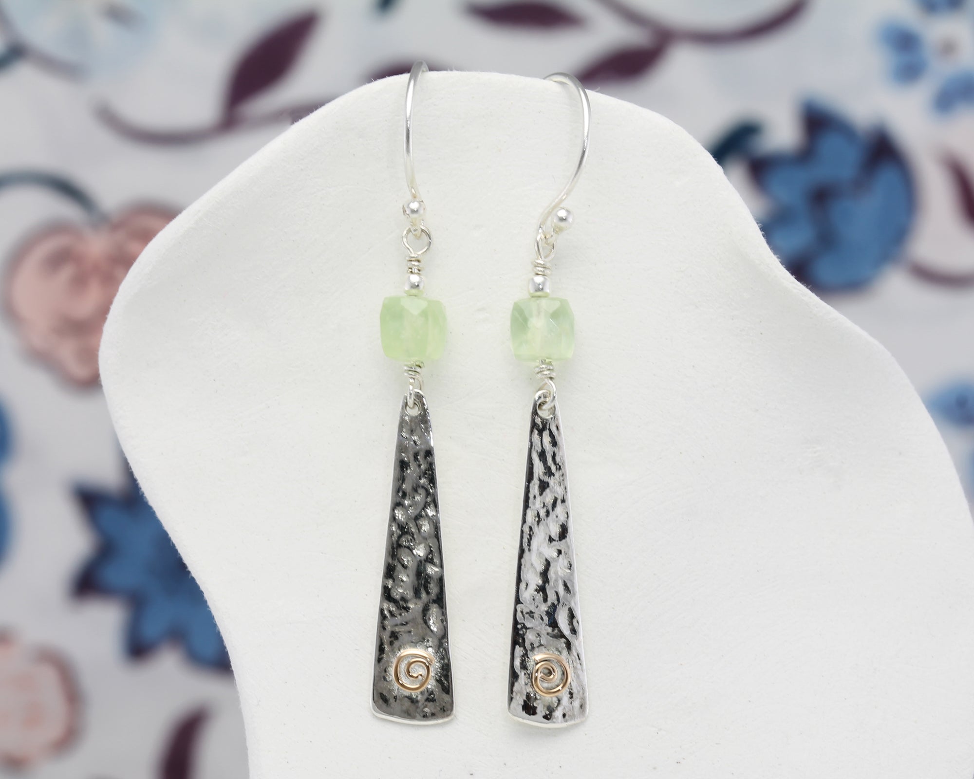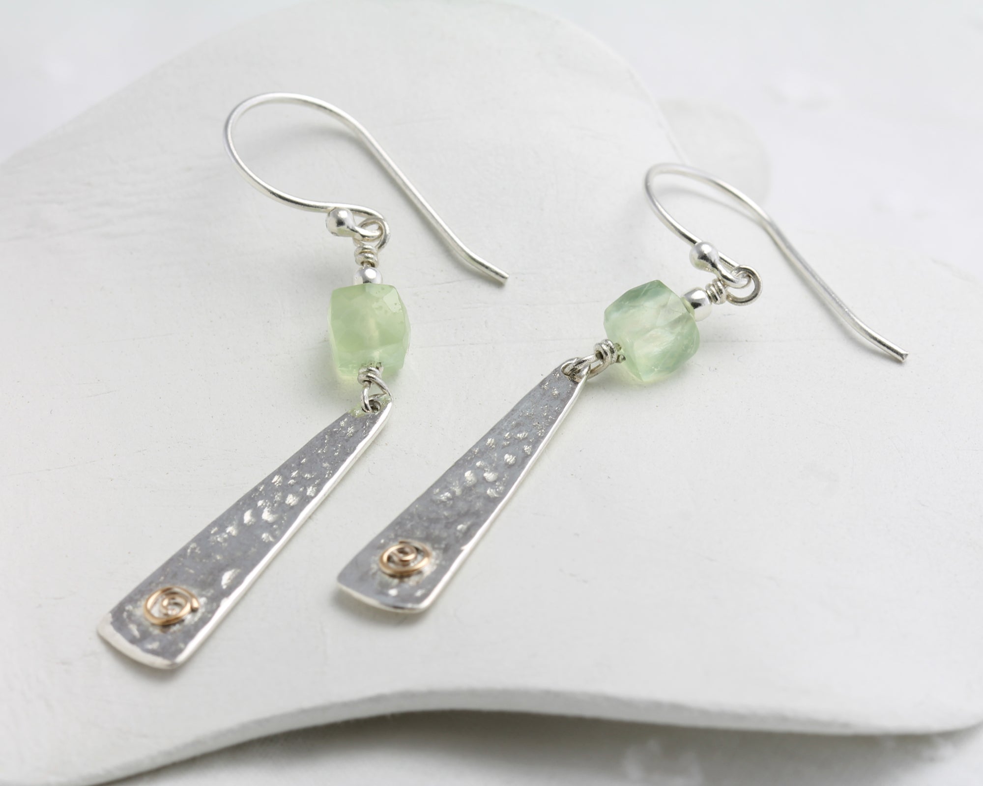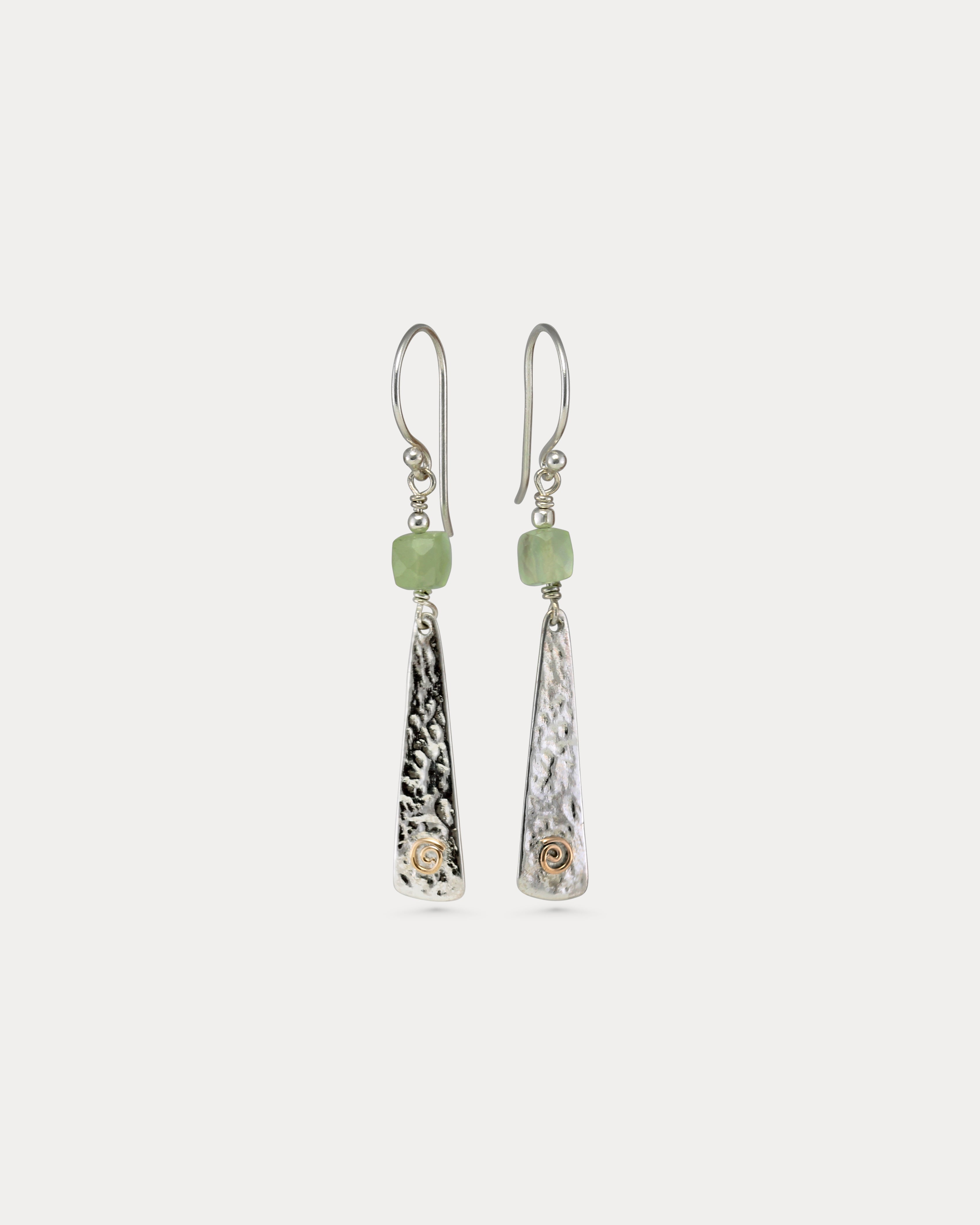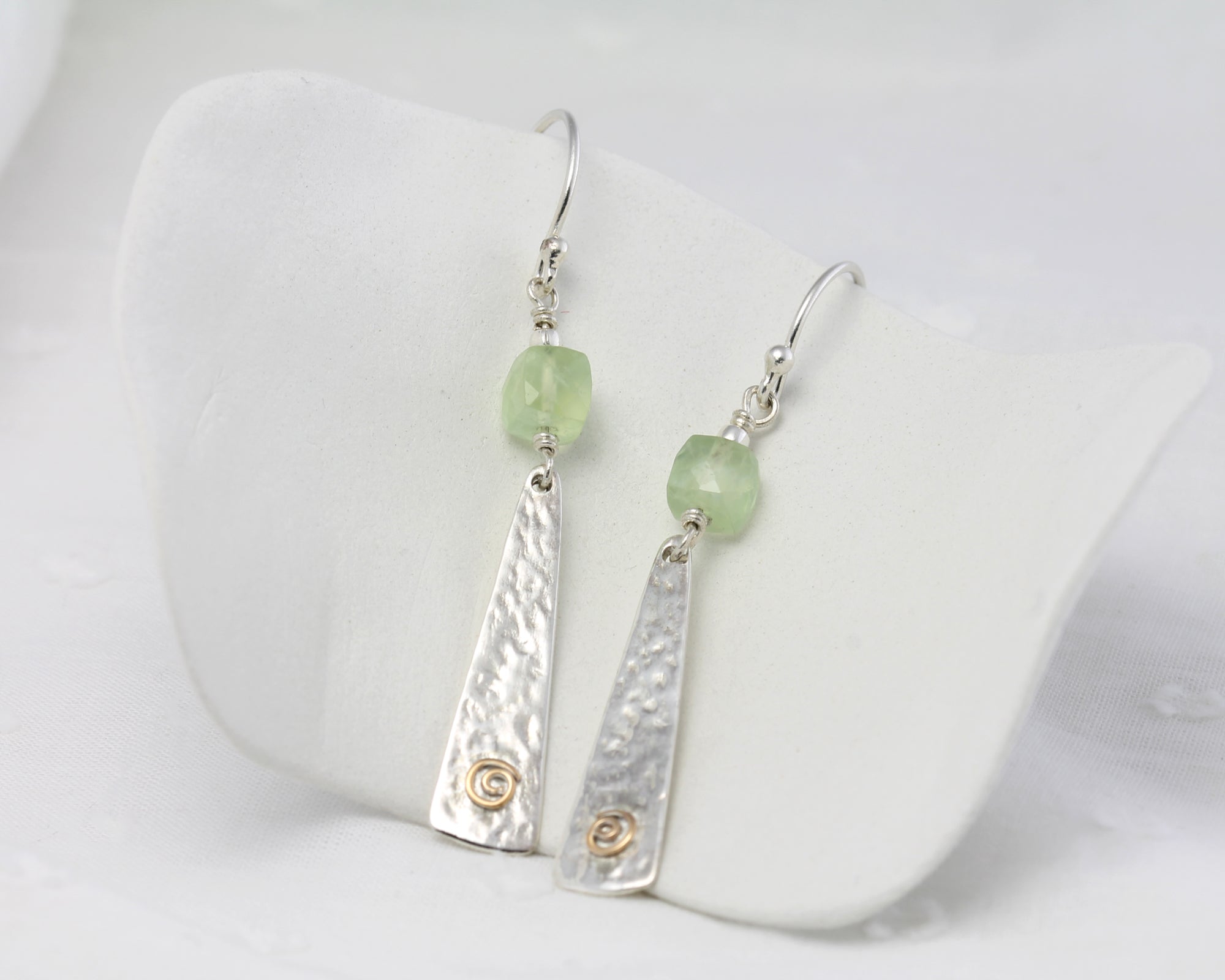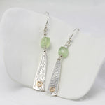 A pair of handcrafted Sterling Silver drop earrings, featuring soft green Prehnite stones and 14KT Gold fill detailing.