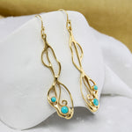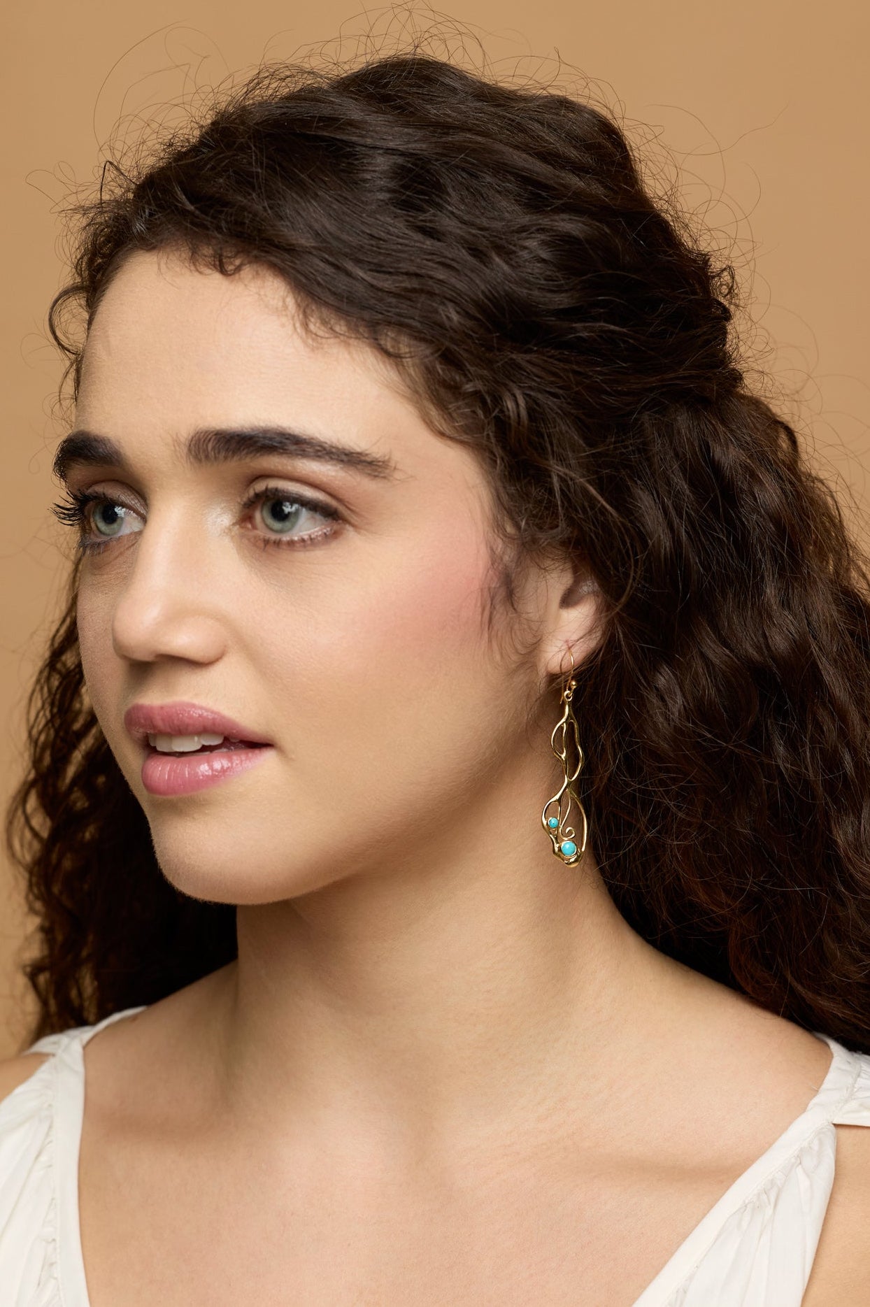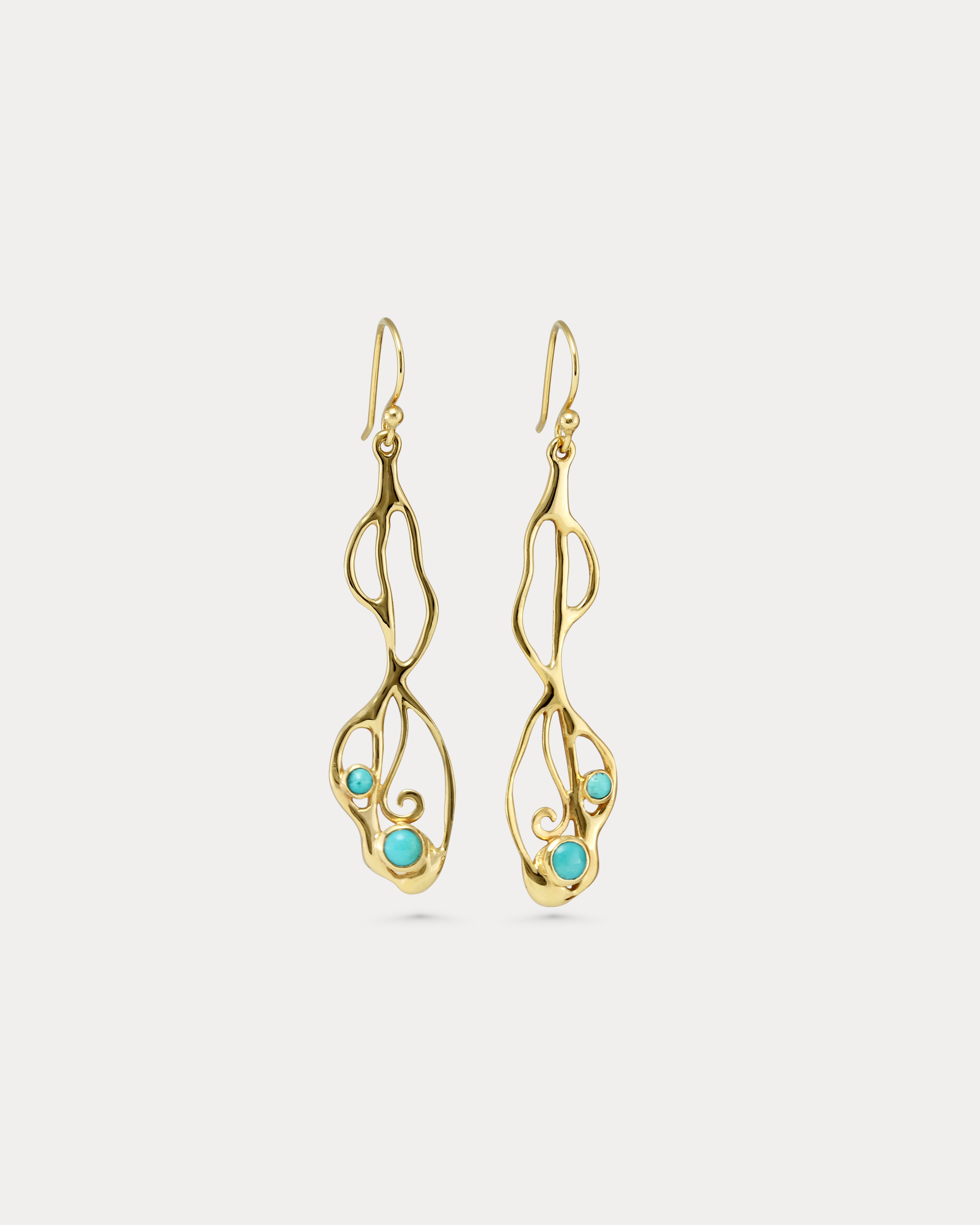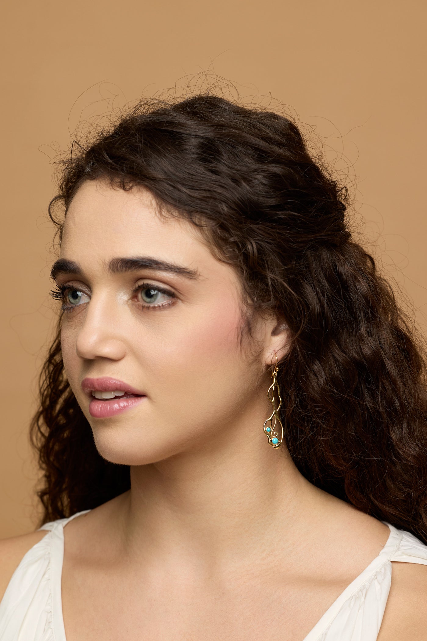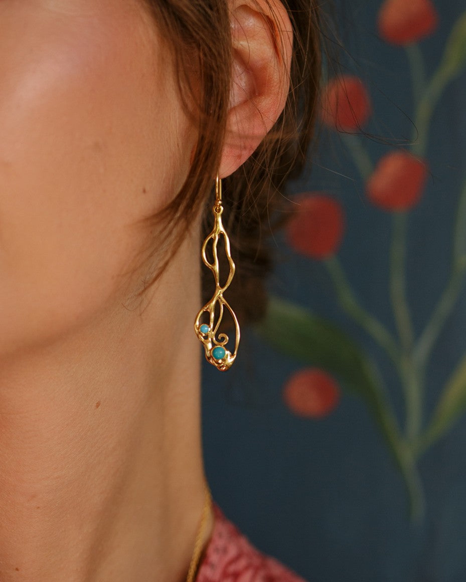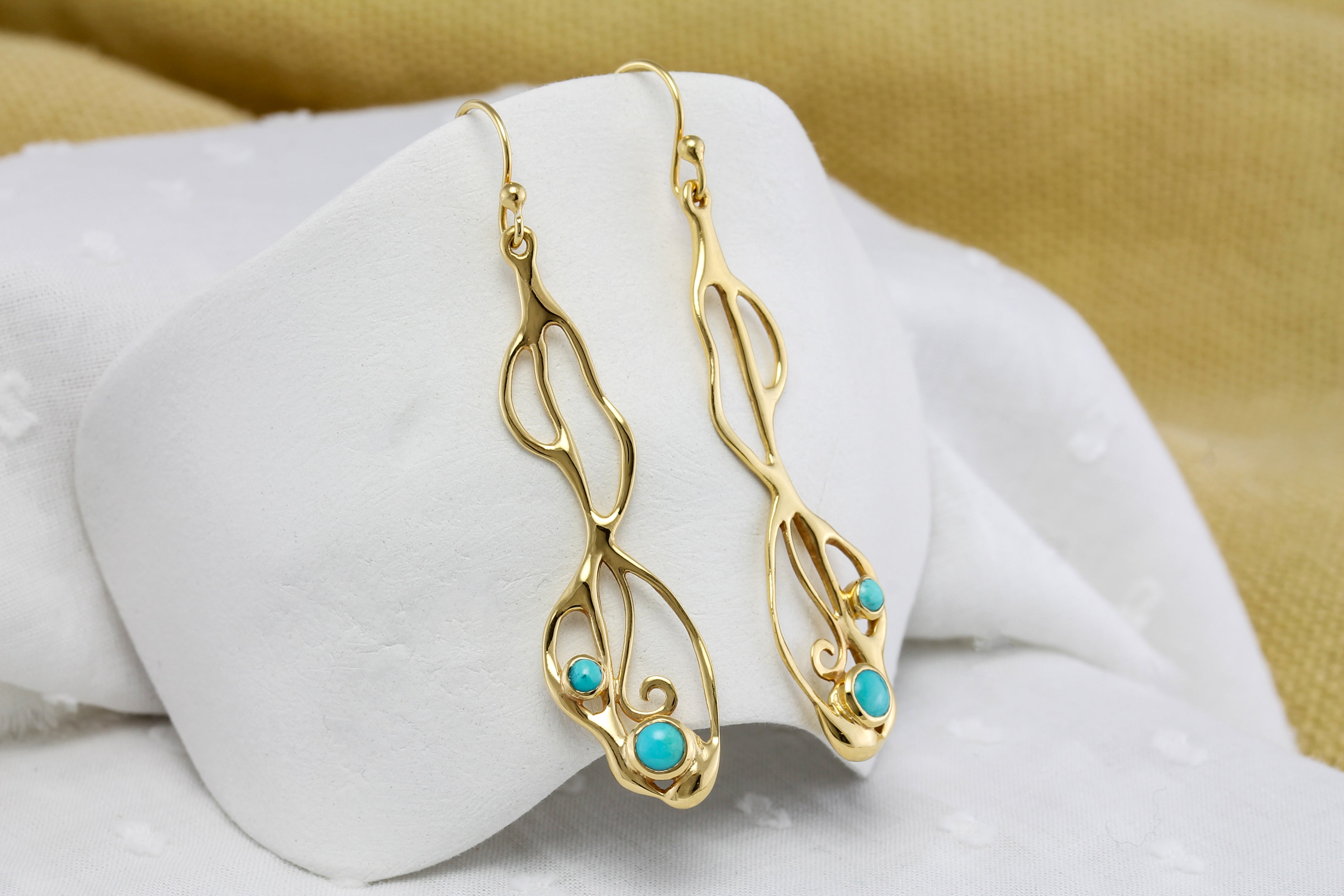 These handmade 18KT Gold Vermeil earrings with fluid, organic detailing feature American Turquoise stones that bring a beautiful burst of colour. The warm Gold setting flows with delicate artistry, creating a striking contrast against the vibrant turquoise. With their graceful drop silhouette, they make an elegant and refined statement.