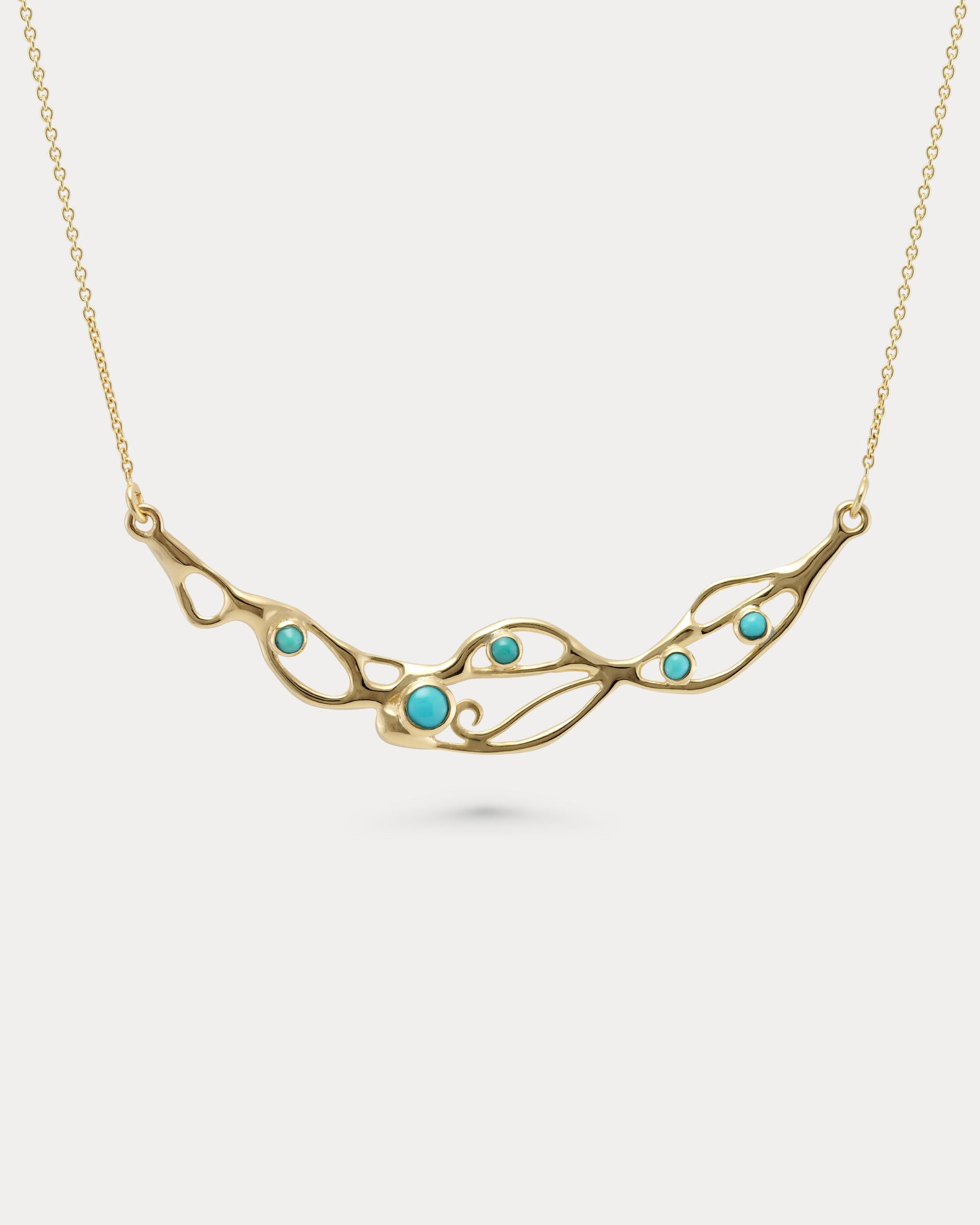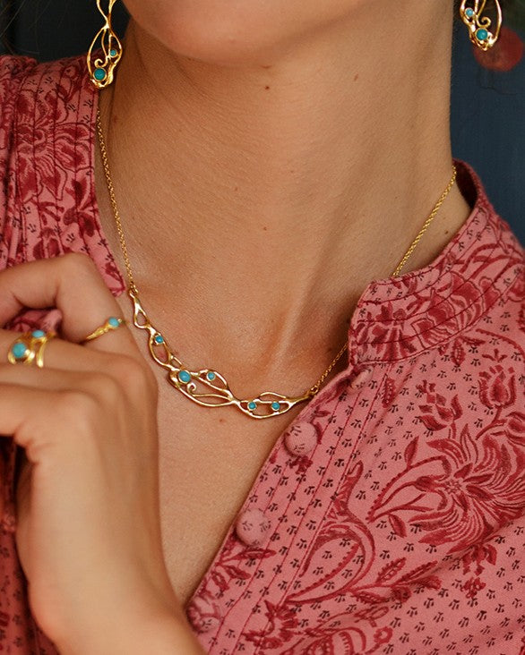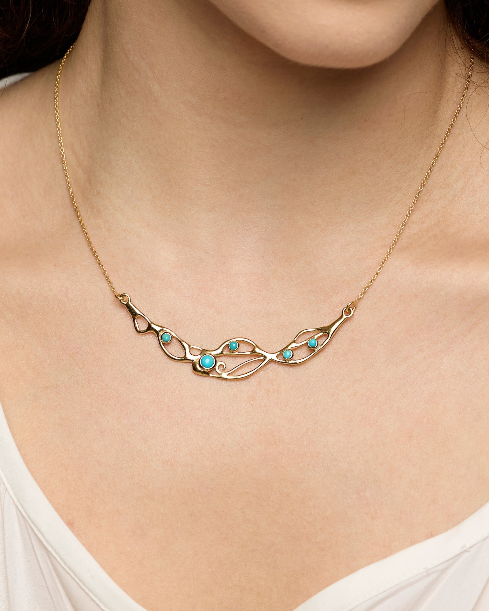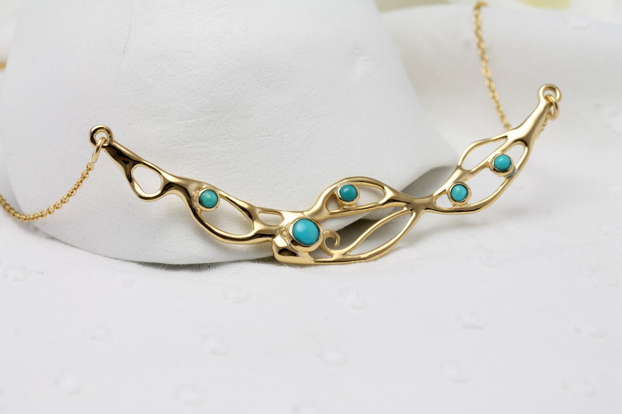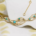 This necklace carries an organic elegance that feels both contemporary and timeless. The setting flows with delicate detail, while five American Turquoise stones bring a beautiful contrast to the warmth of the Gold. With an adjustable chain, this necklace makes a beautiful statement on its own and is effortlessly versatile for everyday wear.
