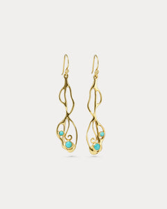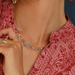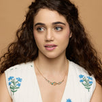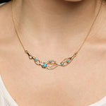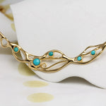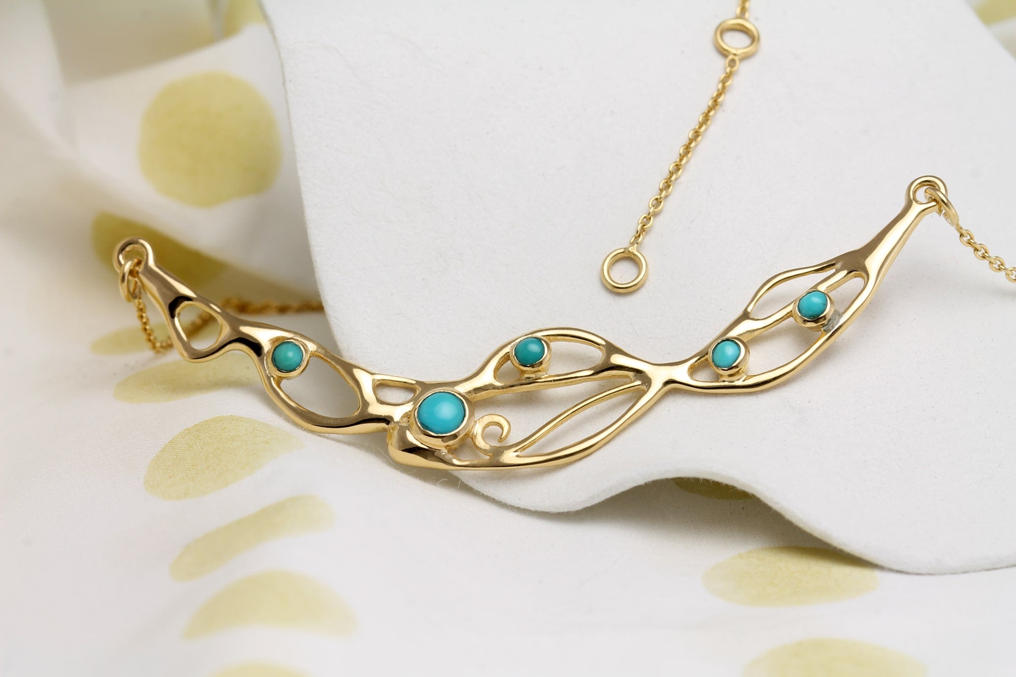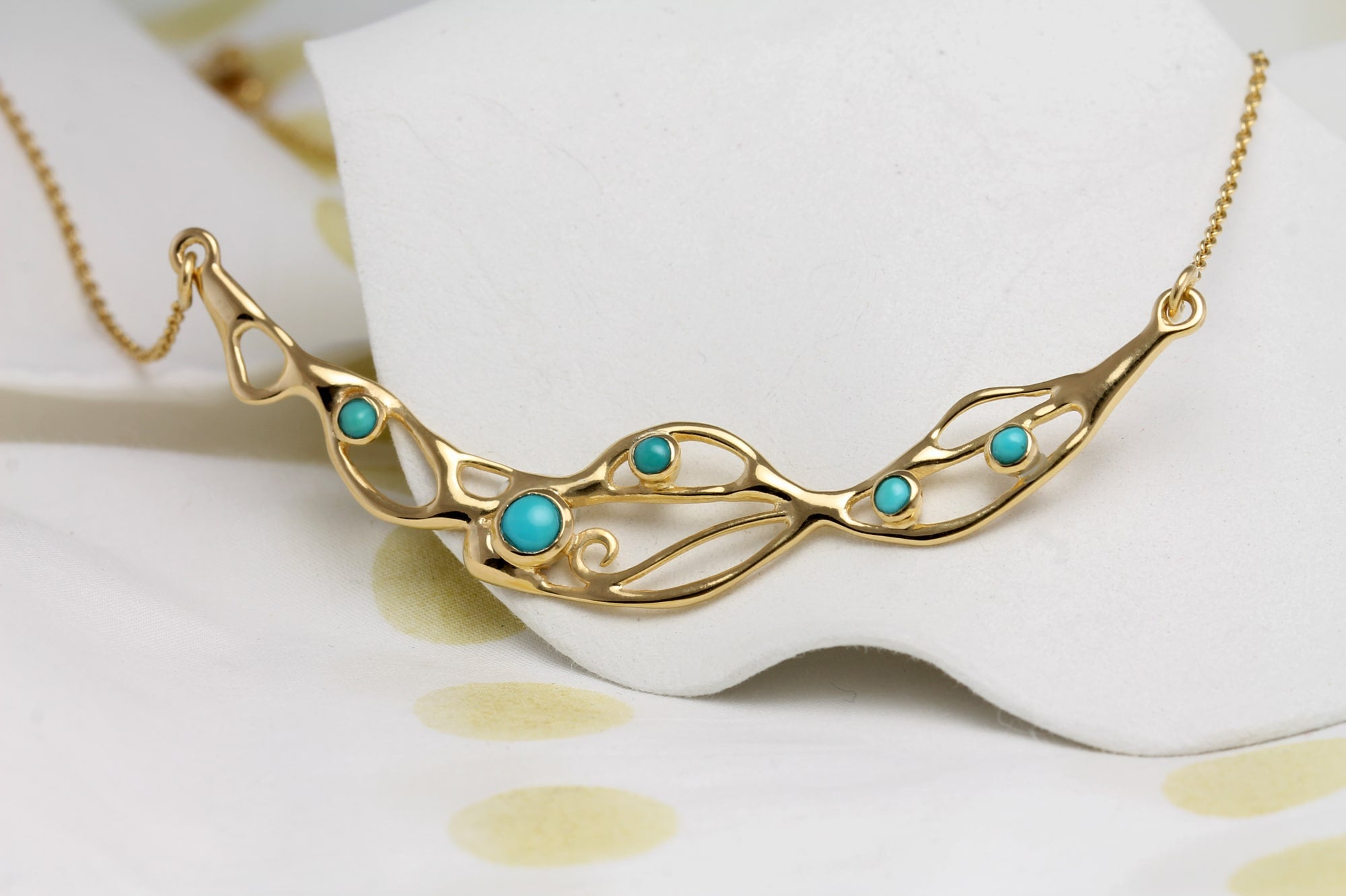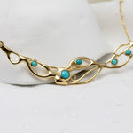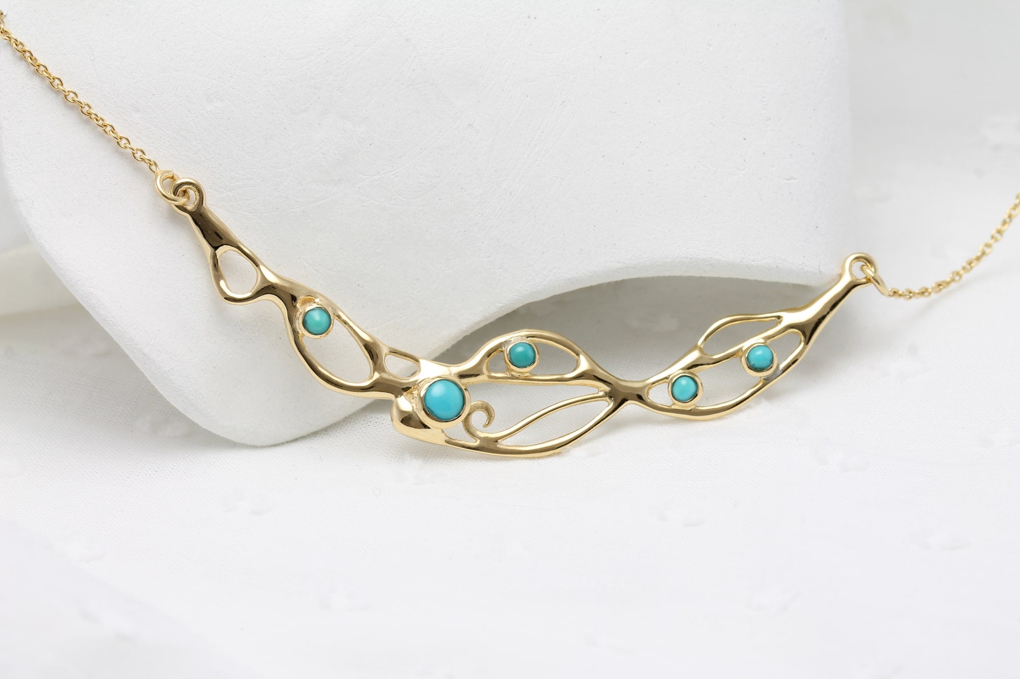 This necklace carries an organic elegance that feels both contemporary and timeless. The setting flows with delicate detail, while five American Turquoise stones bring a beautiful contrast to the warmth of the Gold. With an adjustable chain, this necklace makes a beautiful statement on its own and is effortlessly versatile for everyday wear.