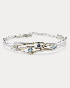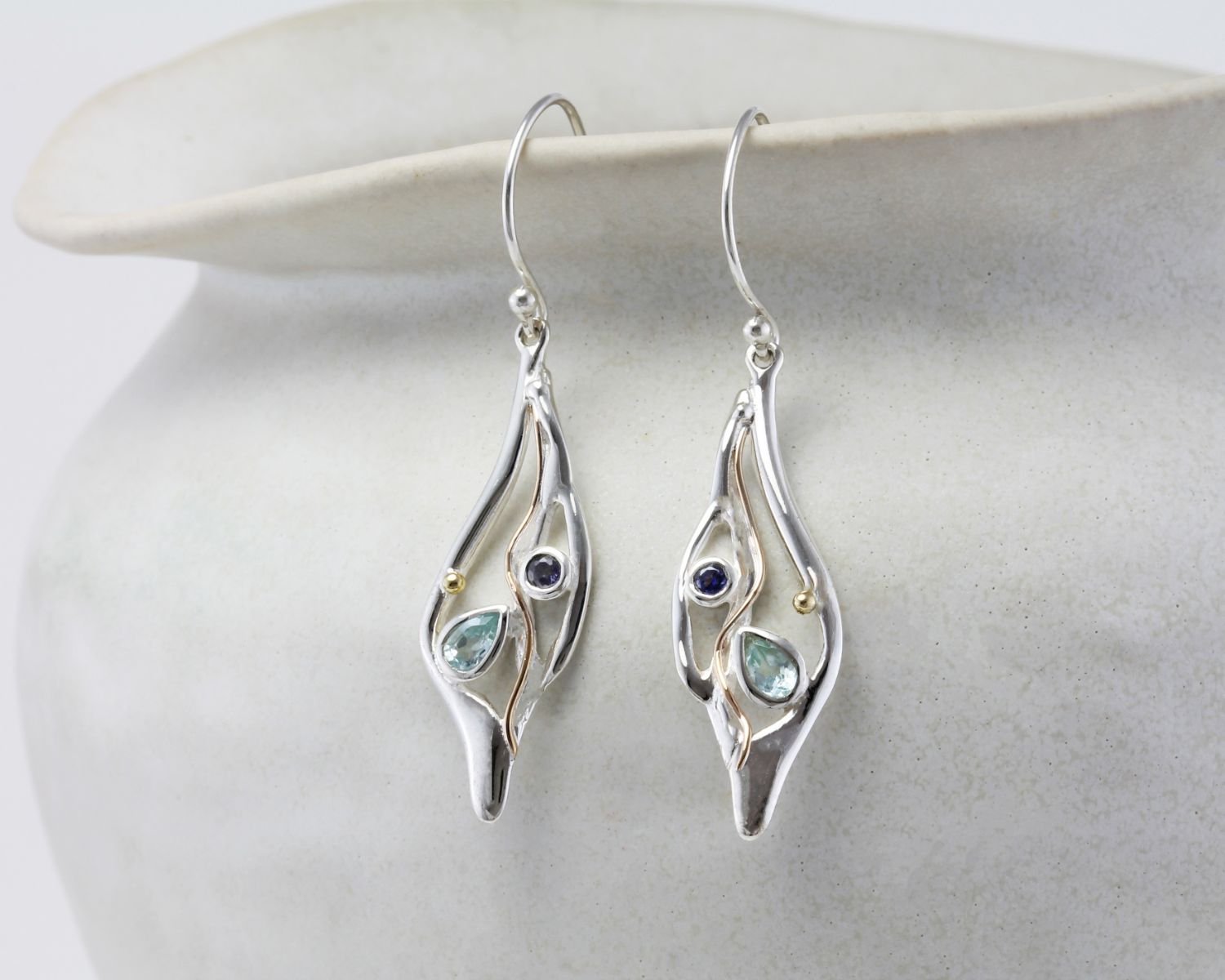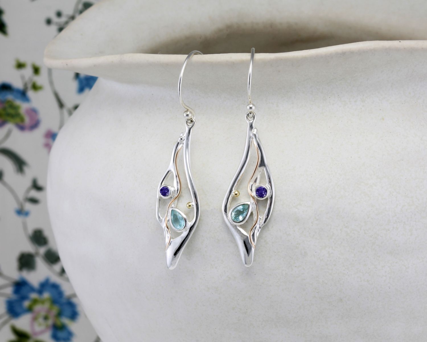 Transform and elevate any look with this pair of Blue Topaz and Iolite statement drop earrings. Handcrafted flowing Sterling Silver forms the drop earrings that feature a teardrop blue Topaz and tiny round Iolite, intertwined with 14KT Gold detailing.