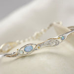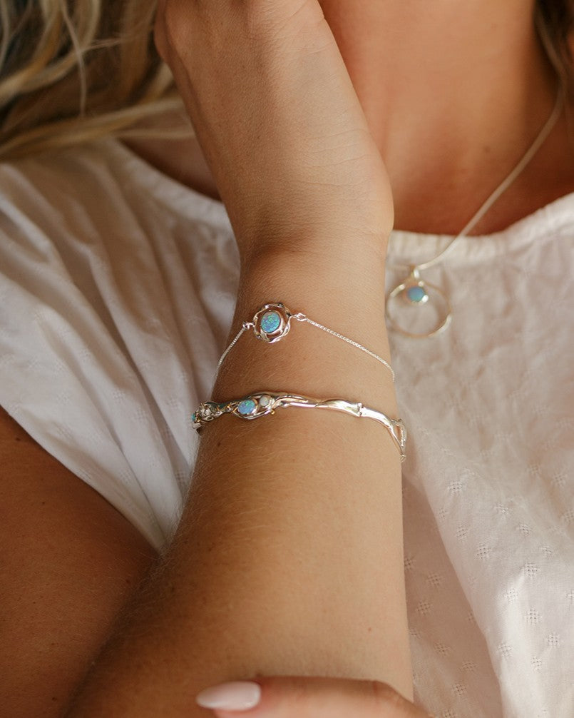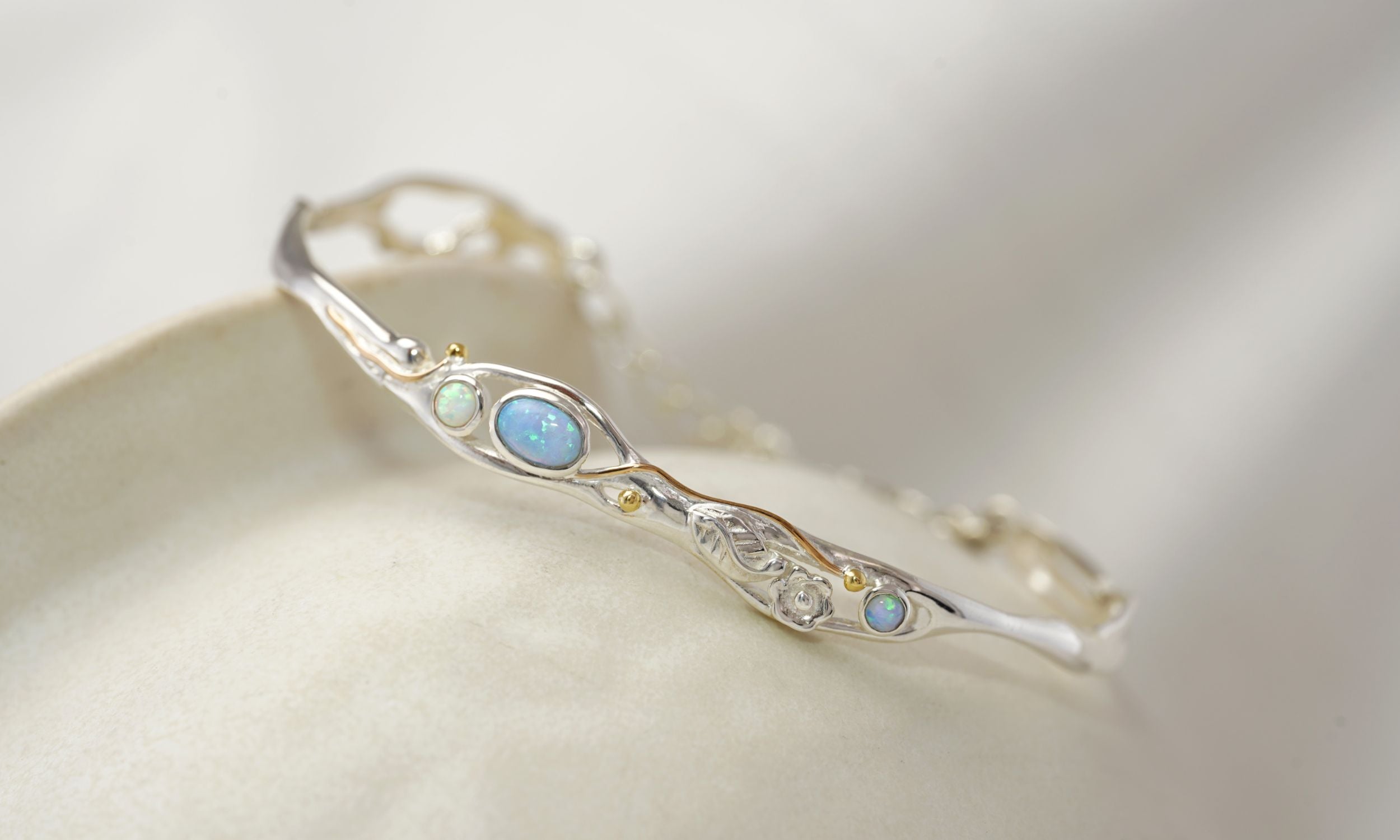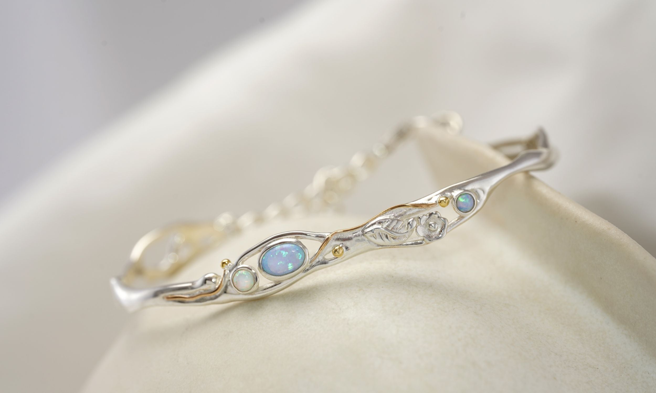 This dainty bracelet has flowing Sterling Silver lines, organically crafted using our unique wax form. It features three sparkling Opals, two blue and one white, which catch the light in a fiery array of colours. Nestled amongst the curving Silver sits an intricate flower and leaf design, perfectly complimented with 14KT Gold details.