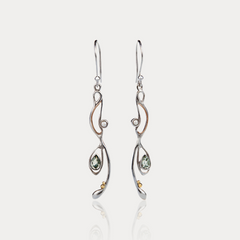 A contemporary green Amethyst and Pearl pendant, handcrafted from Sterling Silver in a flowing form that hints at a touch of art nouveau. This unique pendant is finished with delicate details of 14KT Gold.