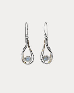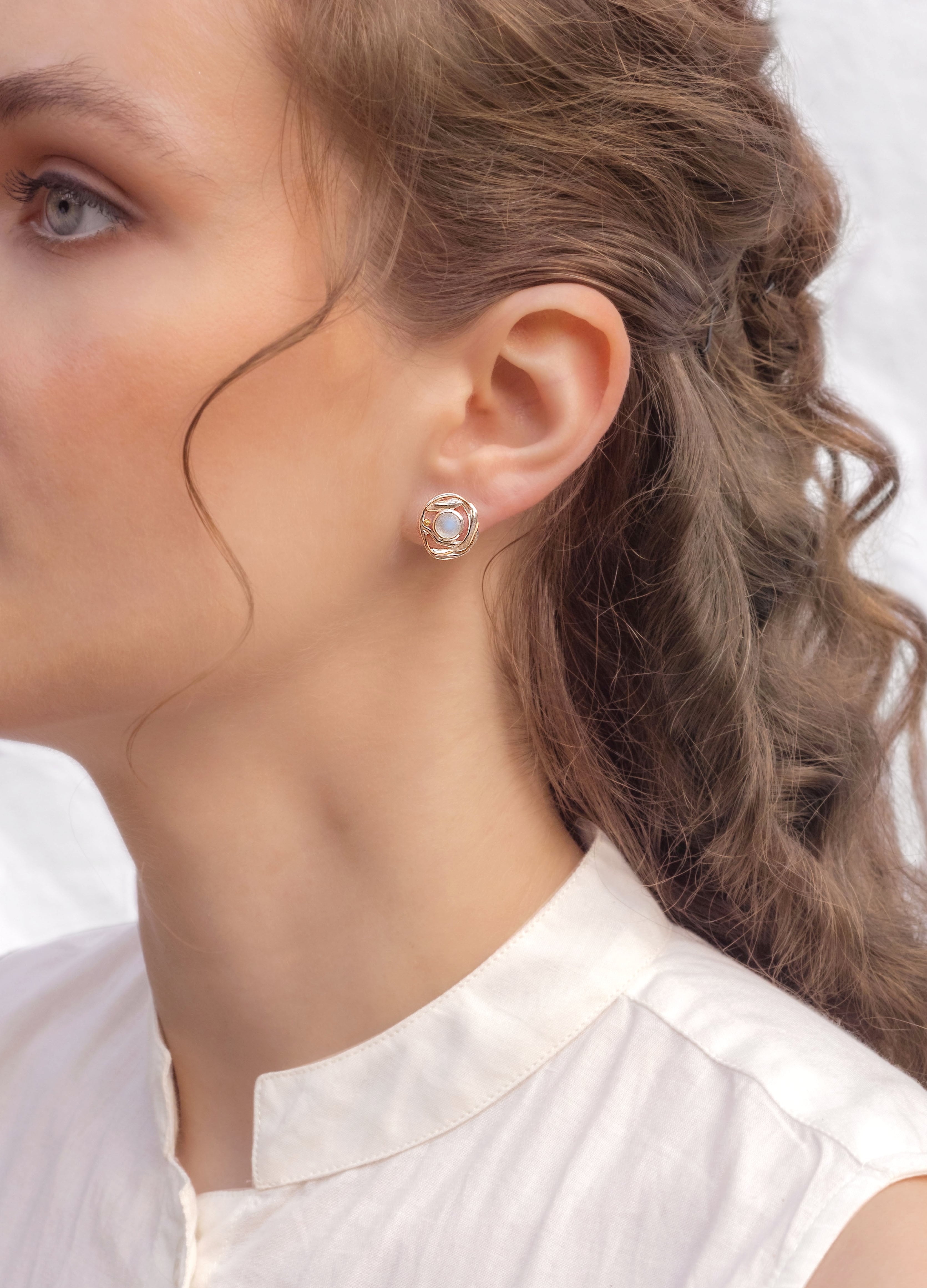 Organically flowing, circular Sterling Silver ribbons set with round cabochon Moonstone form these intricate stud earrings. They are complimented with flowing 14KT Gold details.