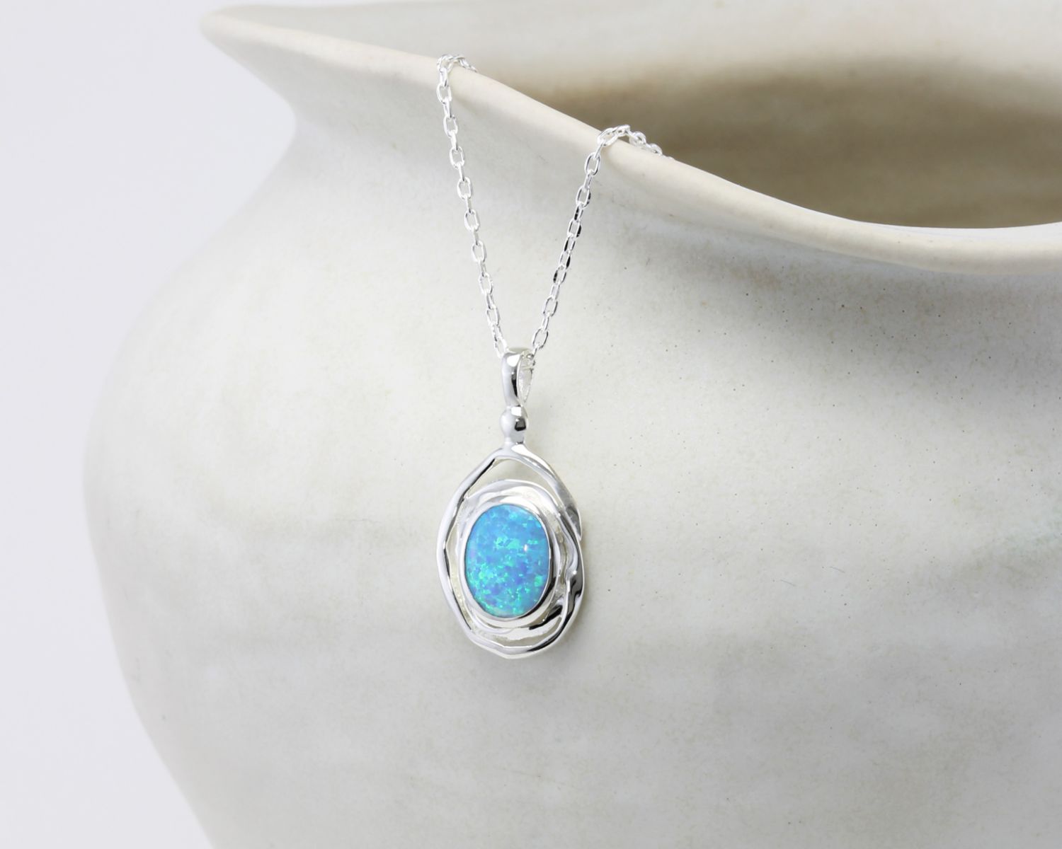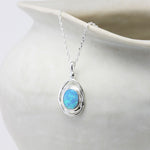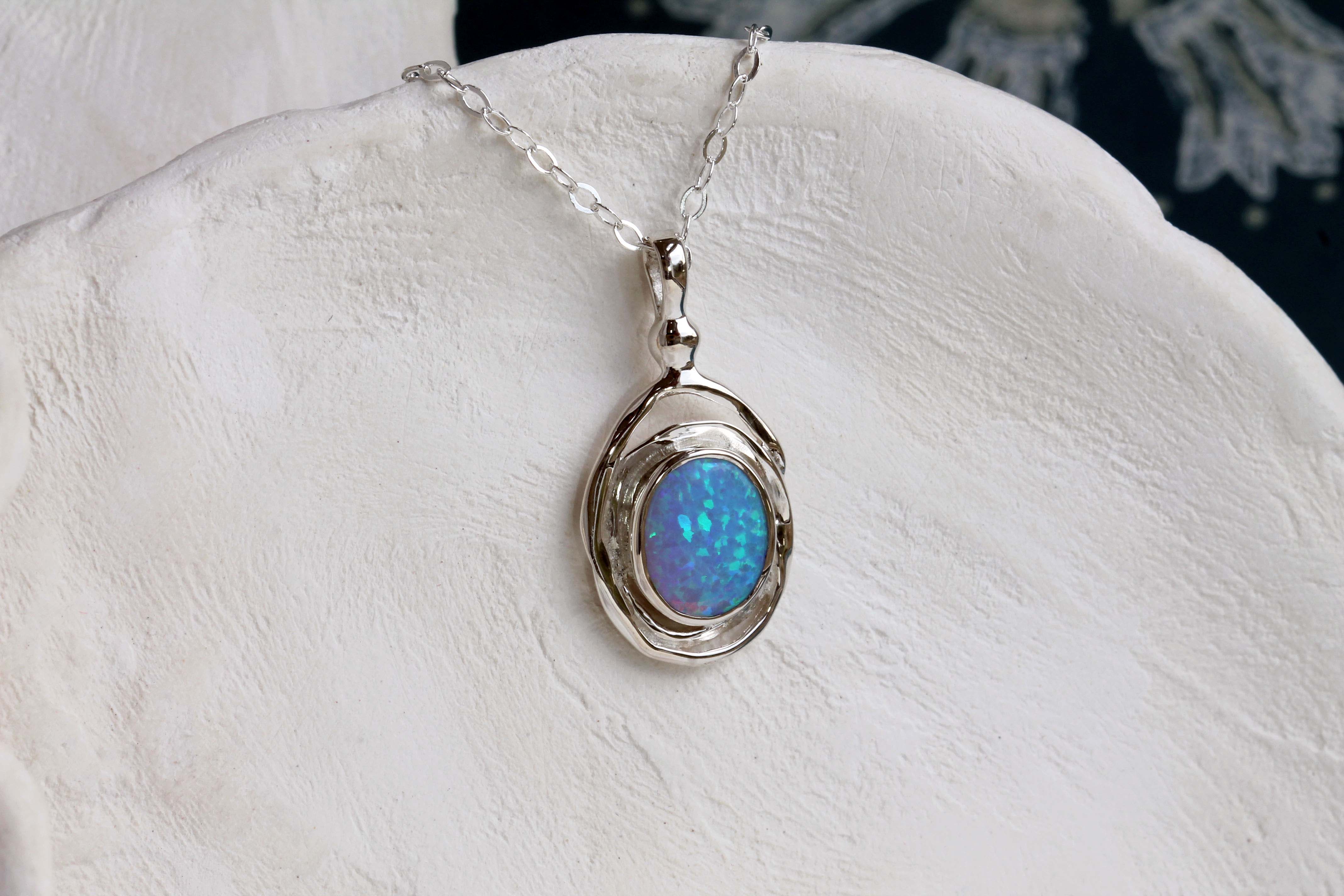 This mesmerising Opal pendant necklace is an enchanting gift for her. Handcrafted from Sterling Silver, the spiral is lightly hammered and set with a fiery blue Opal that is sure to turn heads.