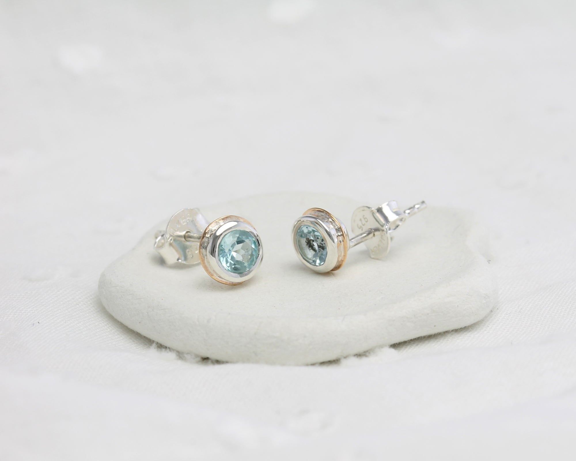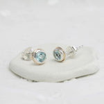 A dainty pair of blue Topaz studs, set in Sterling Silver and finished with 14KT Gold detailing. The perfect piece to add a sparkly touch to any outfit.