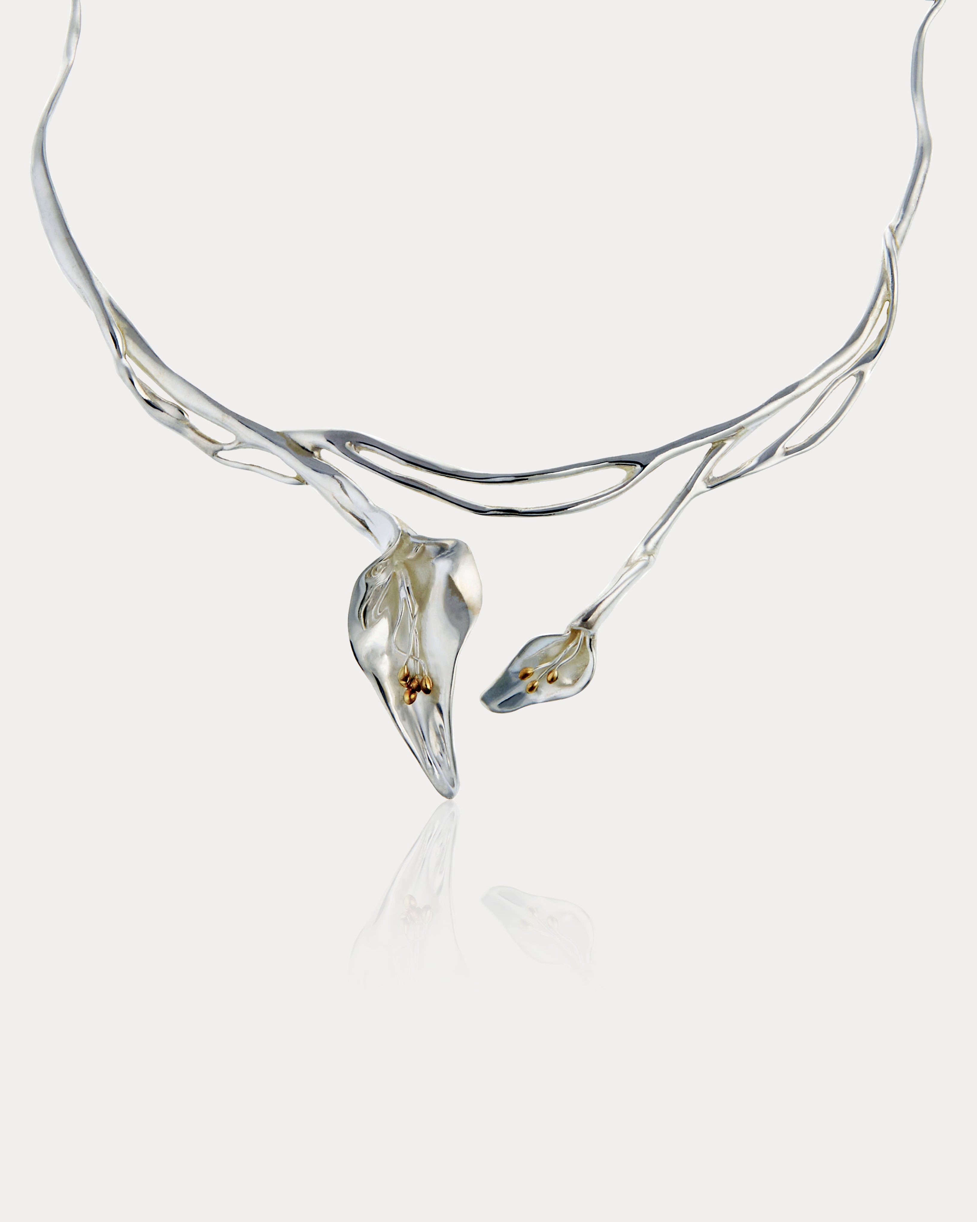 Our Lily Statement Necklace is an elegant and eye-catching gift for her. Handmade from Sterling Silver, featuring two lilies on a flowing, organic silver setting. Each lilies stamen is plated with 18KT Gold for an added touch of luxury.