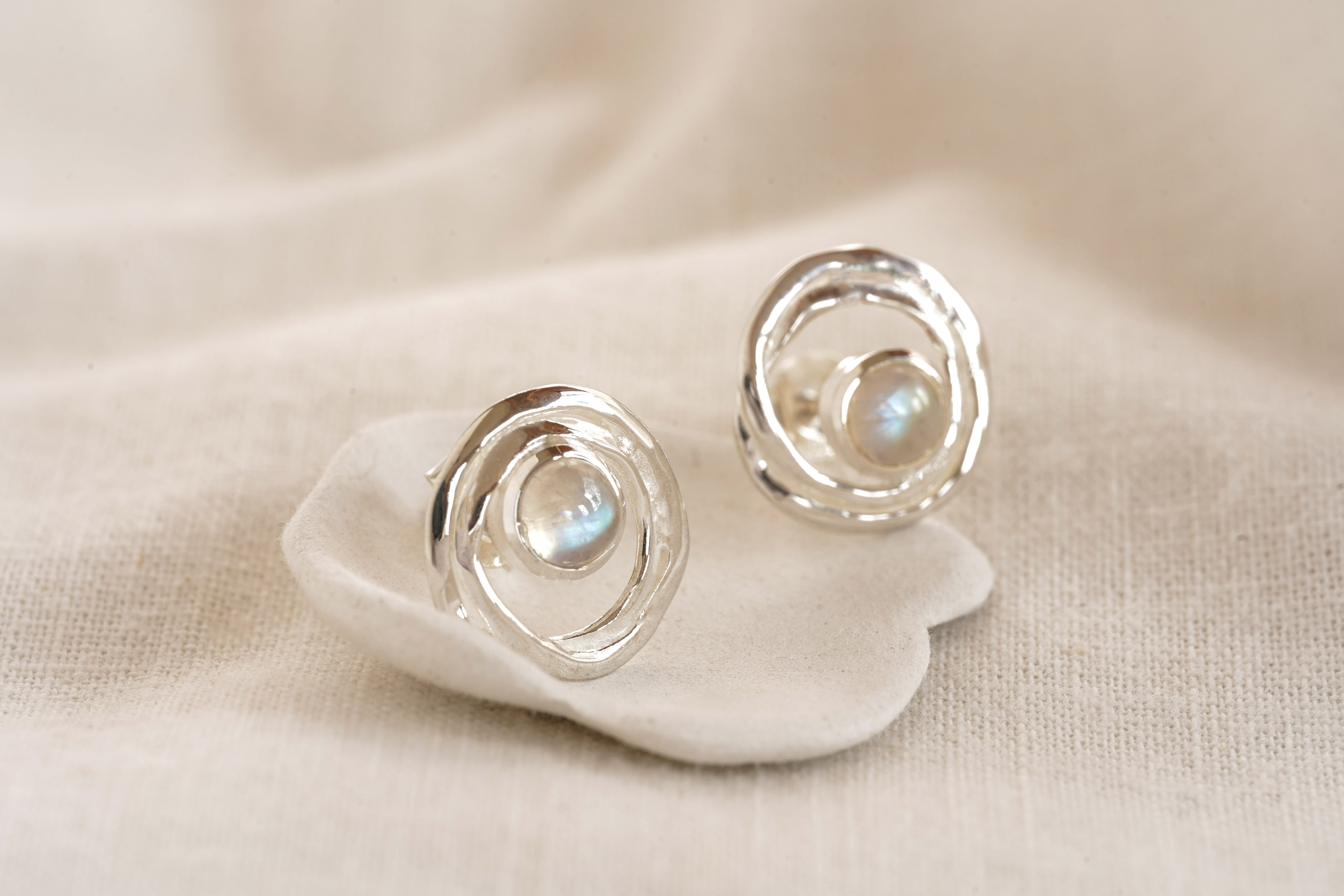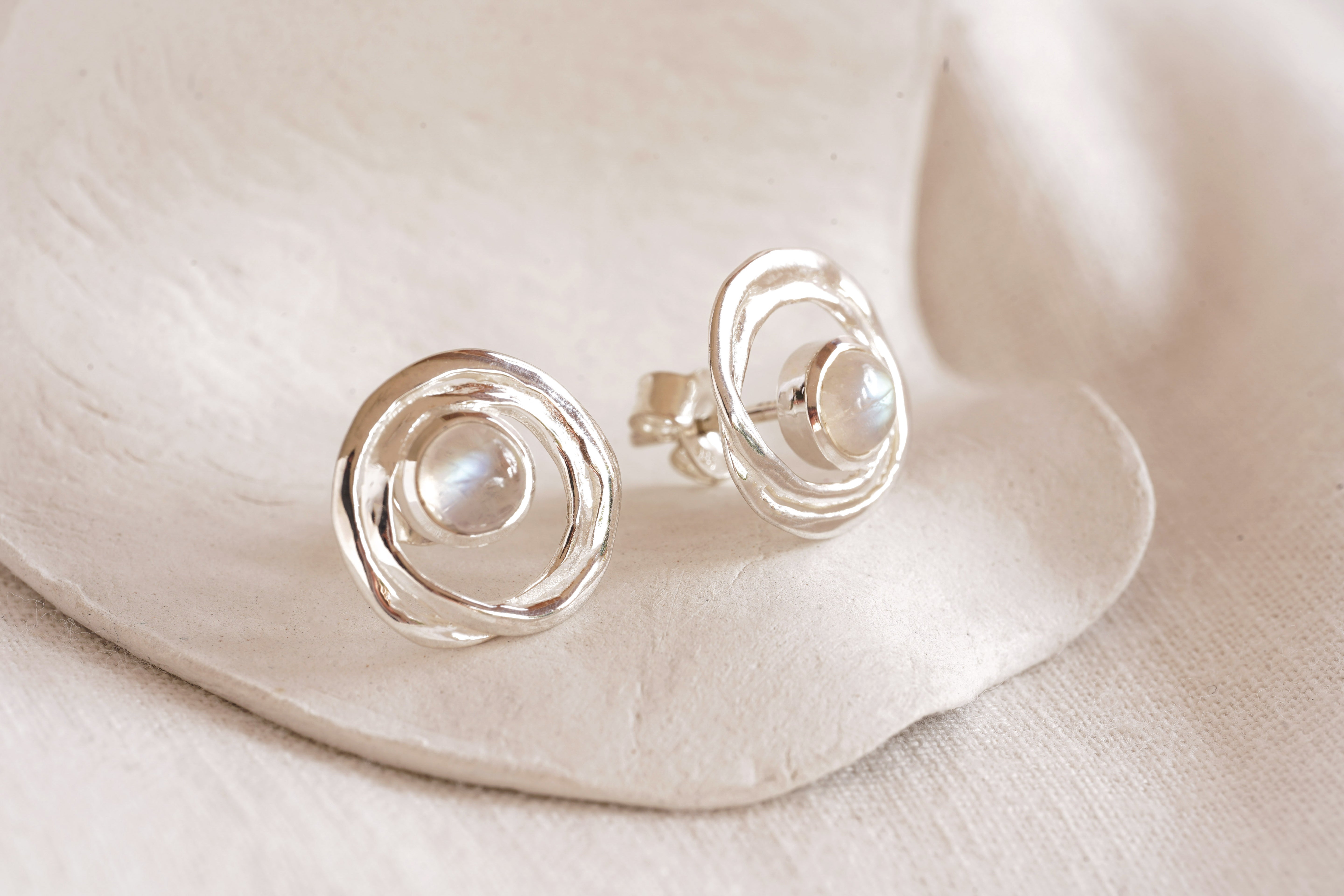 Our Sterling Silver Moonstone Stud Earrings are an enchanting gift for her. Handmade from Sterling Silver, the earrings are formed into an organic circular hoop and set with majestic Rainbow Moonstones. Perfect earrings for everyday and special occasions alike.