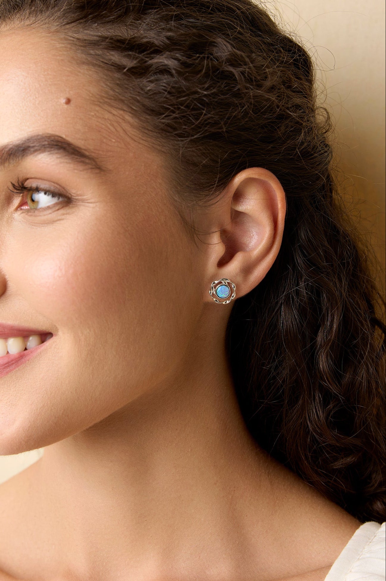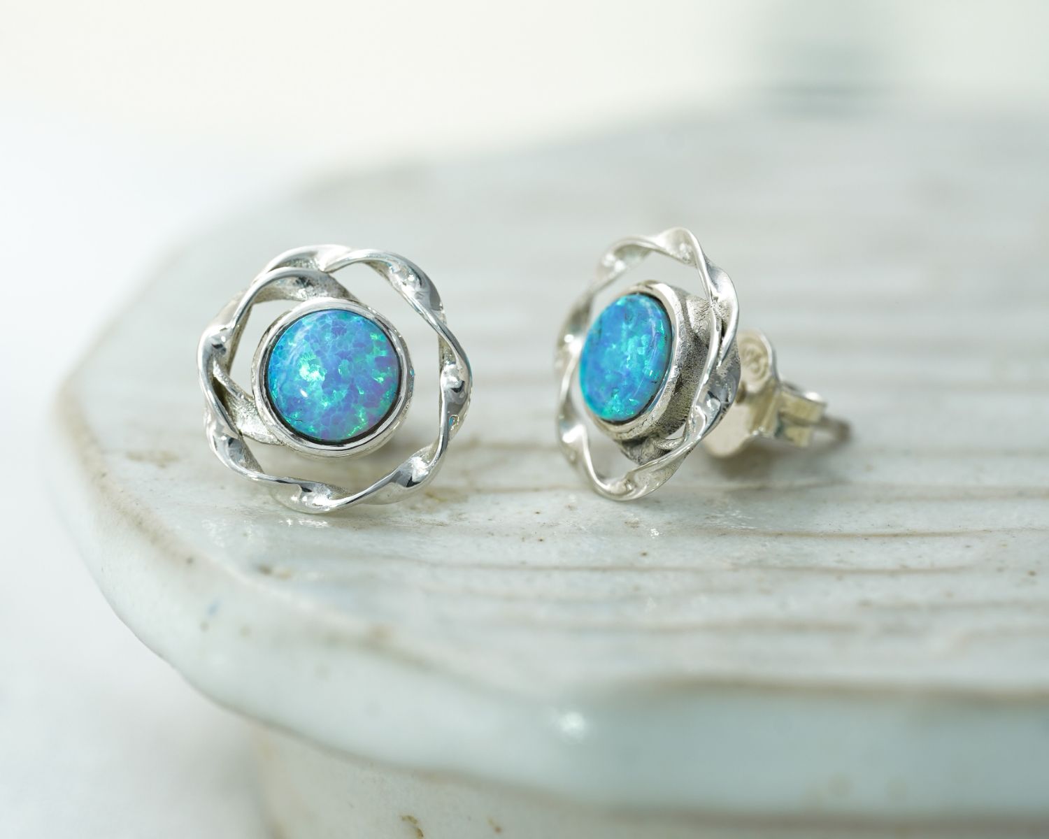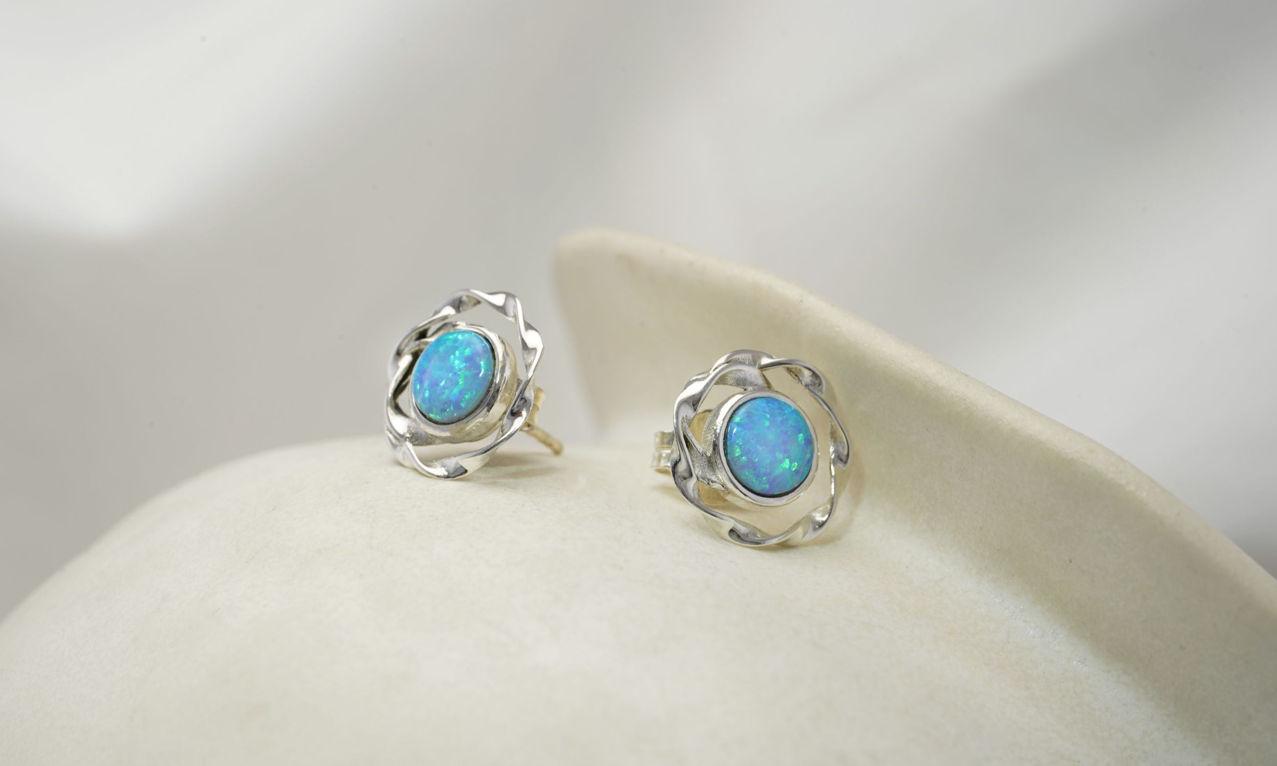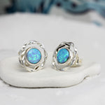 These intricate Sterling Silver stud earrings boast beautiful Opals in their centre. Surrounded by a curling circle of Silver, the Opals sparkle and catch the light in mesmerising blues and turquoises. They are perfect for everyday wear and special occasions alike.