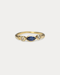Our 18KT Gold Vermeil plated ring features a majestic Kyanite nestled amongst two Blue Chalcedony. It is a dainty yet standout piece, perfect for everyday wear. The textured band is offset with the striking stones, which sparkle and catch the light. The Chalcedony in a soft, delicate blue perfectly complements the deep, dimensional Kyanite.