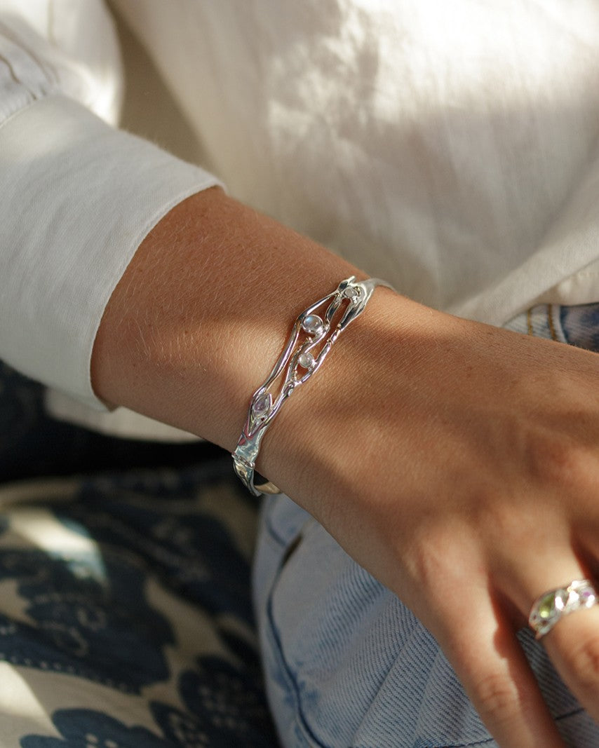 Each piece is handcrafted by our artisans in Sterling Silver, using ethically sourced natural Moonstones making each piece as unique as our designs.