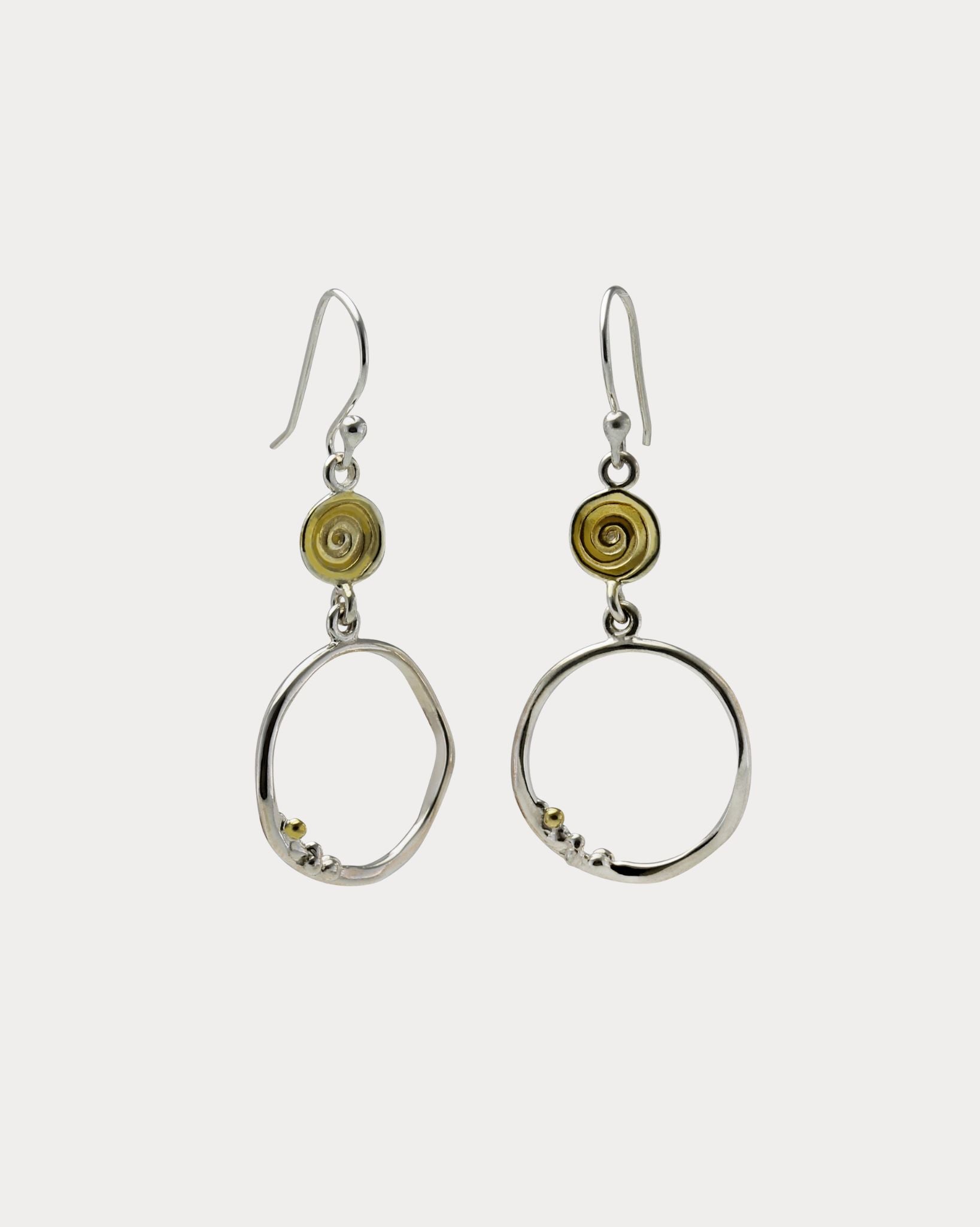 These unique hoop hook earrings are handcrafted in Sterling Silver. The main feature is the organically shaped circle which has dainty Silver details, accompanied by an 18KT Gold spiral. The textured, flowing shapes were crafted using our unique wax form to create a natural, eye-catching design.