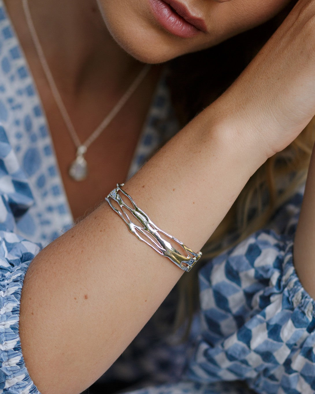 A slimmer version of our Sterling Silver organic bangles. This flowing piece was formed using our unique wax form.