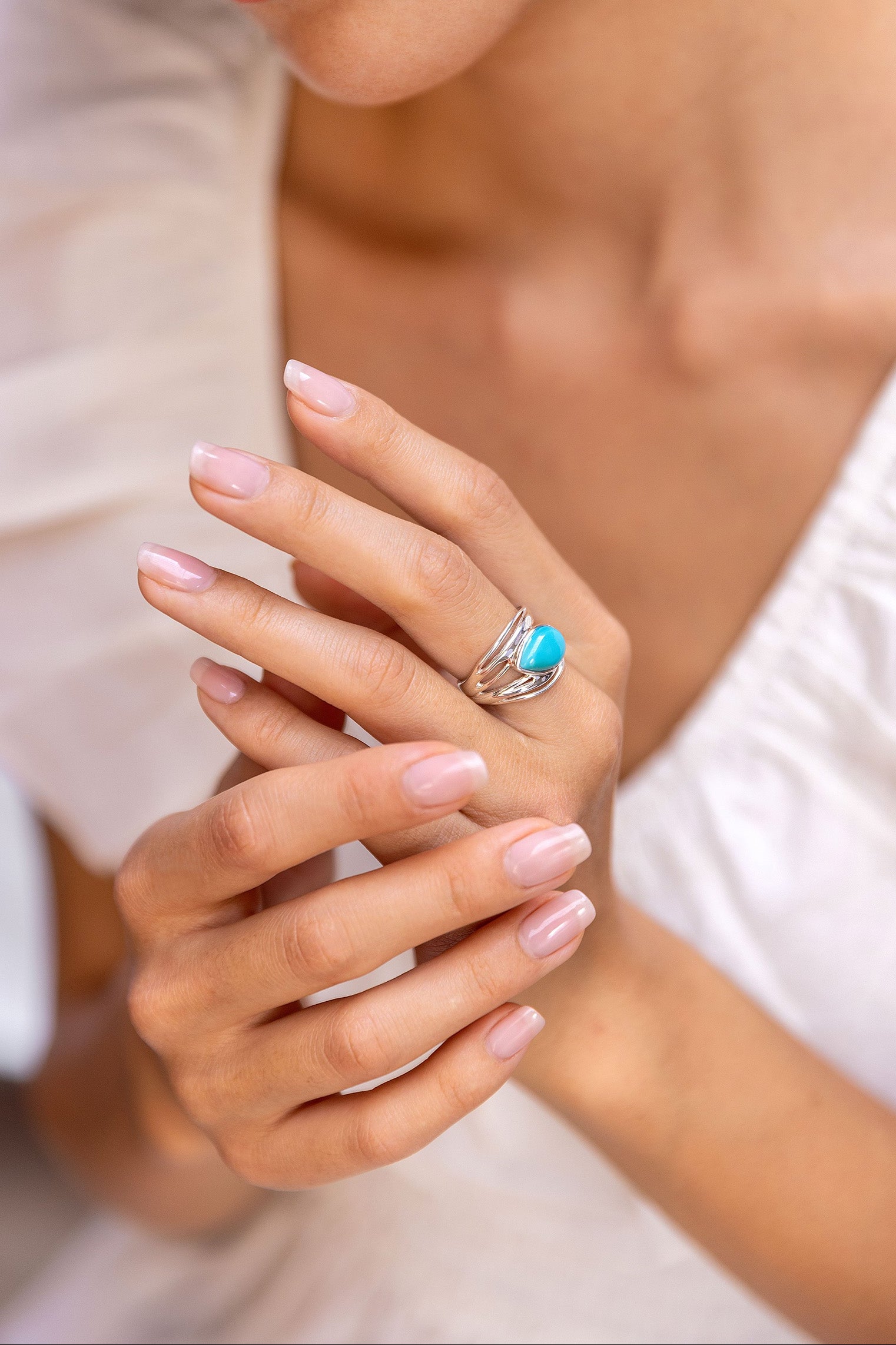 American Turquoise's recognisable shade of blue is reminiscent of summer by the sea. Hand-made with Sterling Silver, this piece was crafted from our unique wax form and is a perfect complement to any outfit.
