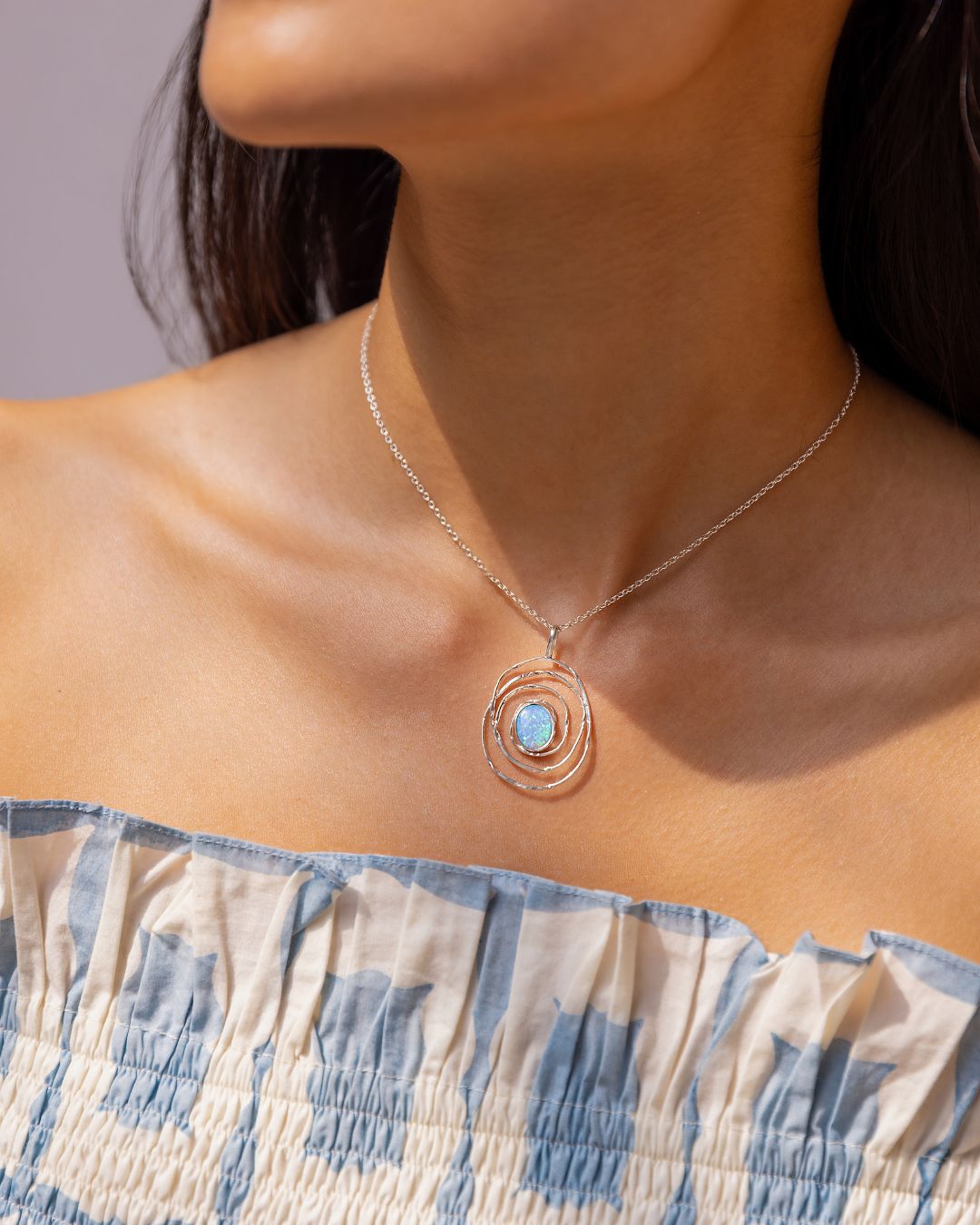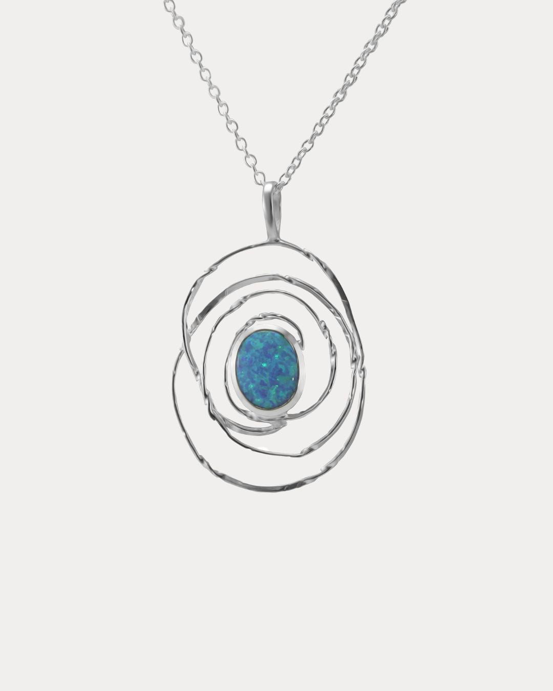 A vibrant and eye-catching blue opal is set at the center of a swirling organic Sterling Silver spiral pendant. This statement piece makes a thoughtful addition to any woman's jewellery collection.