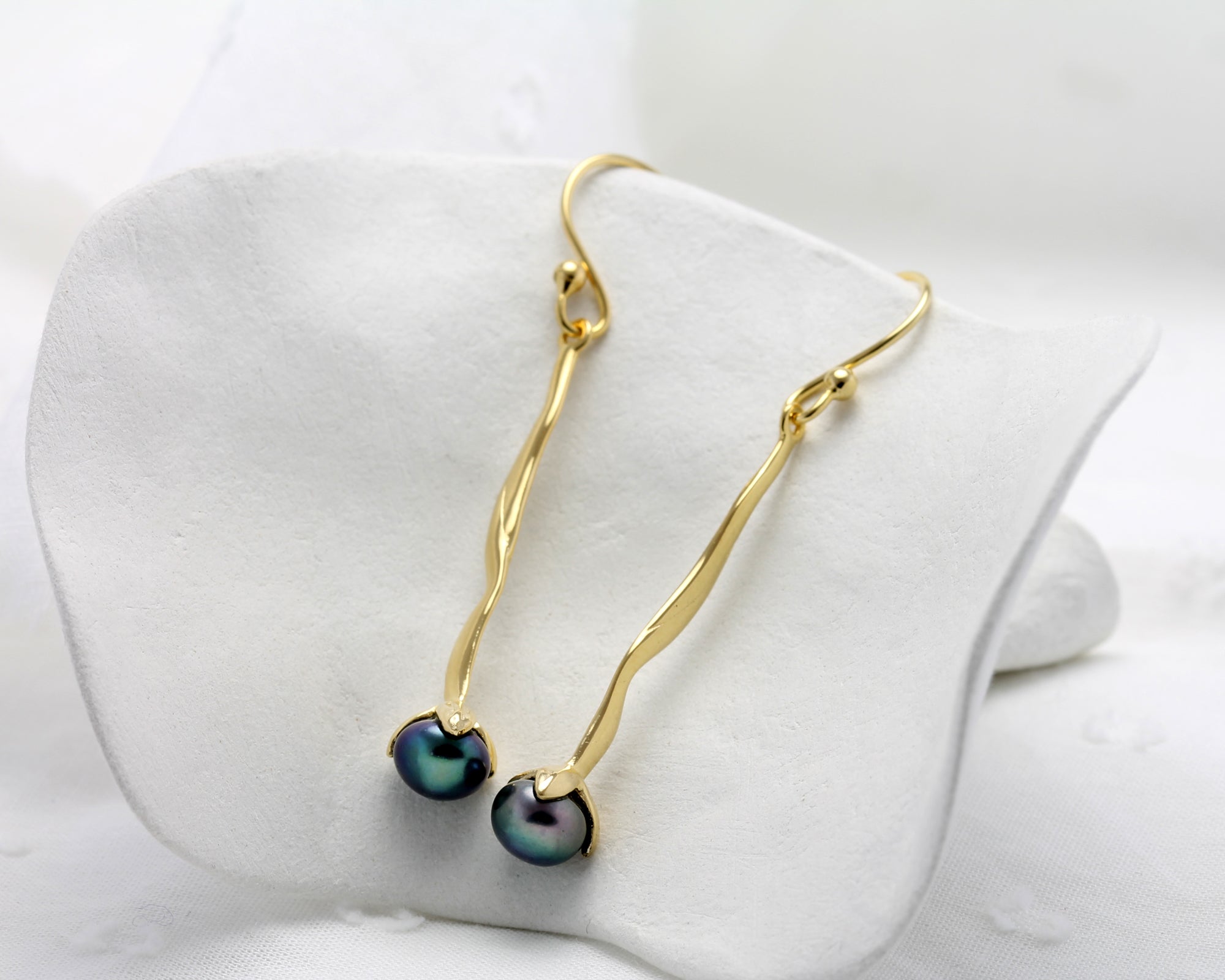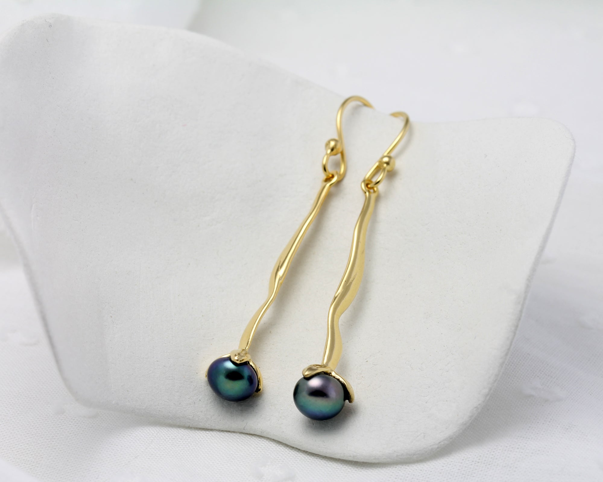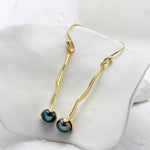 A pair of handcrafted 18KT Gold Vermeil and Freshwater Peacock Black Pearl drop earrings.