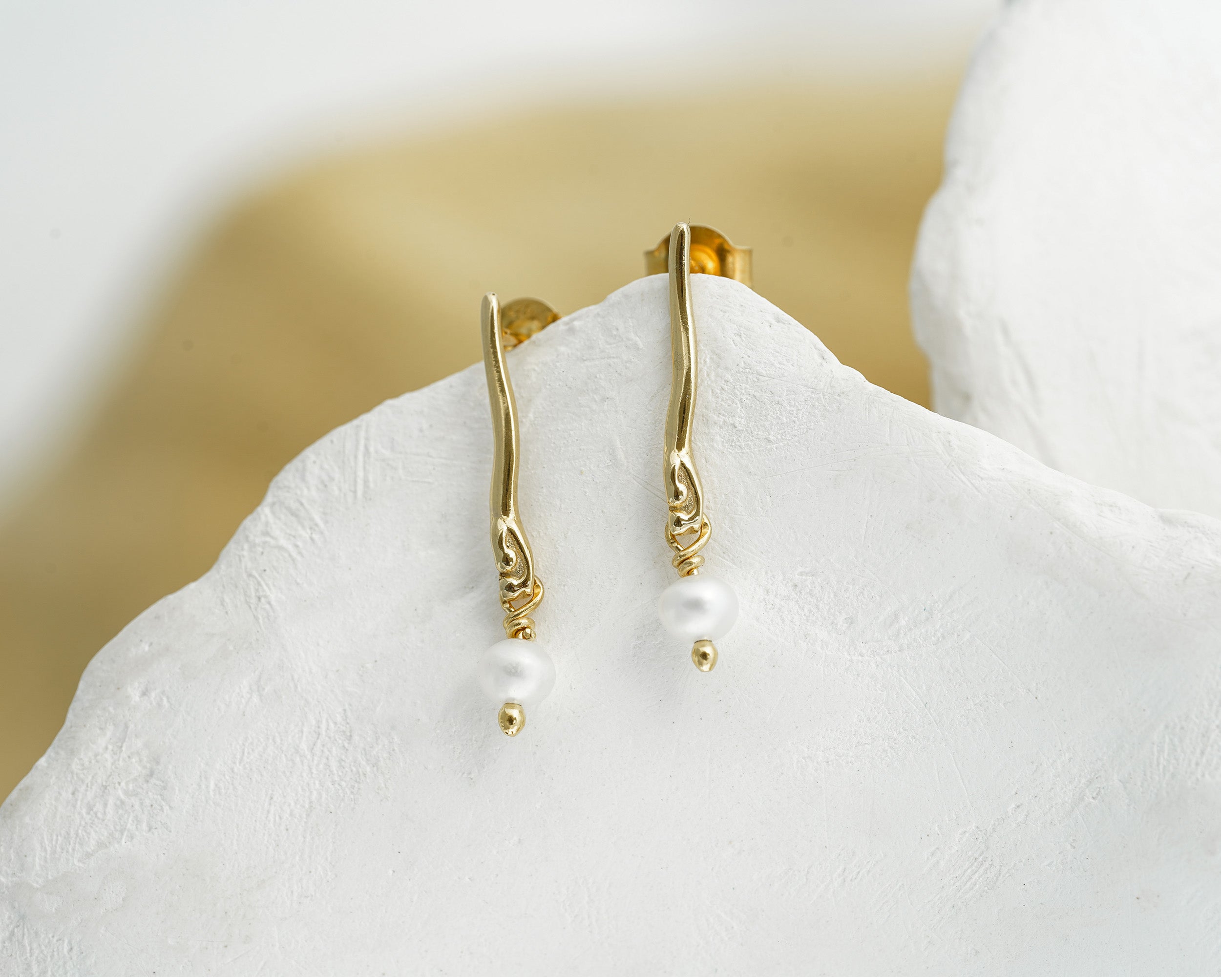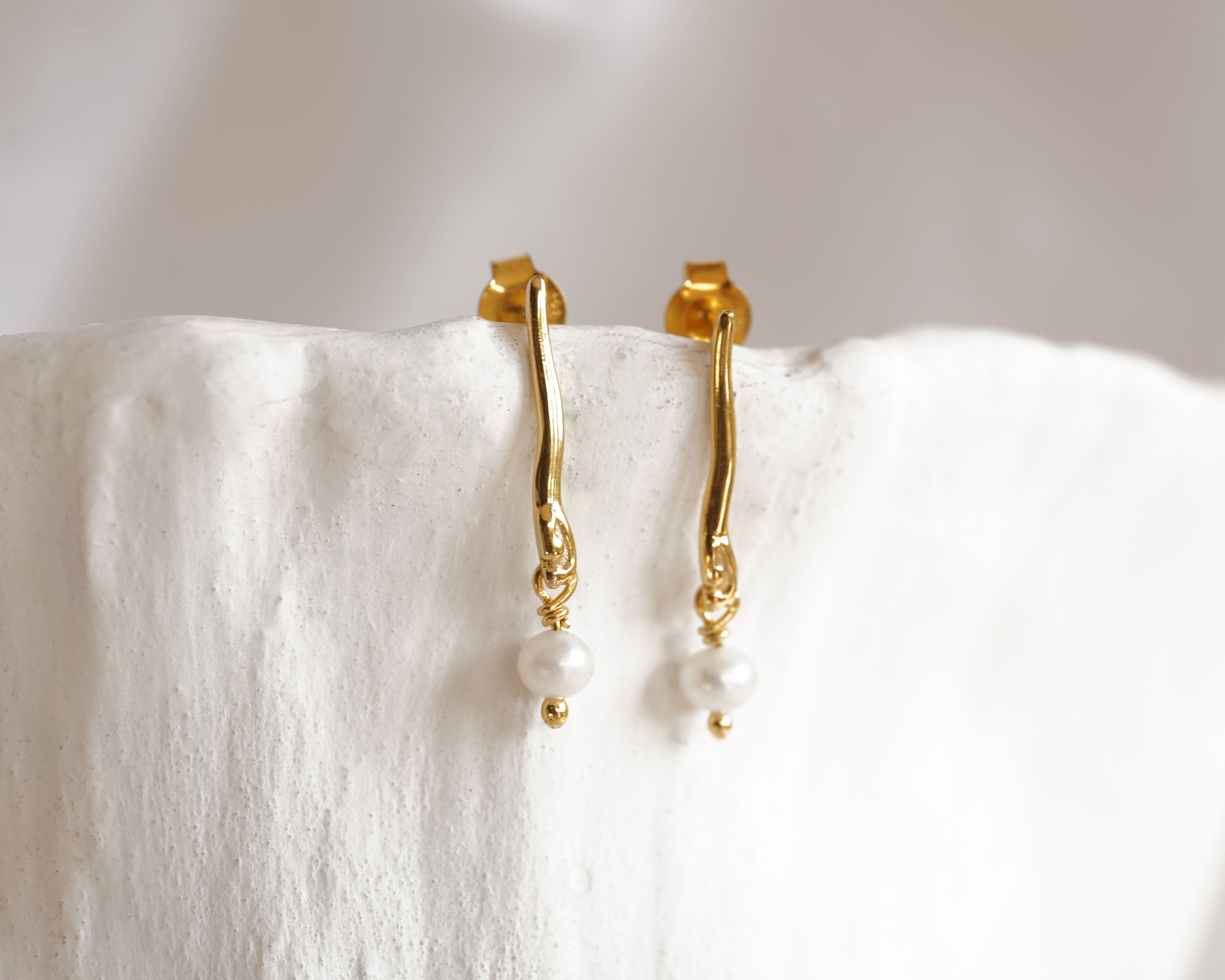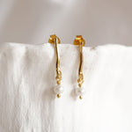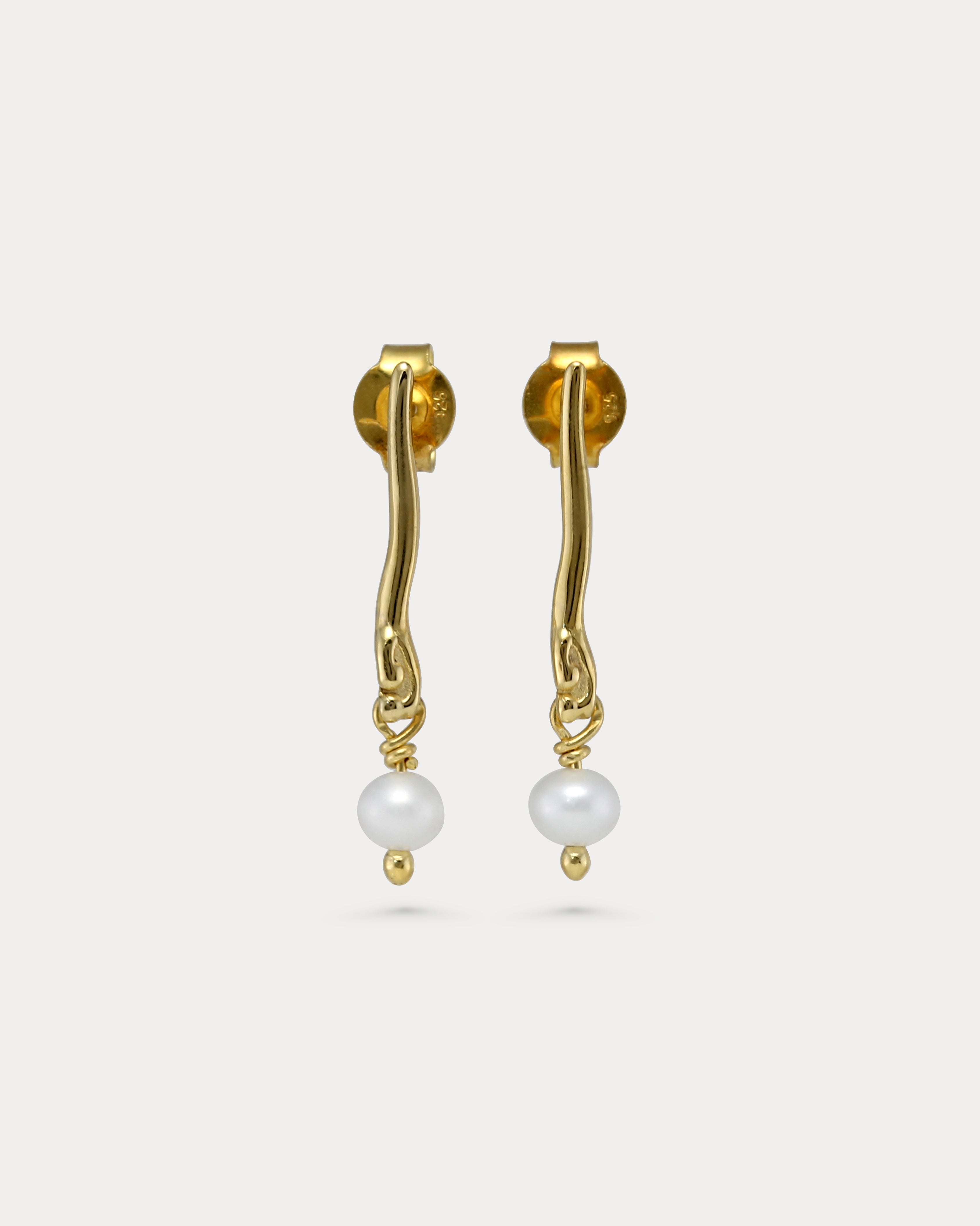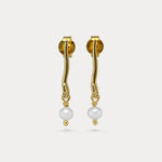 These artistically designed drop earrings are adorned with a sleek stem of Gold Vermeil, and finished with a dainty Freshwater Pearl bead. Perfect for everyday wear and special occasions alike, the Gold and Pearl combination is classic and timeless.