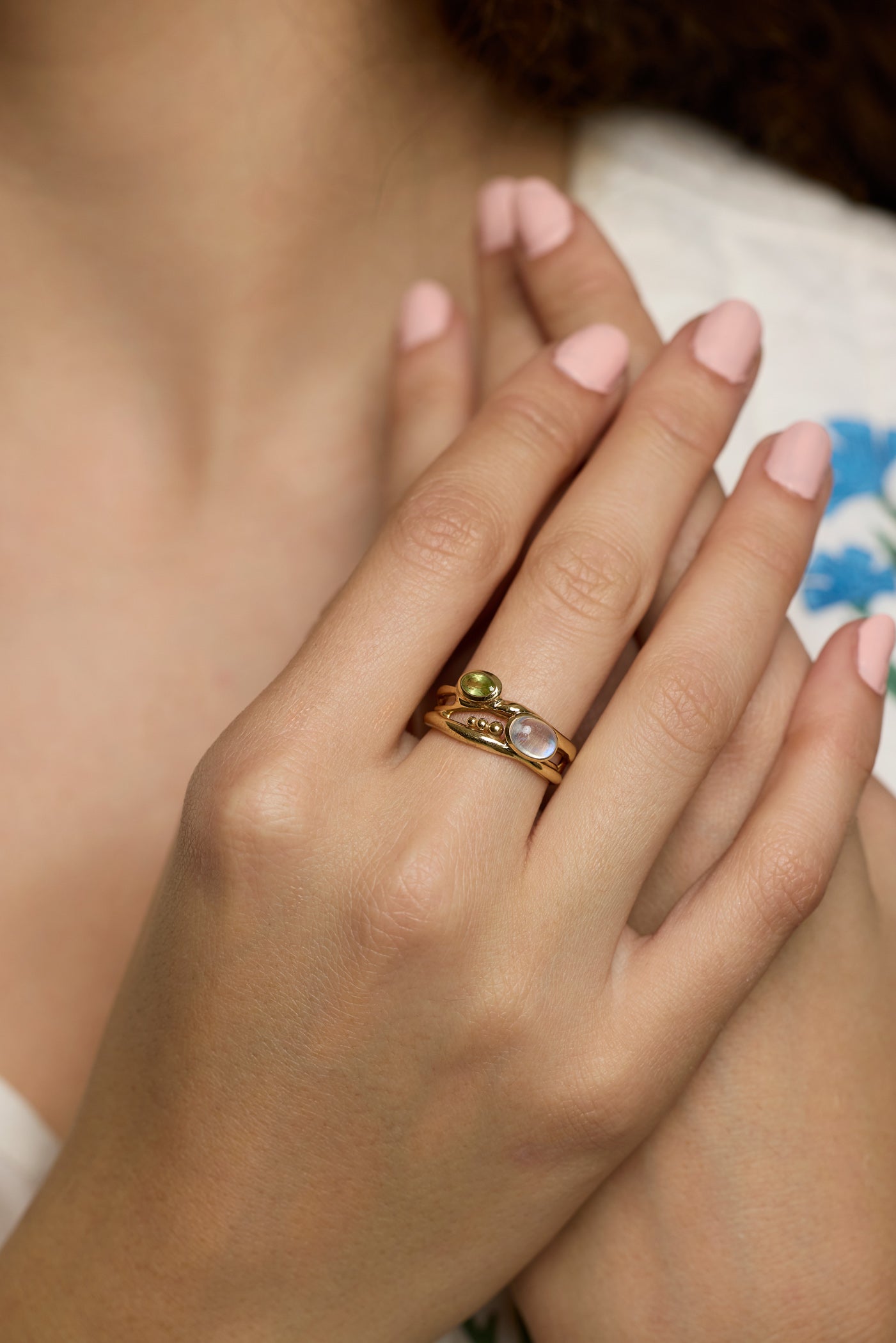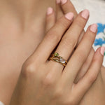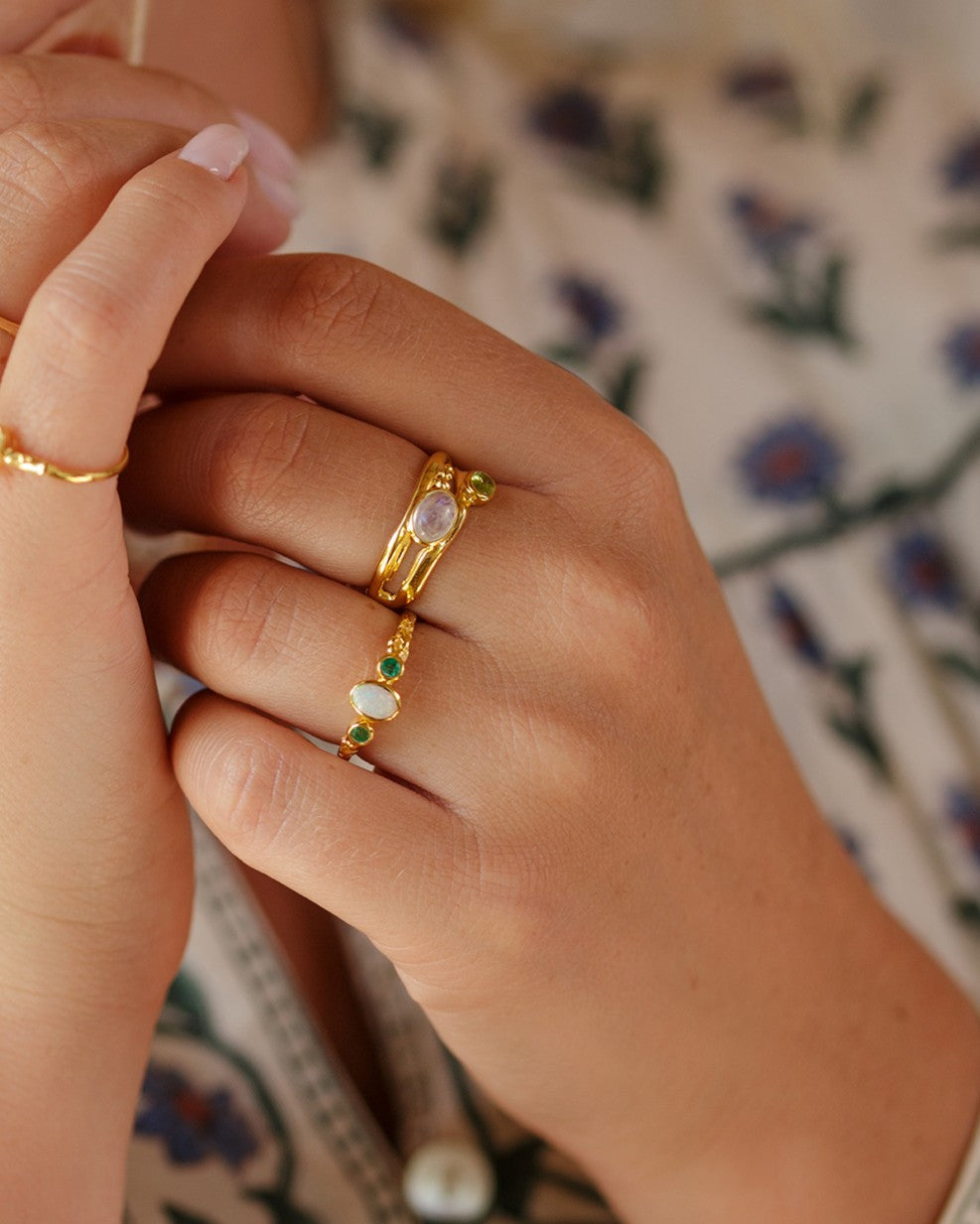 Nestled in flowing Gold Vermeil sit an iridescent Moonstone and dainty sparkling Peridot. The gemstones beautifully complement each other with their eye-catching colours, making this Gold ring the perfect statement piece.