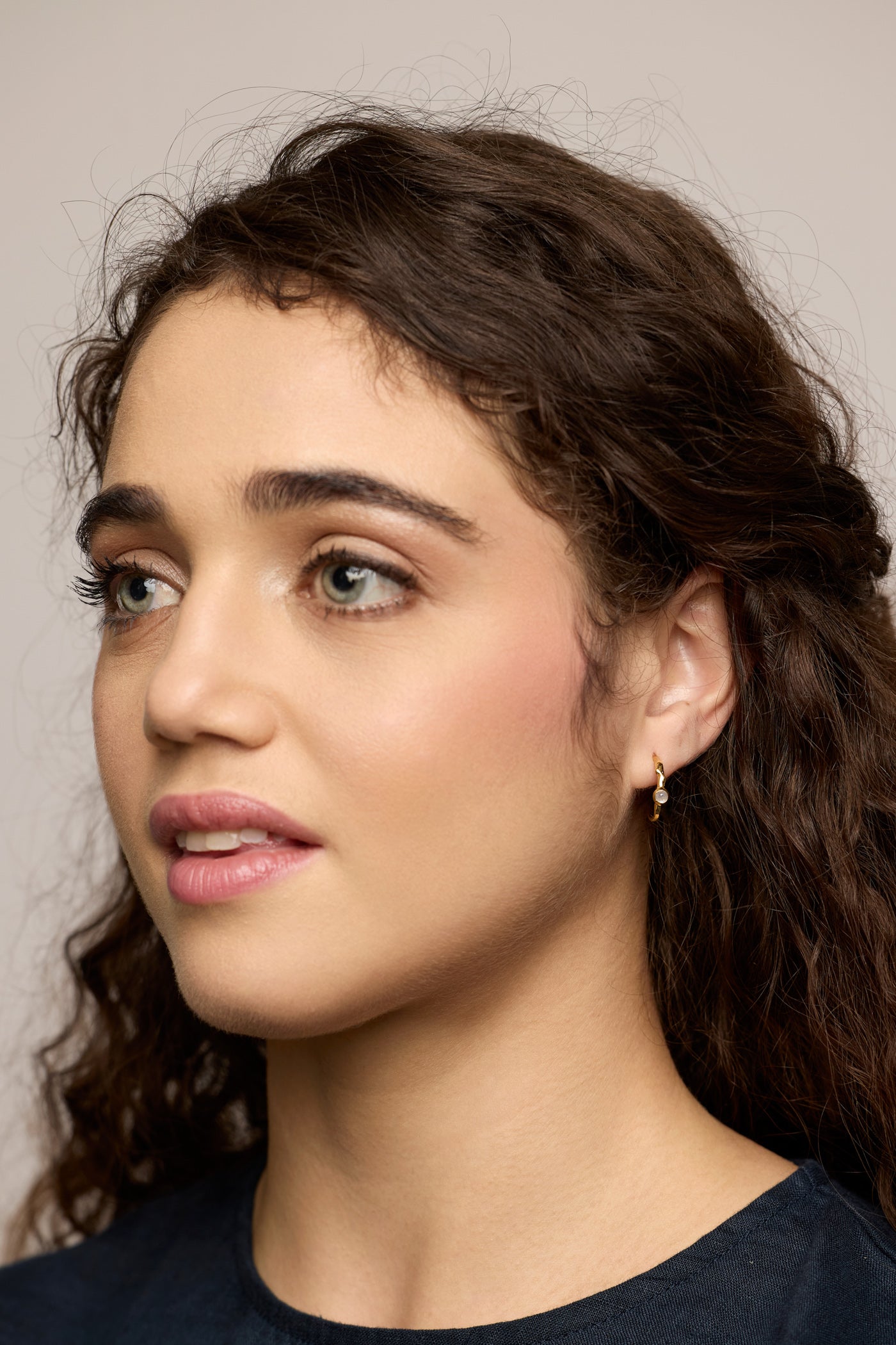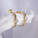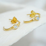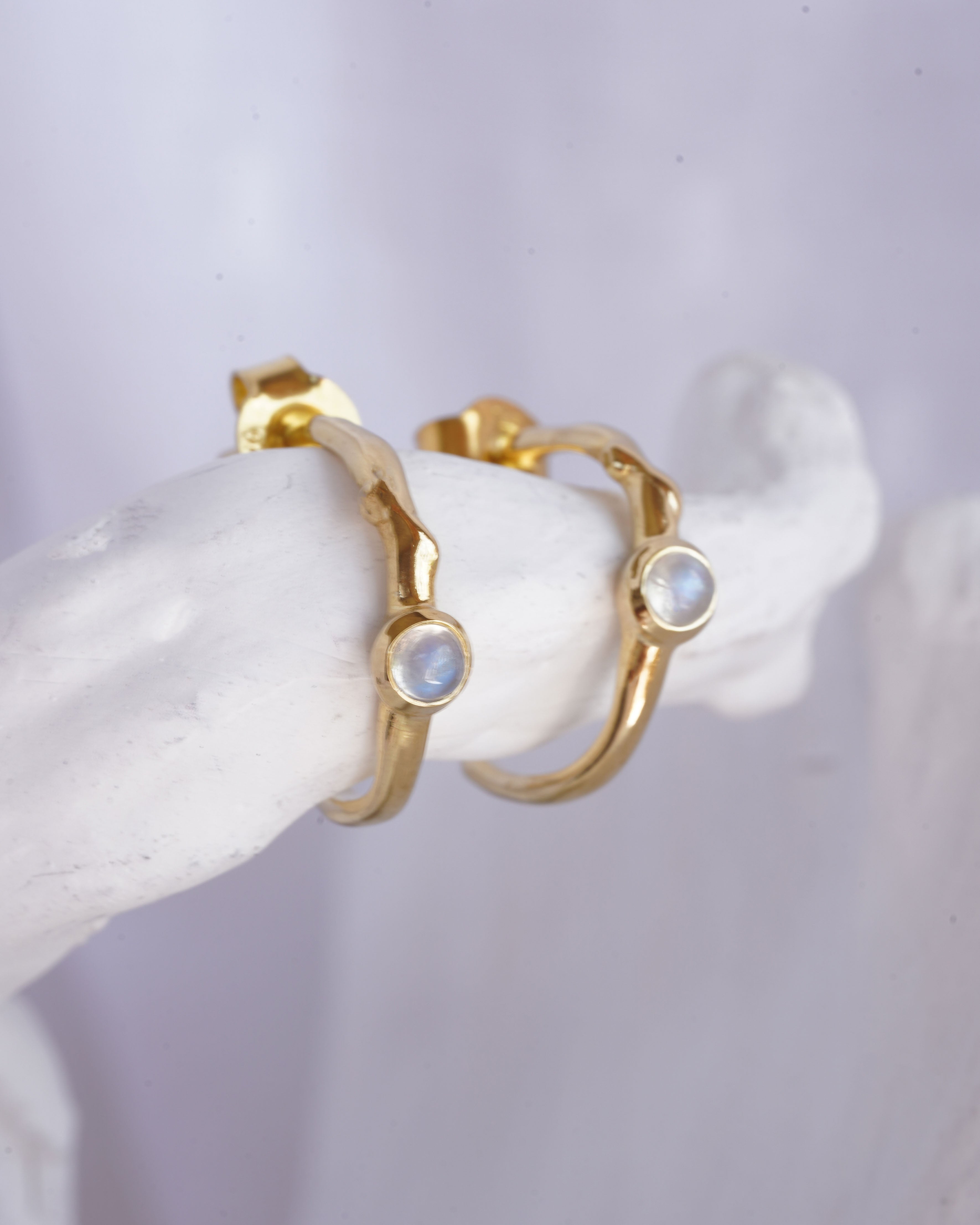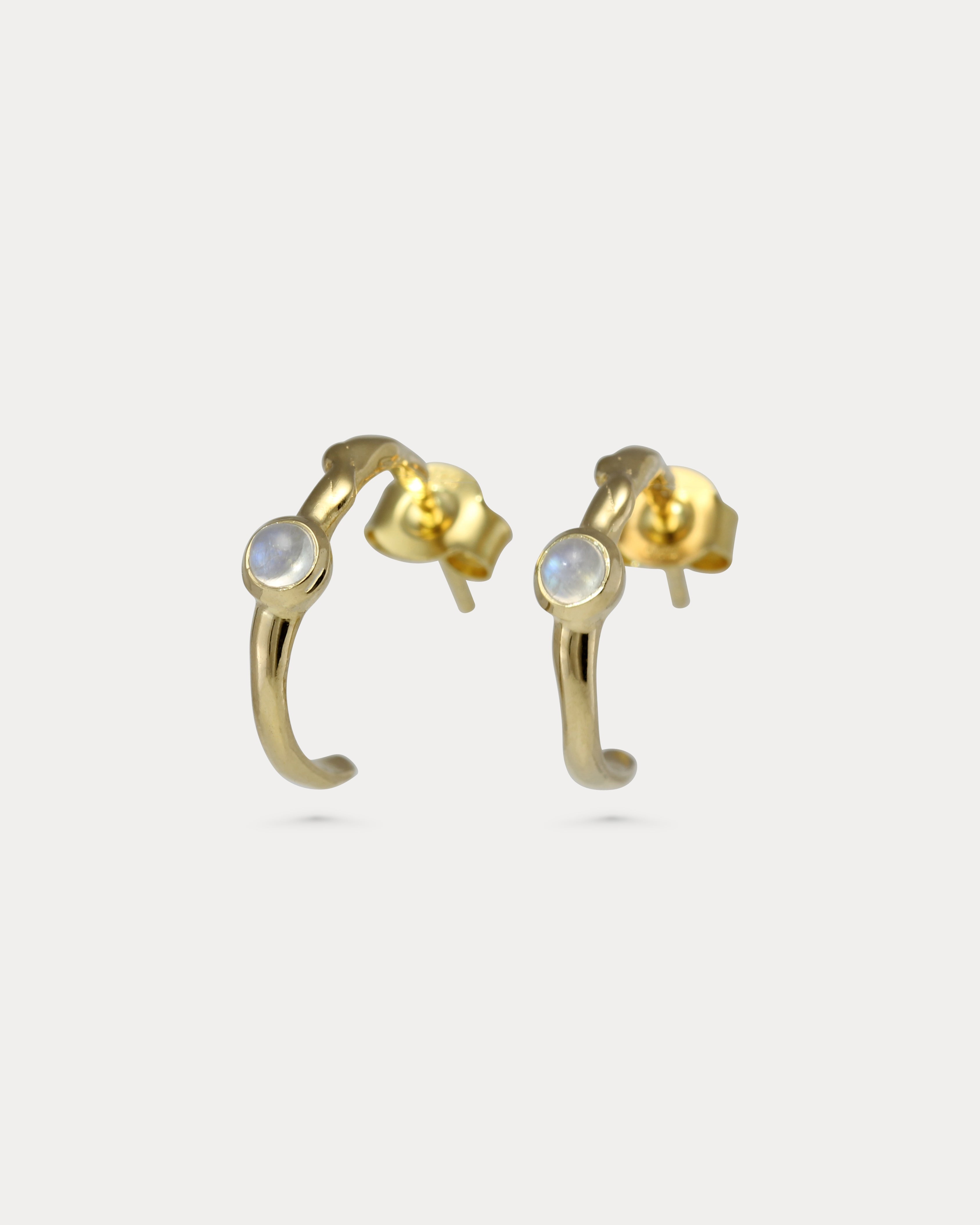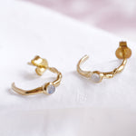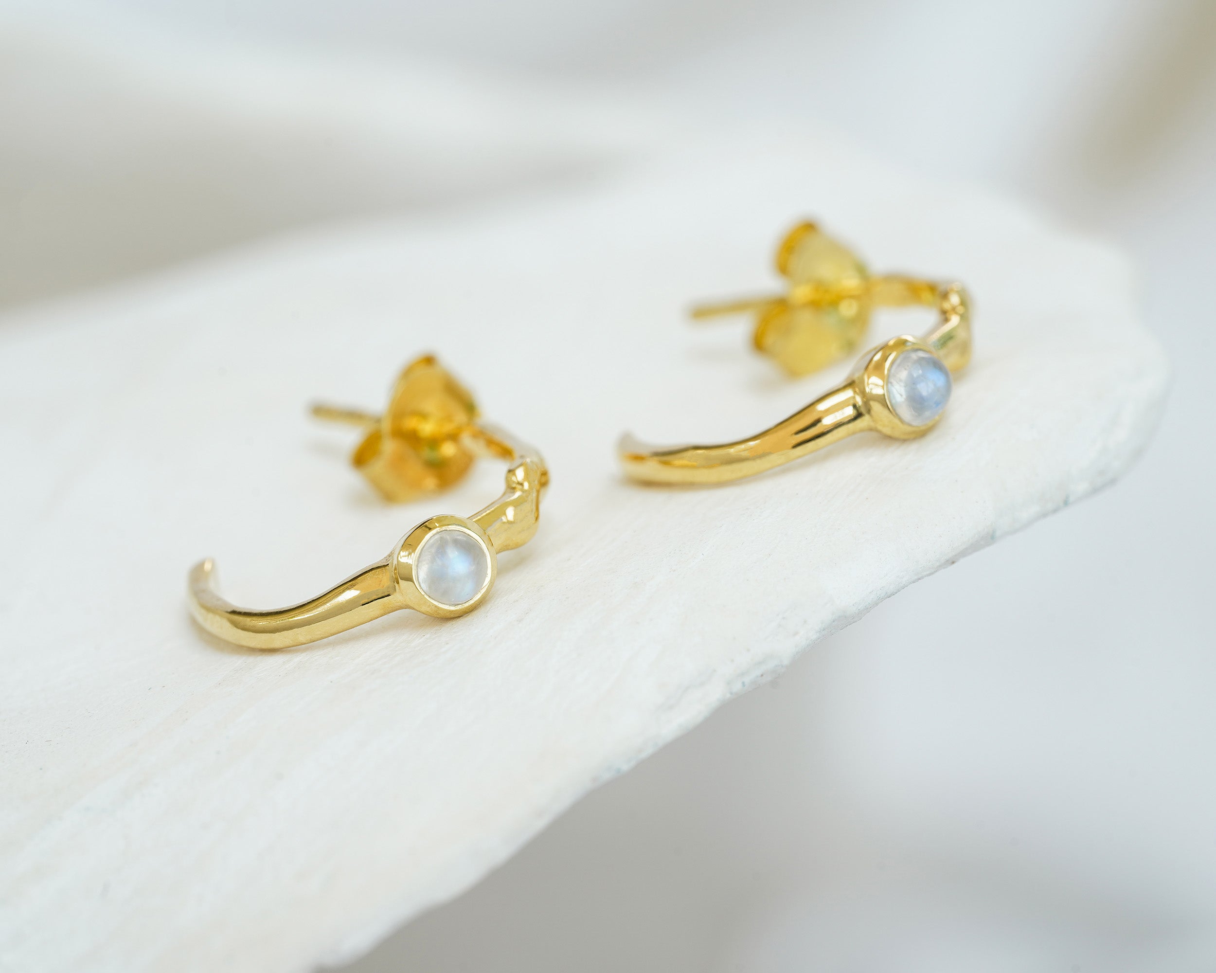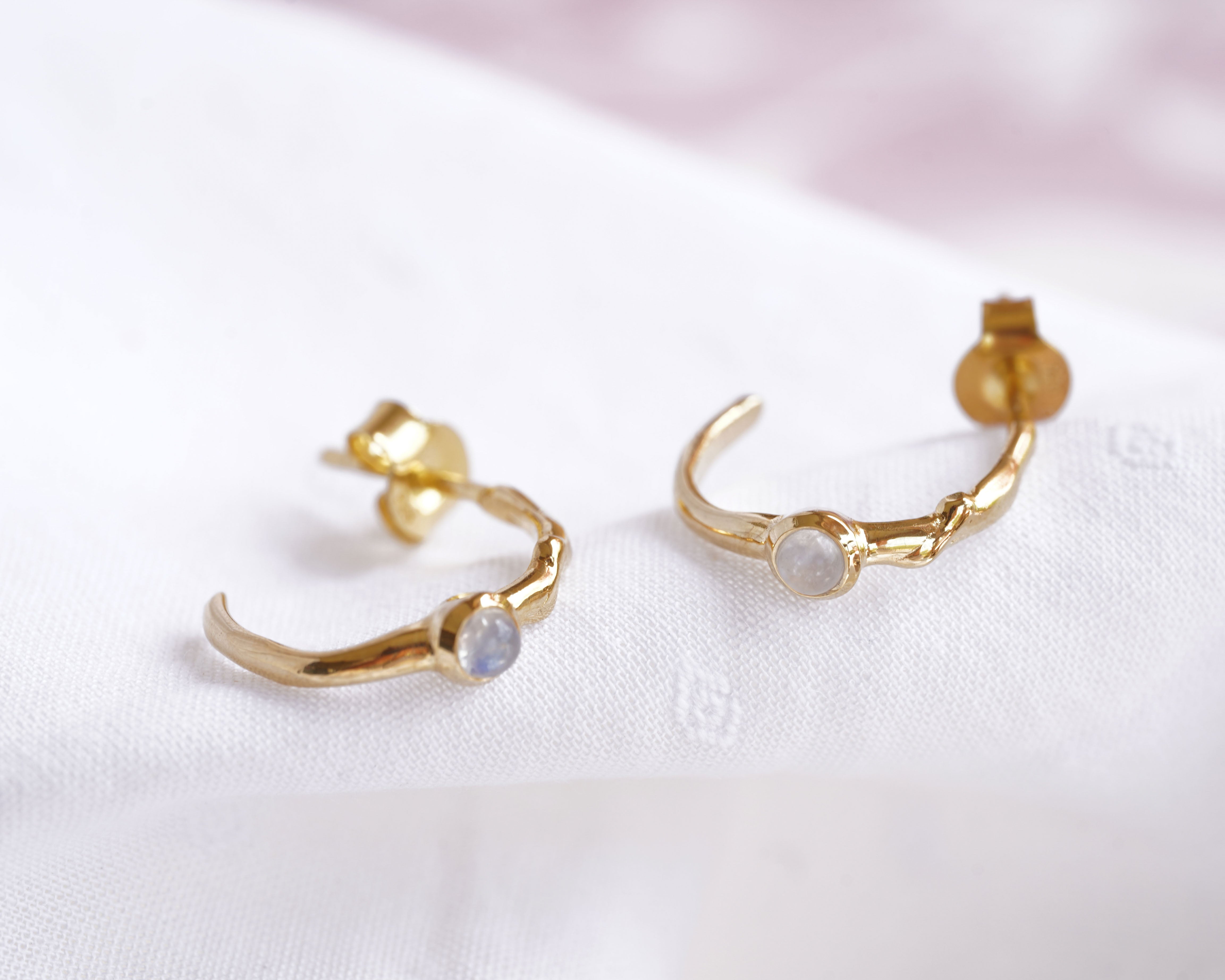 These dainty hoop earrings are set with a tiny Rainbow Moonstone. A fresh twist on the classic 'huggie' hoops, they are perfect for stacking up with your other favourite earrings.