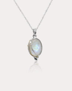 Eye-catching teardrop rainbow moonstone is set in a contemporary design of sterling silver, enhanced with 14kt Gold details to create this statement ring.